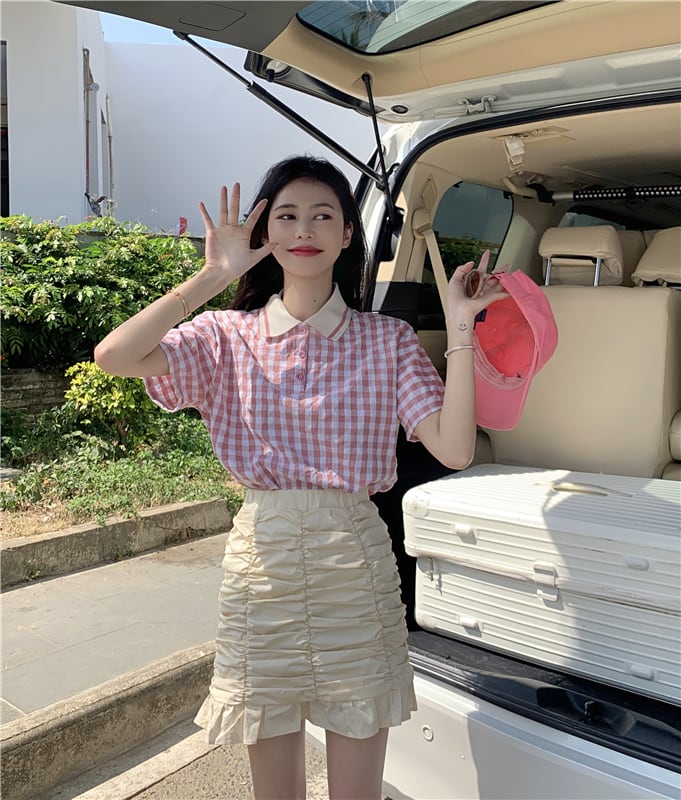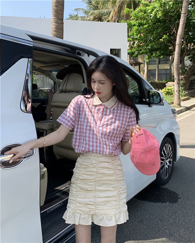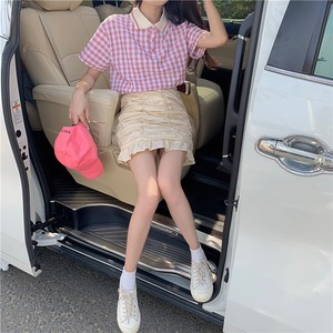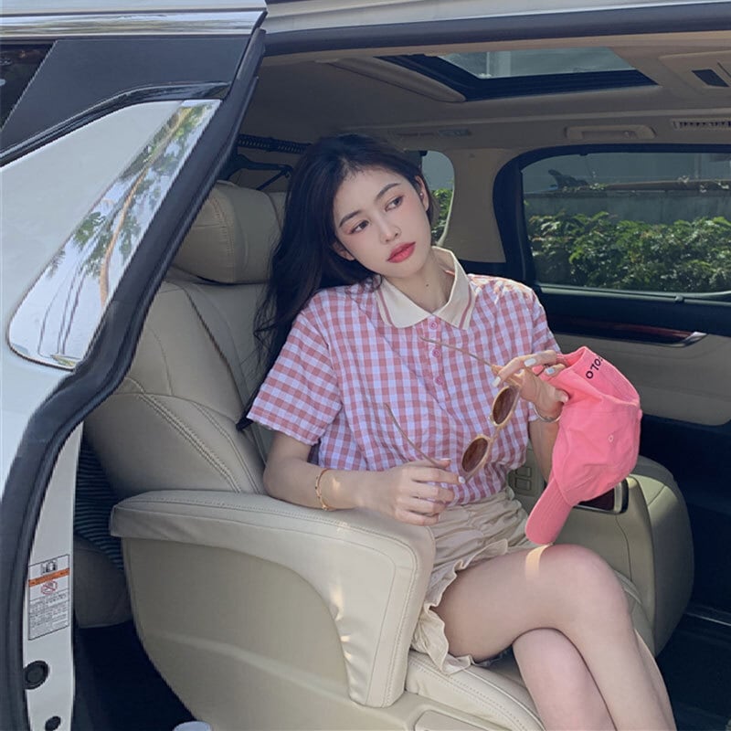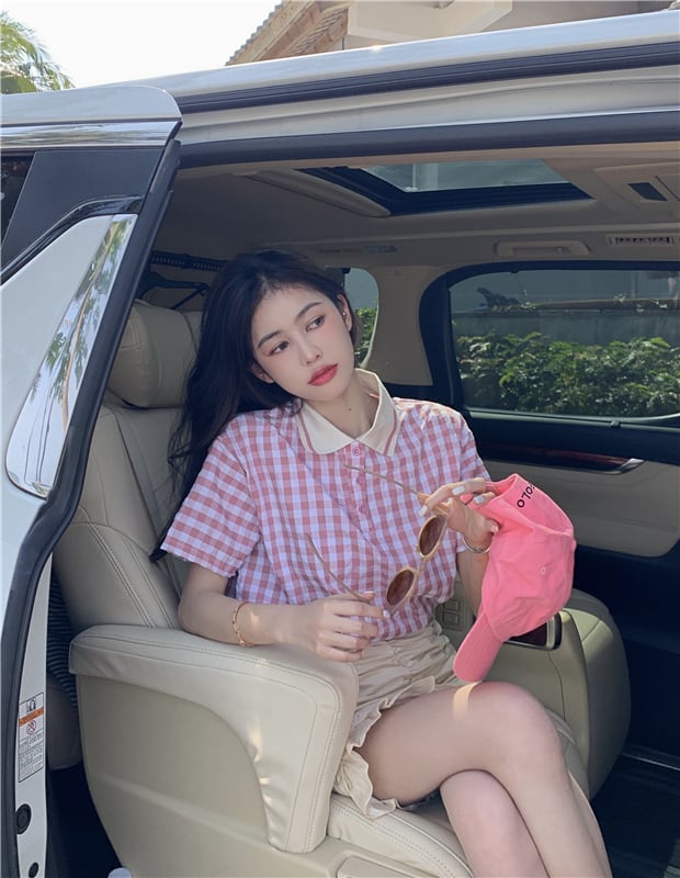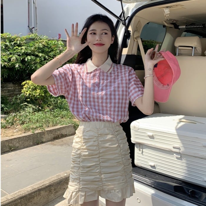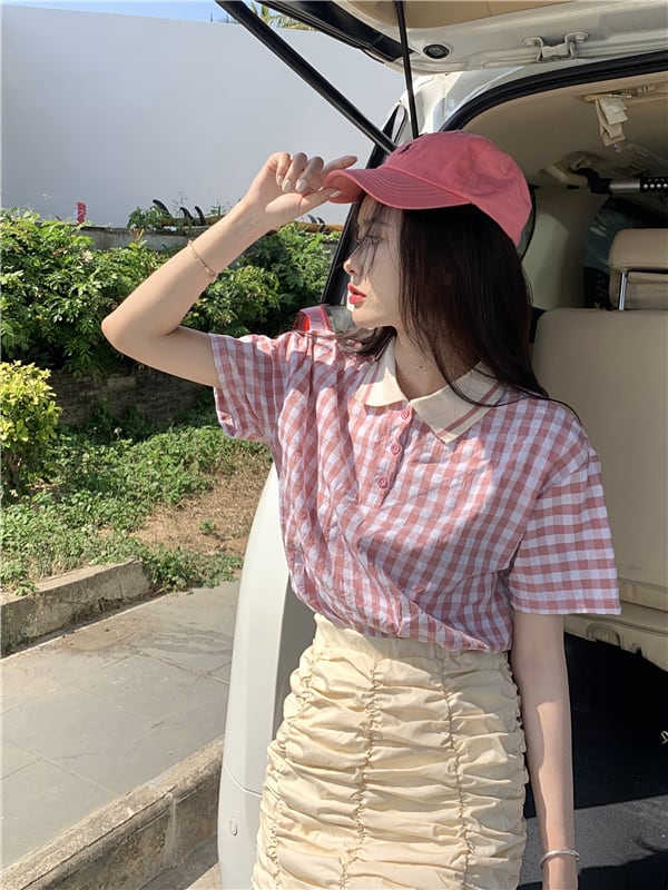 格子柄シャツ サマー薄手トップス ピンク 大人ガーリー スウィート キュート カジュアル 夏物 モンロー74374441927