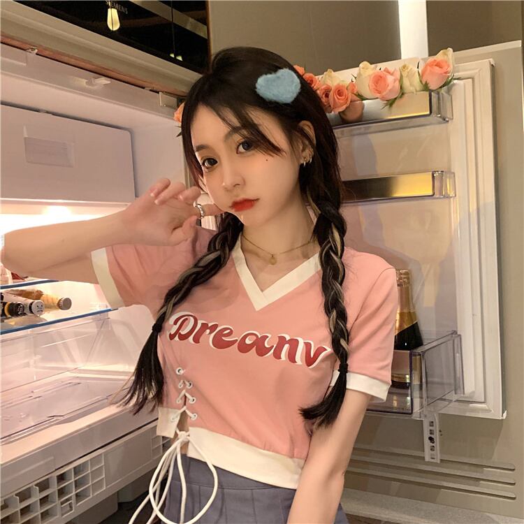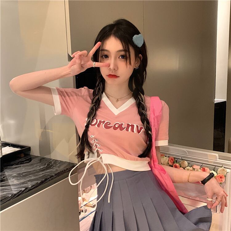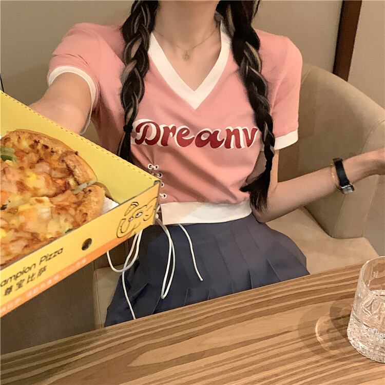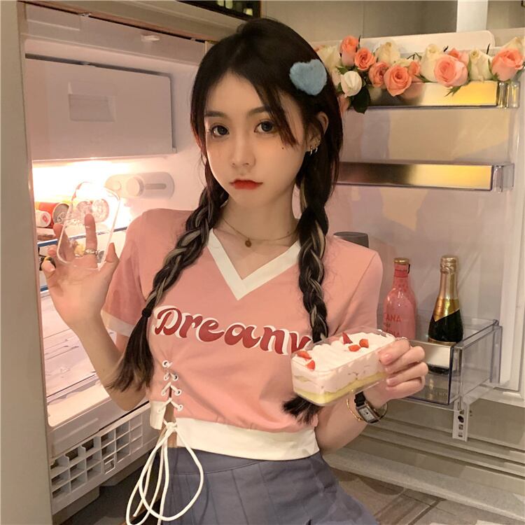 VネックTシャツ ショートサマースリムクロップドトップス ピンク 大人ガーリー スウィート キュート カジュアル 夏物 モンロー93789012395