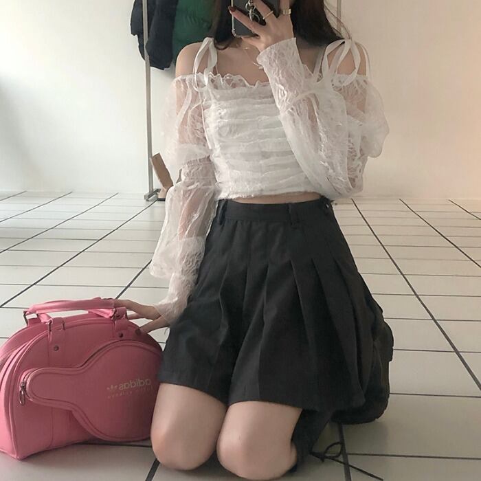ホワイトレースシャツ レディーススプリングスタンダードショートトップス レトロ 春物 モンロー91021463059