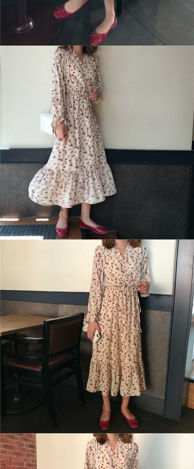 オータムスタイルVネックフローラルドレス ウェストシフォンスカート 秋物 花柄 モンロー2136512