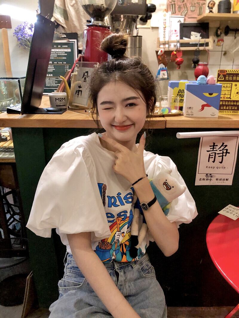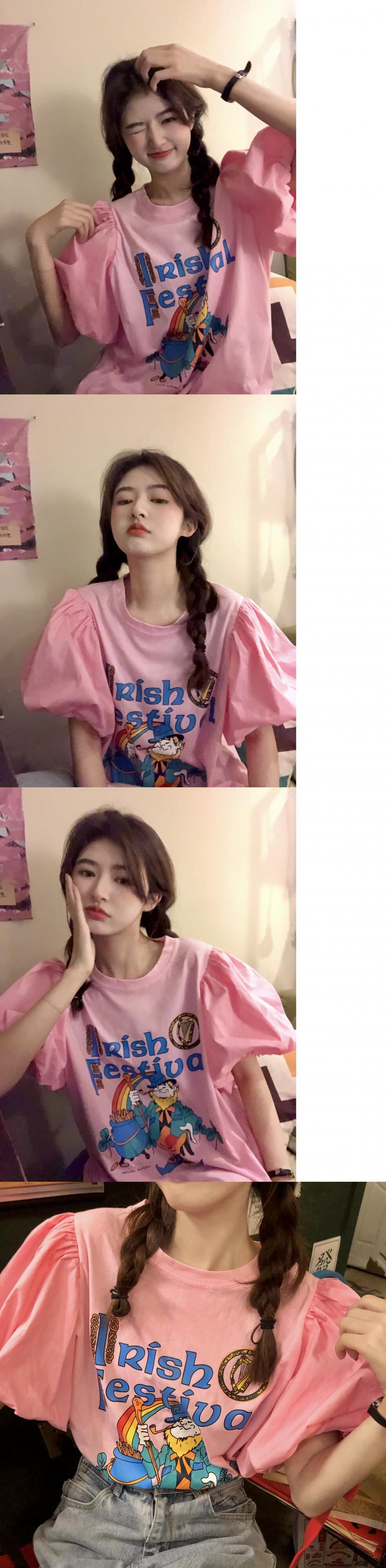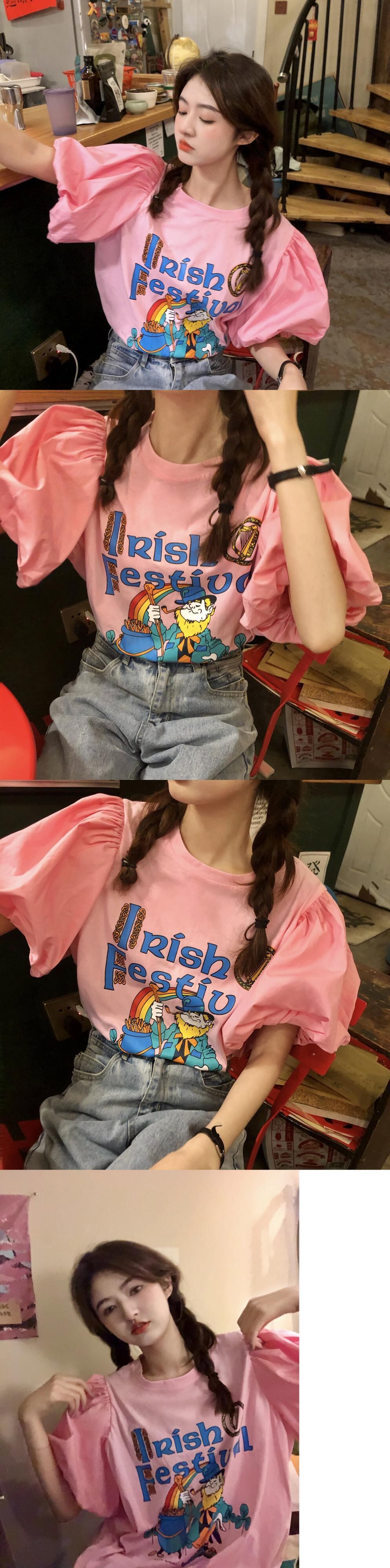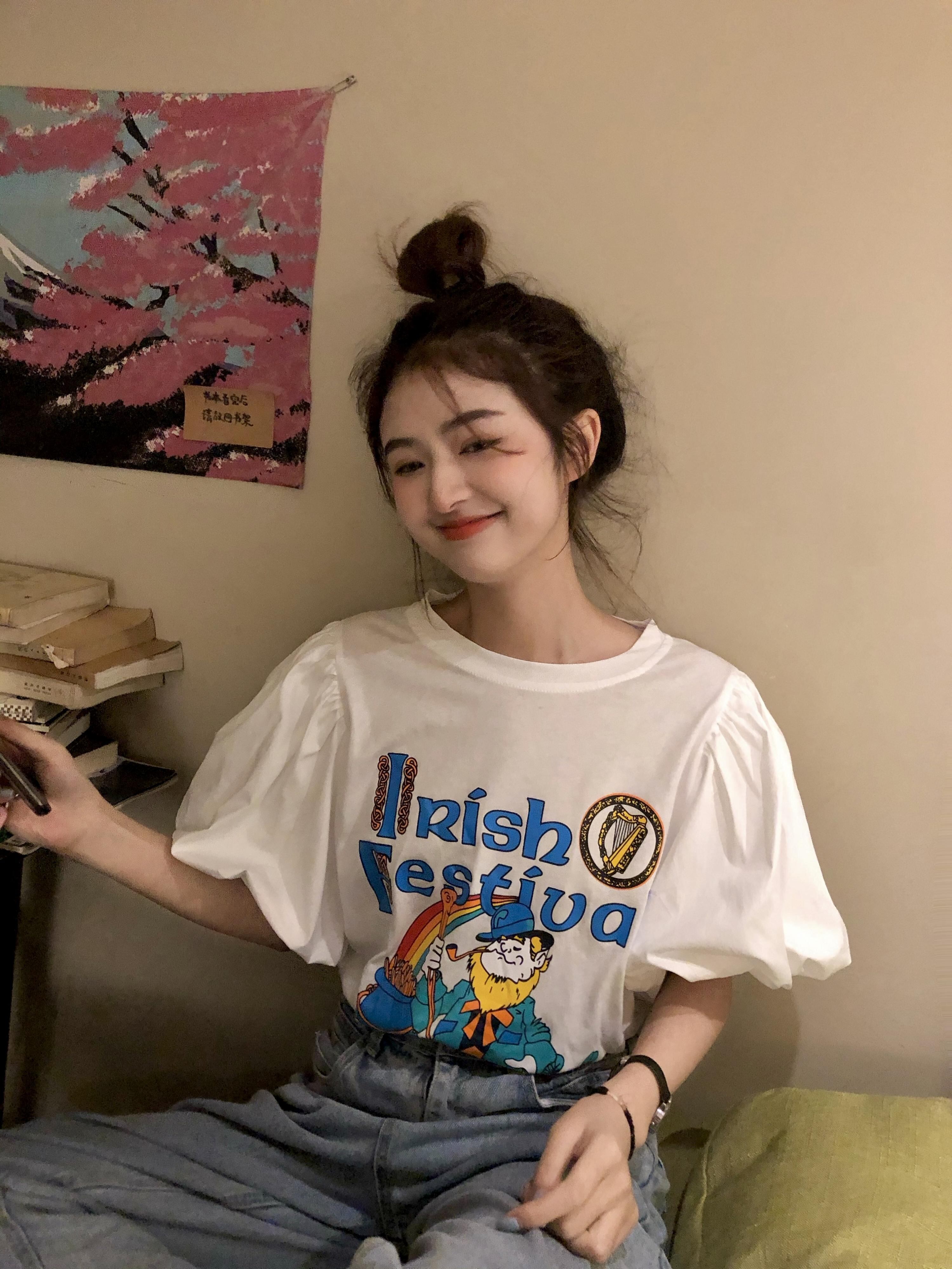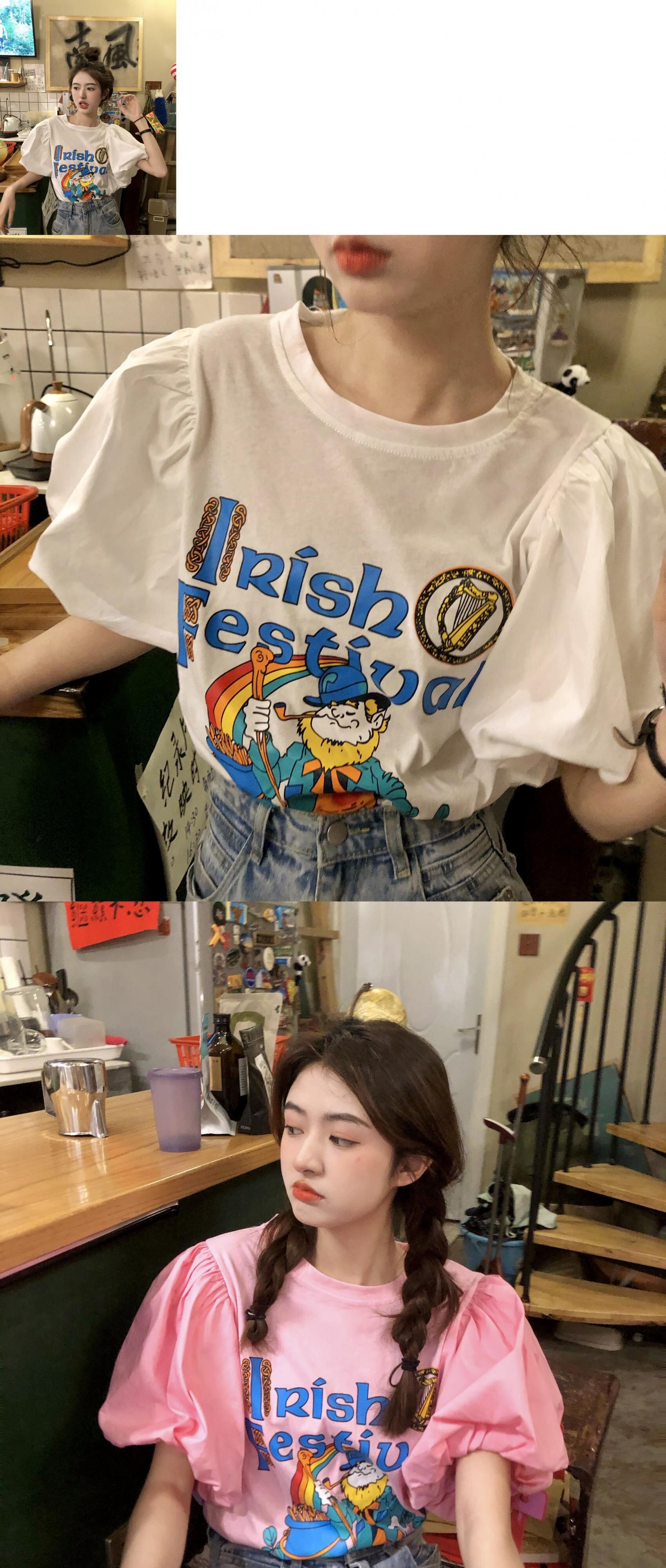 ホワイトプリントスリーブTシャツ サマールーズトップス 夏物 モンロー94197965714