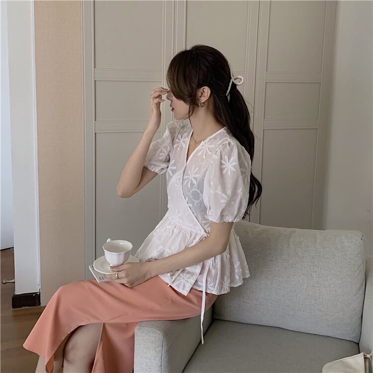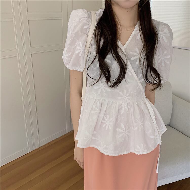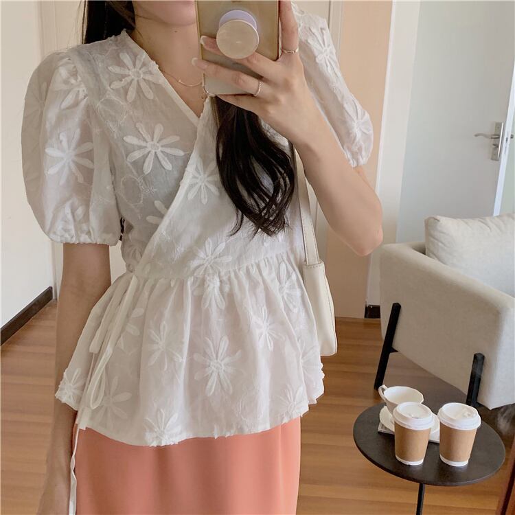 ホワイトVネックシャツ レースサマートップス 大人ガーリー スウィート キュート カジュアル 夏物 モンロー12704188507