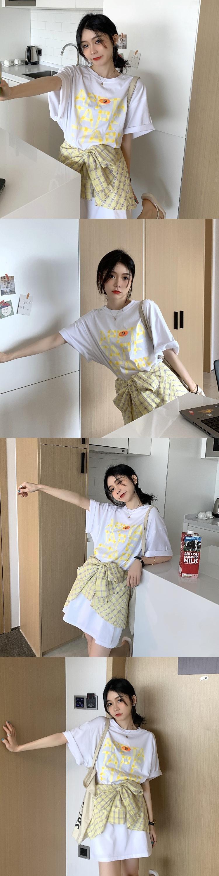色:イエロープリントTシャツ,ブループリントTシャツ,青い格子縞のエプロン,黄色の格子縞のエプロン
