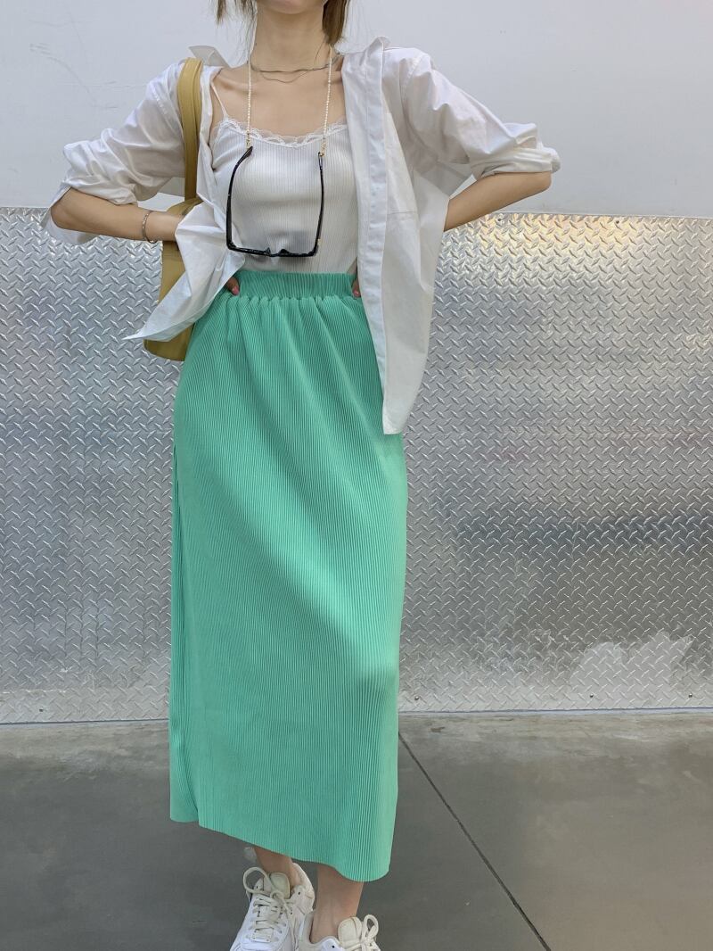 色:白のシャツ,ホワイトサスペンダー,緑のスカート