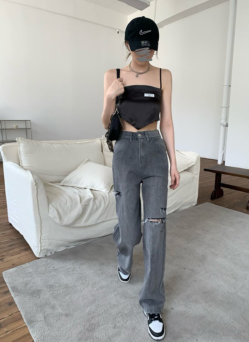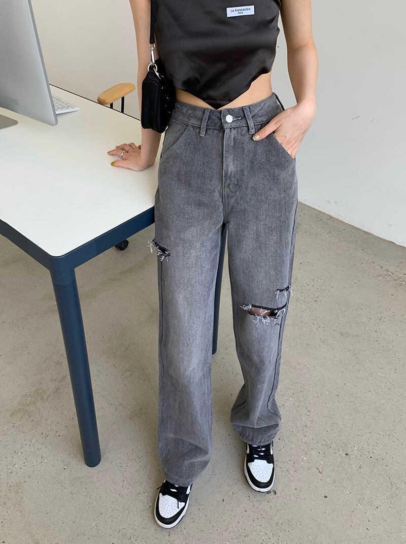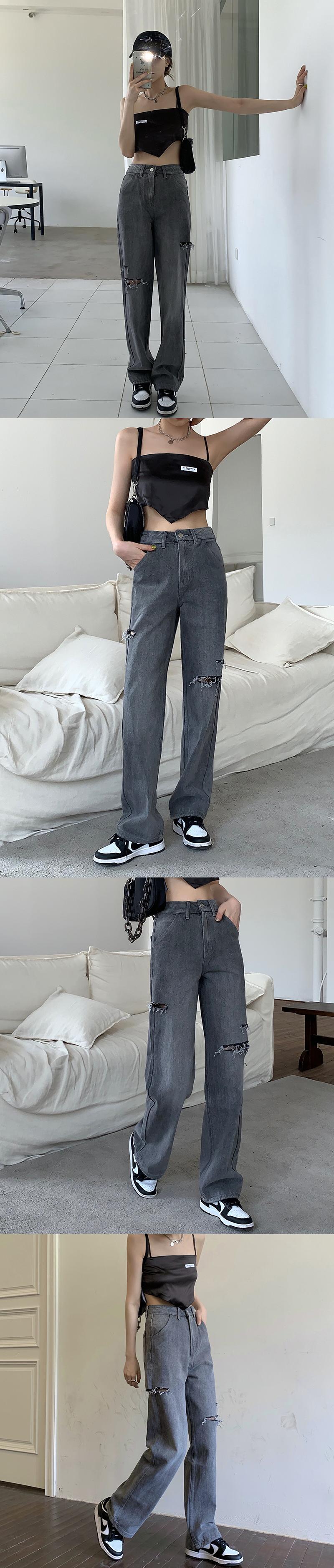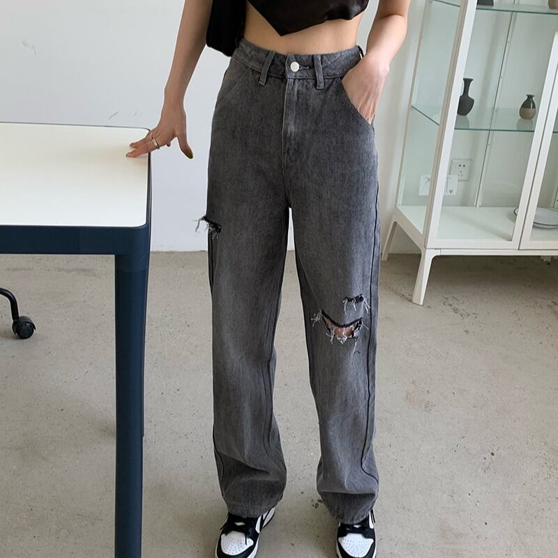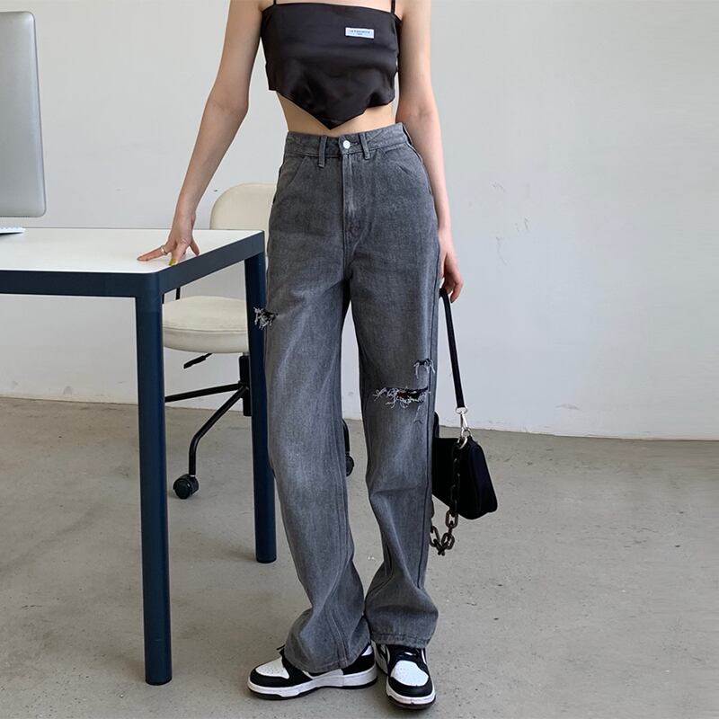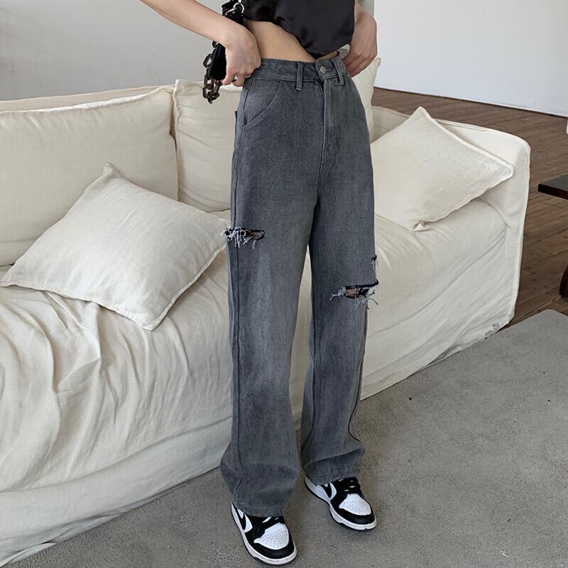 グレーハイウェストウェスト薄手ジーンズ サマールーズワイドレッグパンツ 夏物 ワイドパンツ モンロー5506271555