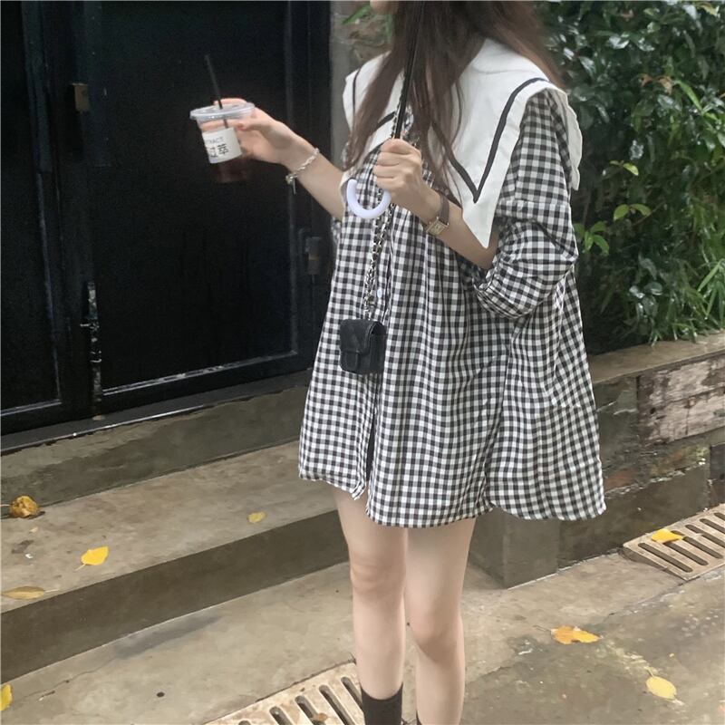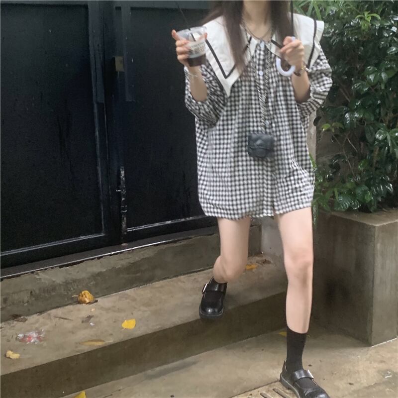 ネイビーカラー格子柄シャツ サマートップス 大人ガーリー スウィート キュート カジュアル 夏物 モンロー59439714702