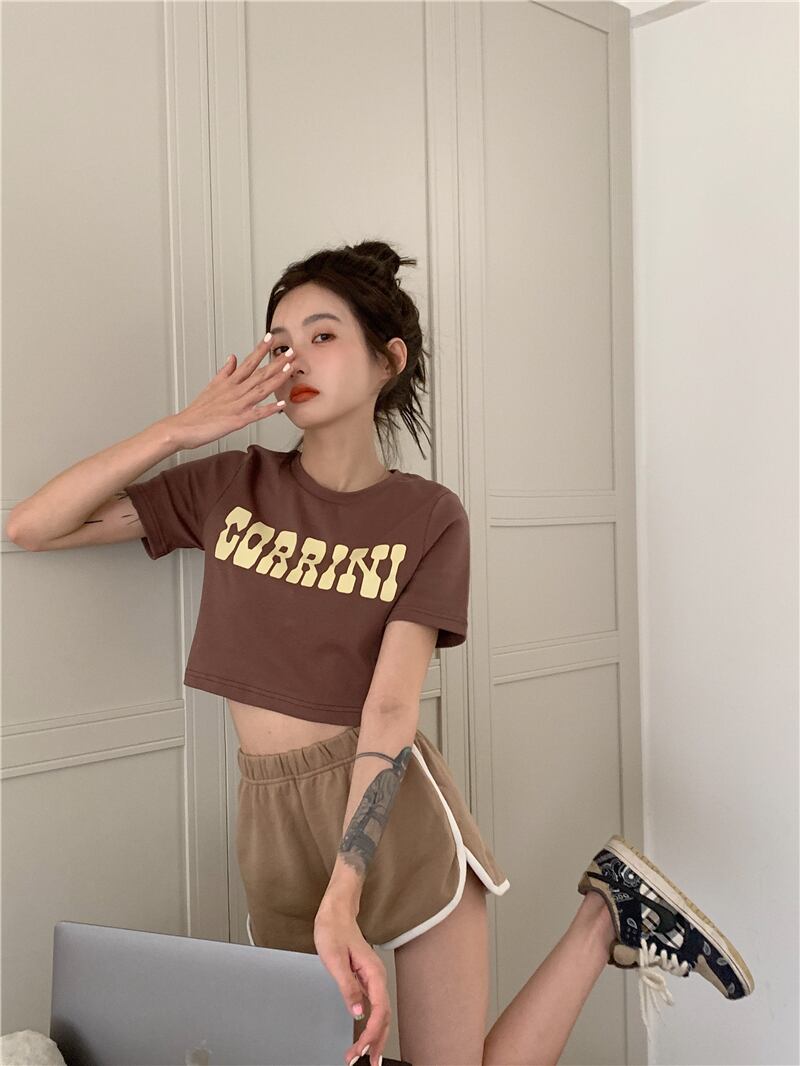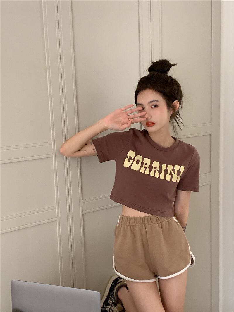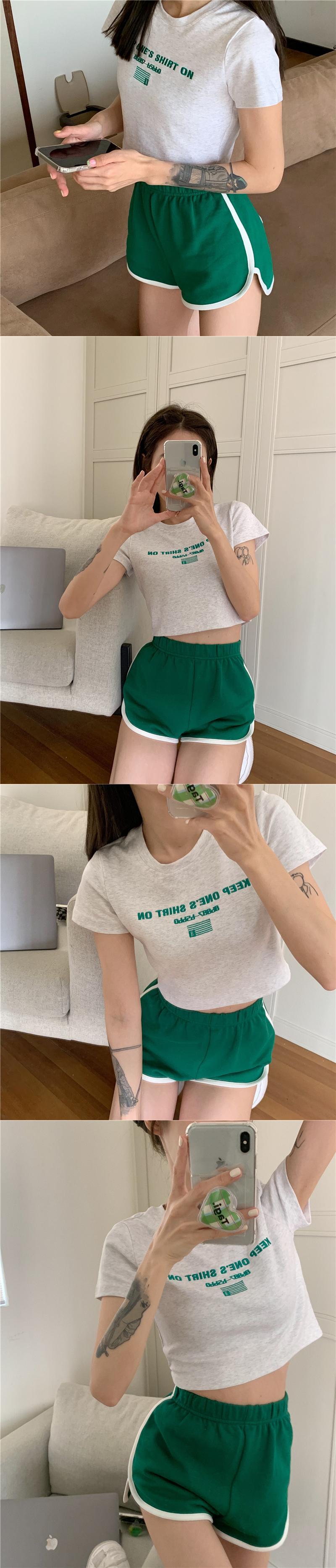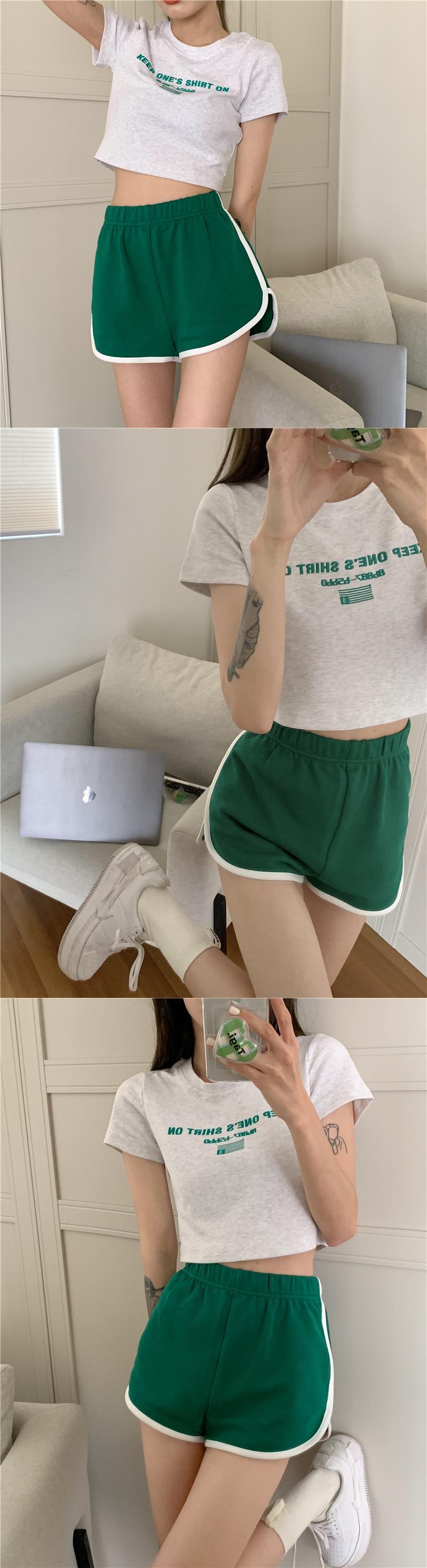 色:ライトグレーのTシャツ,コーヒー色のTシャツ,レトロなグリーンのショートパンツ,ライトカーキショーツ