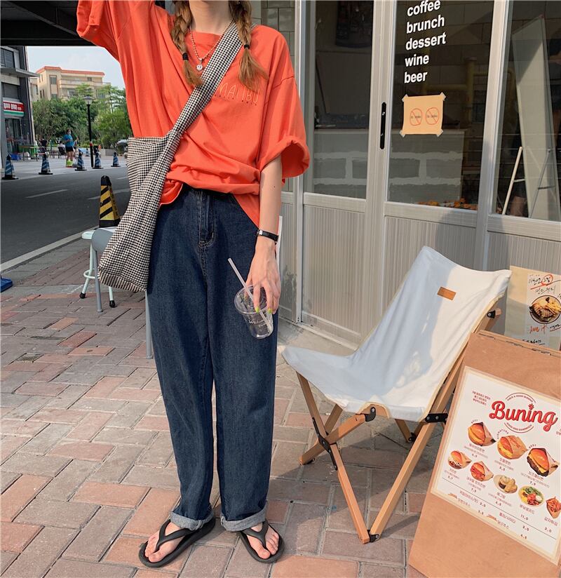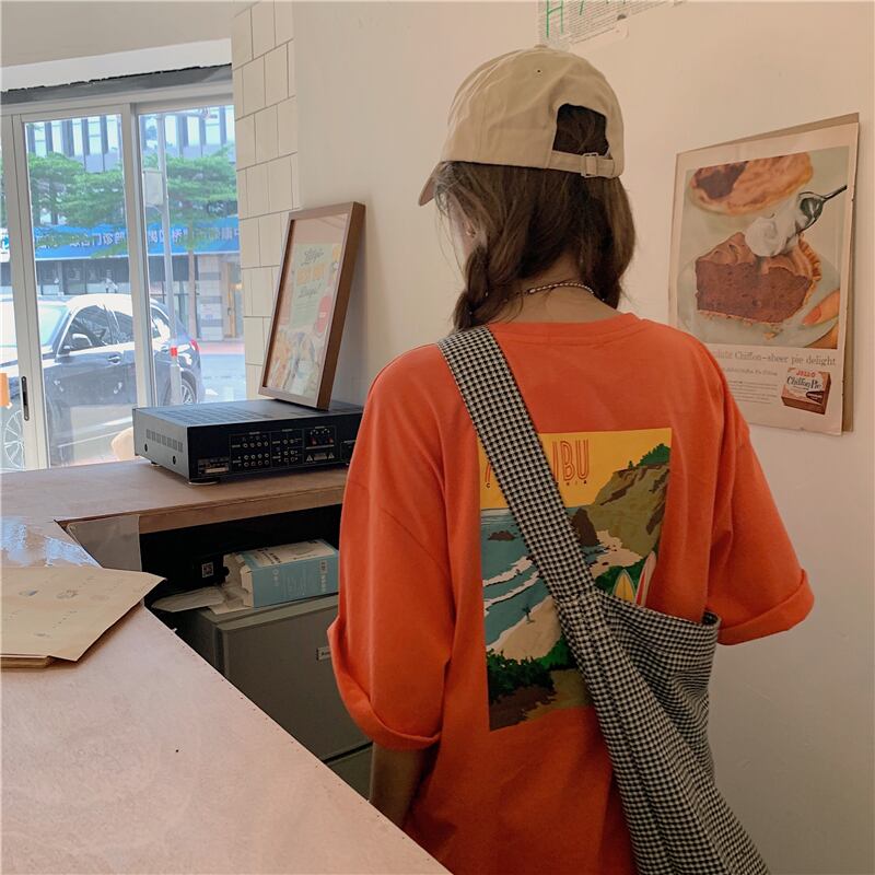 オレンジレッドルーズプリント柄Tシャツ 薄手サマートップス 夏物 モンロー45634145459