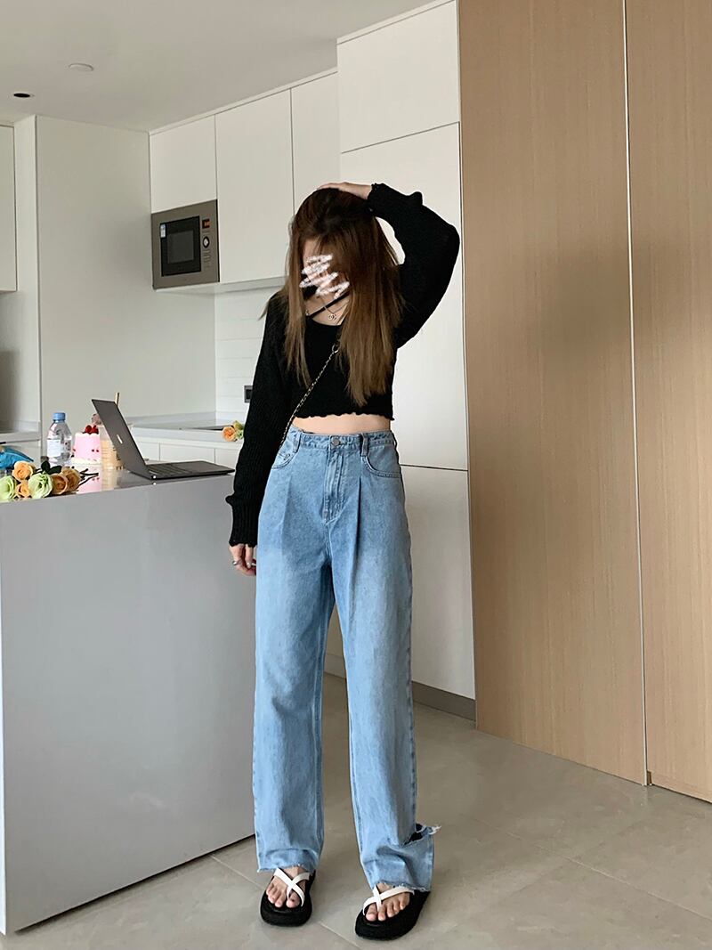 ブルーハイウェストウェストジーンズ サマー薄手ルーズパンツ 夏物 モンロー83549334154