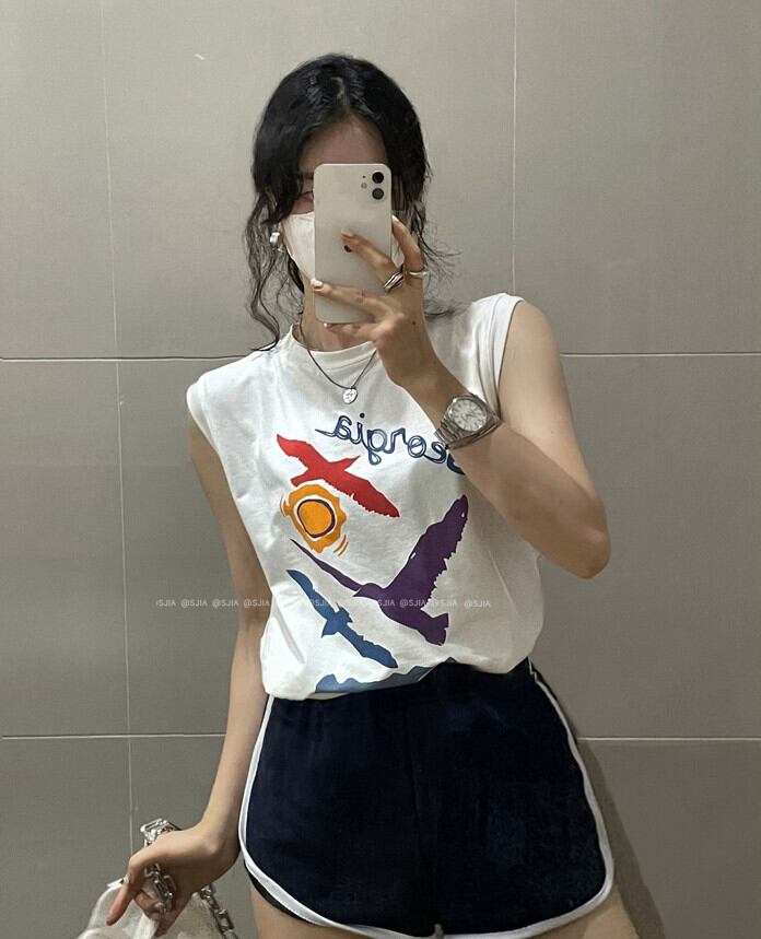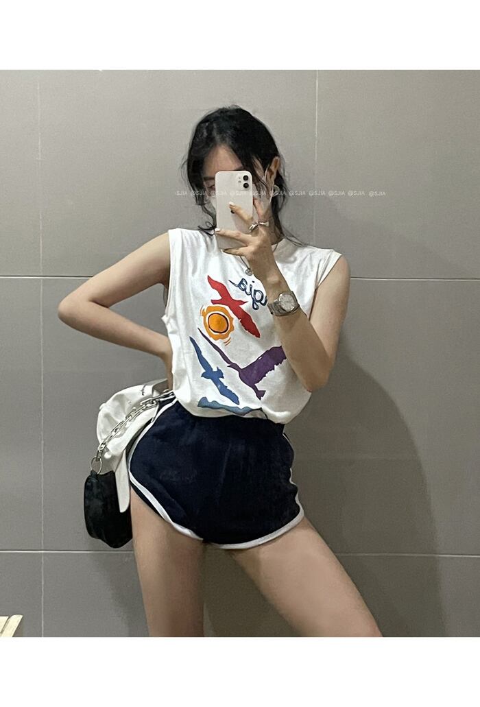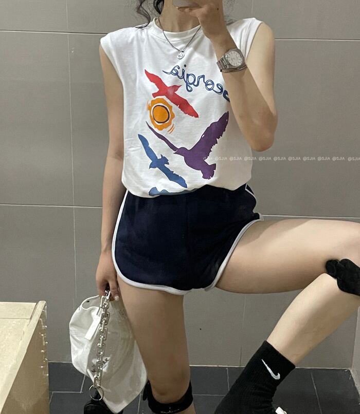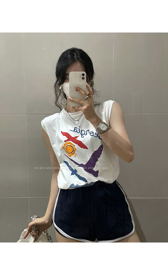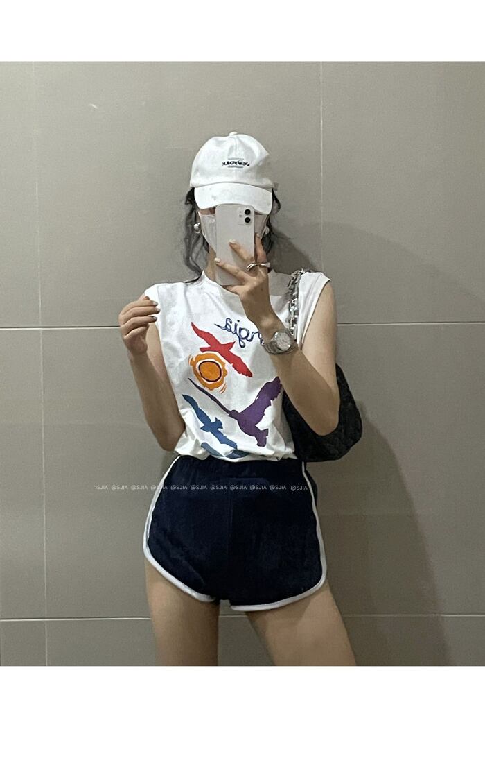 色:白いノースリーブ,ダークブルーのショートパンツ