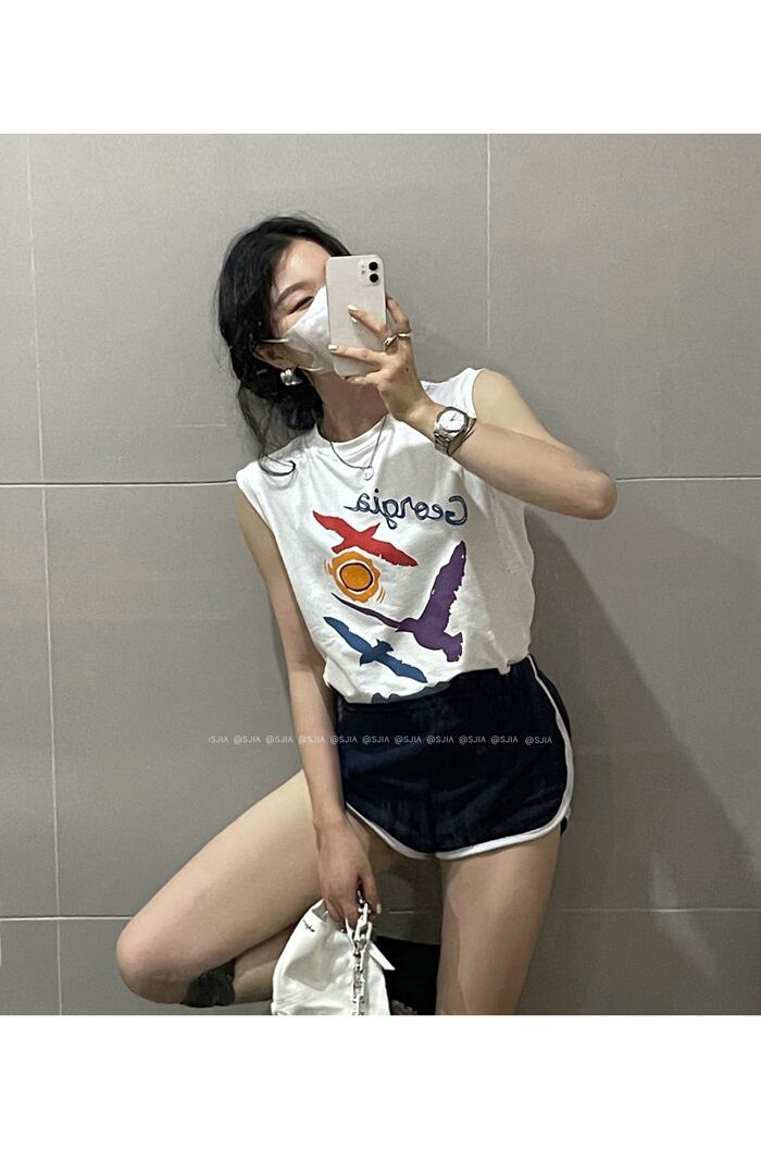 スタンダードプリント柄ノースリーブTシャツ サマールーズカジュアルトップス レトロ 夏物 モンロー83794997389