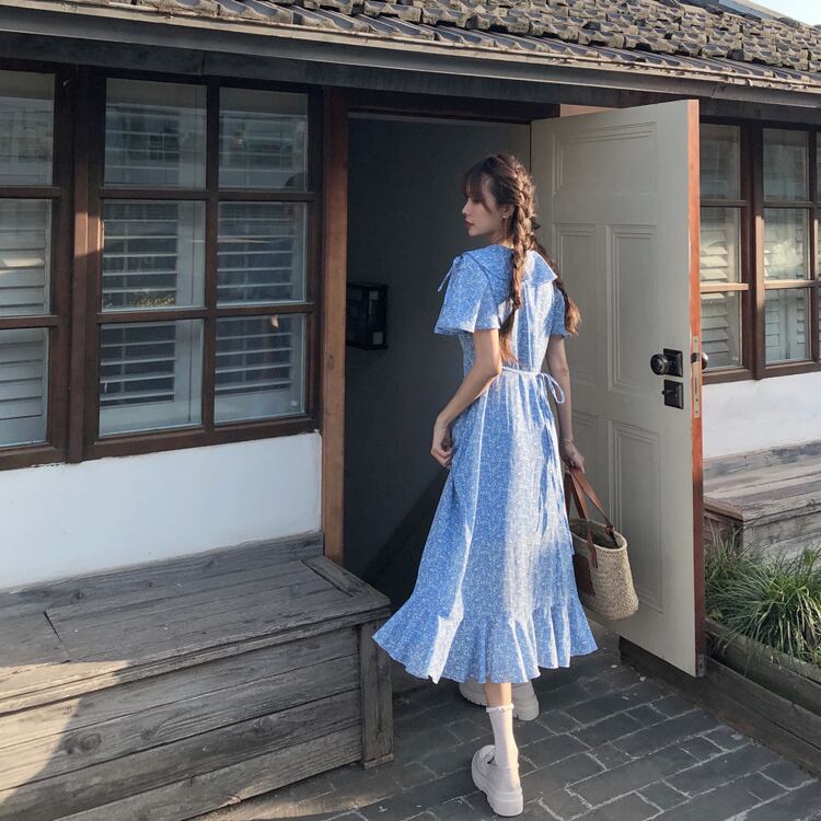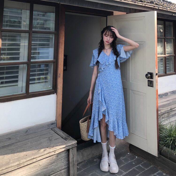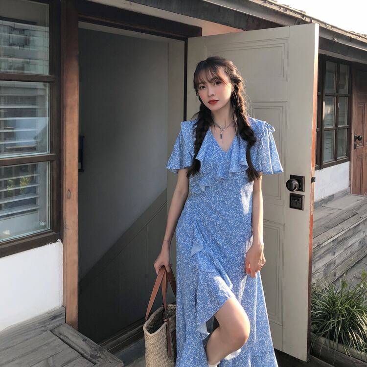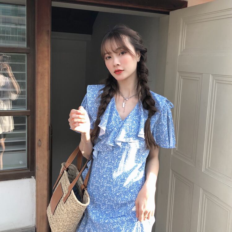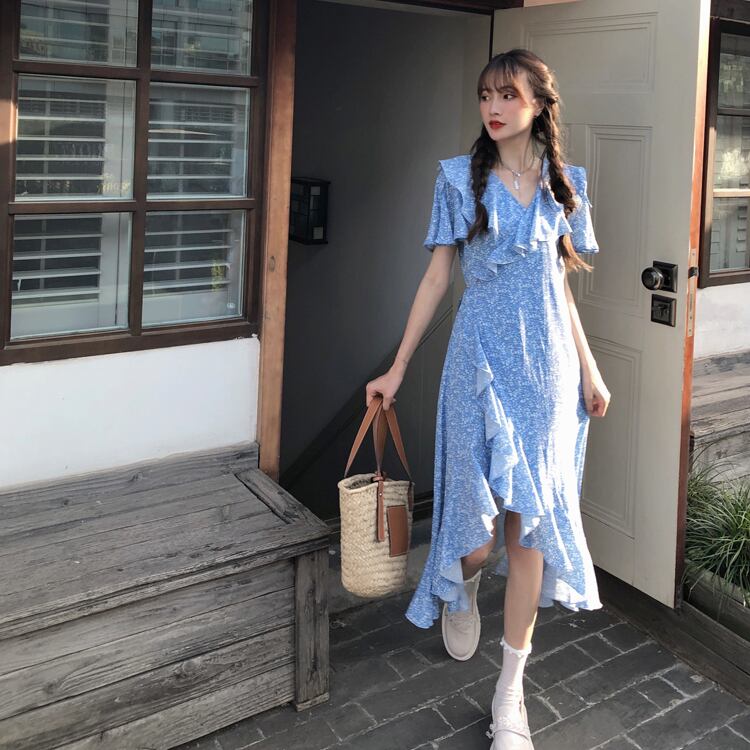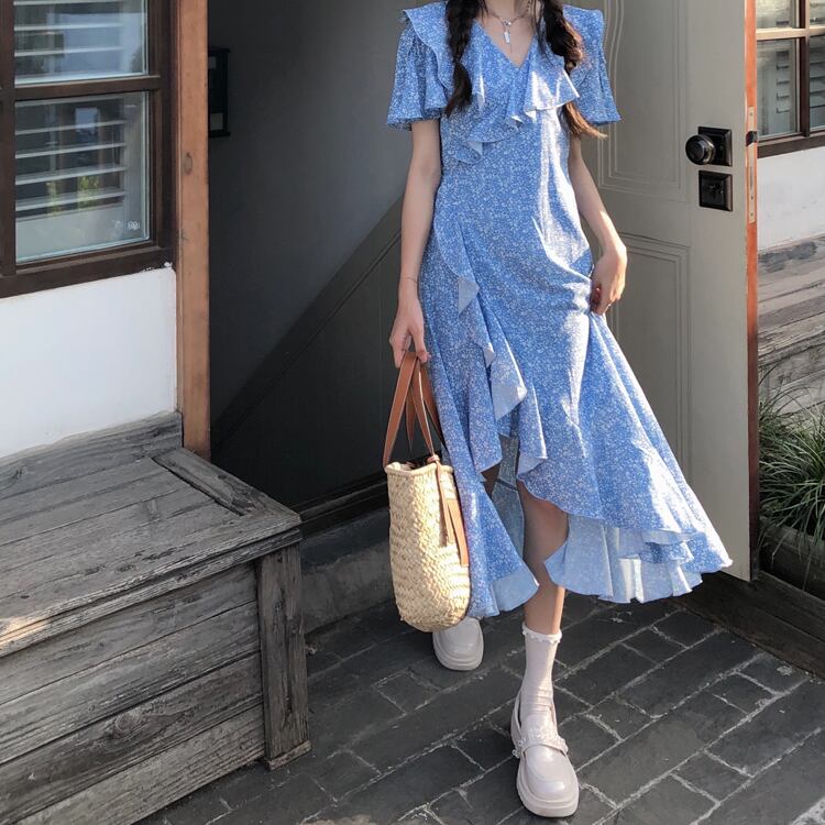 ブルーフローラルウェストVネックドレス スカート サマーロング 大人ガーリー スウィート キュート カジュアル 夏物 花柄 モンロー69536057060