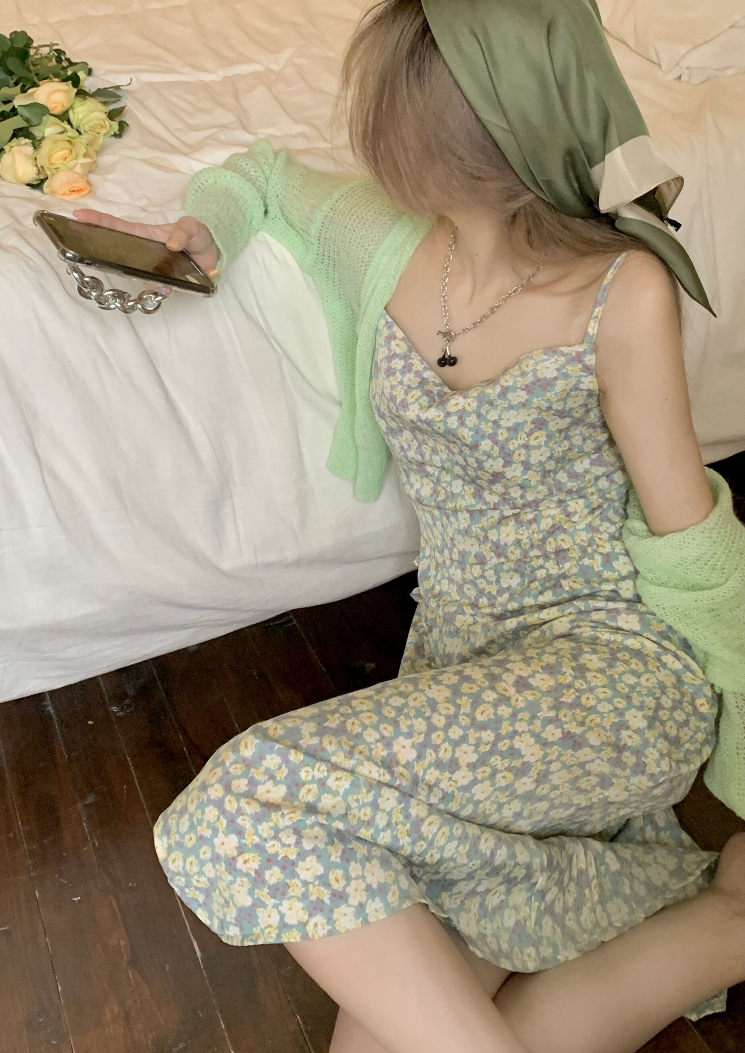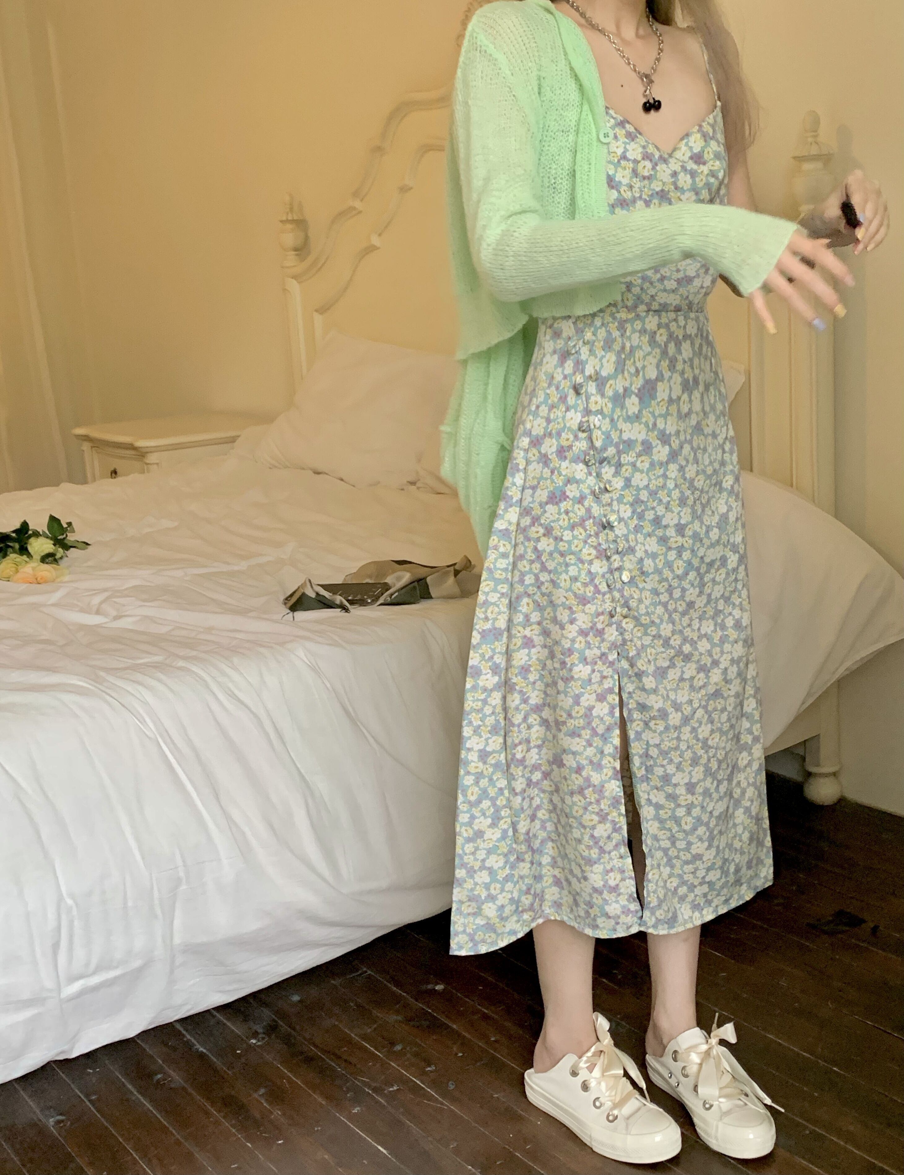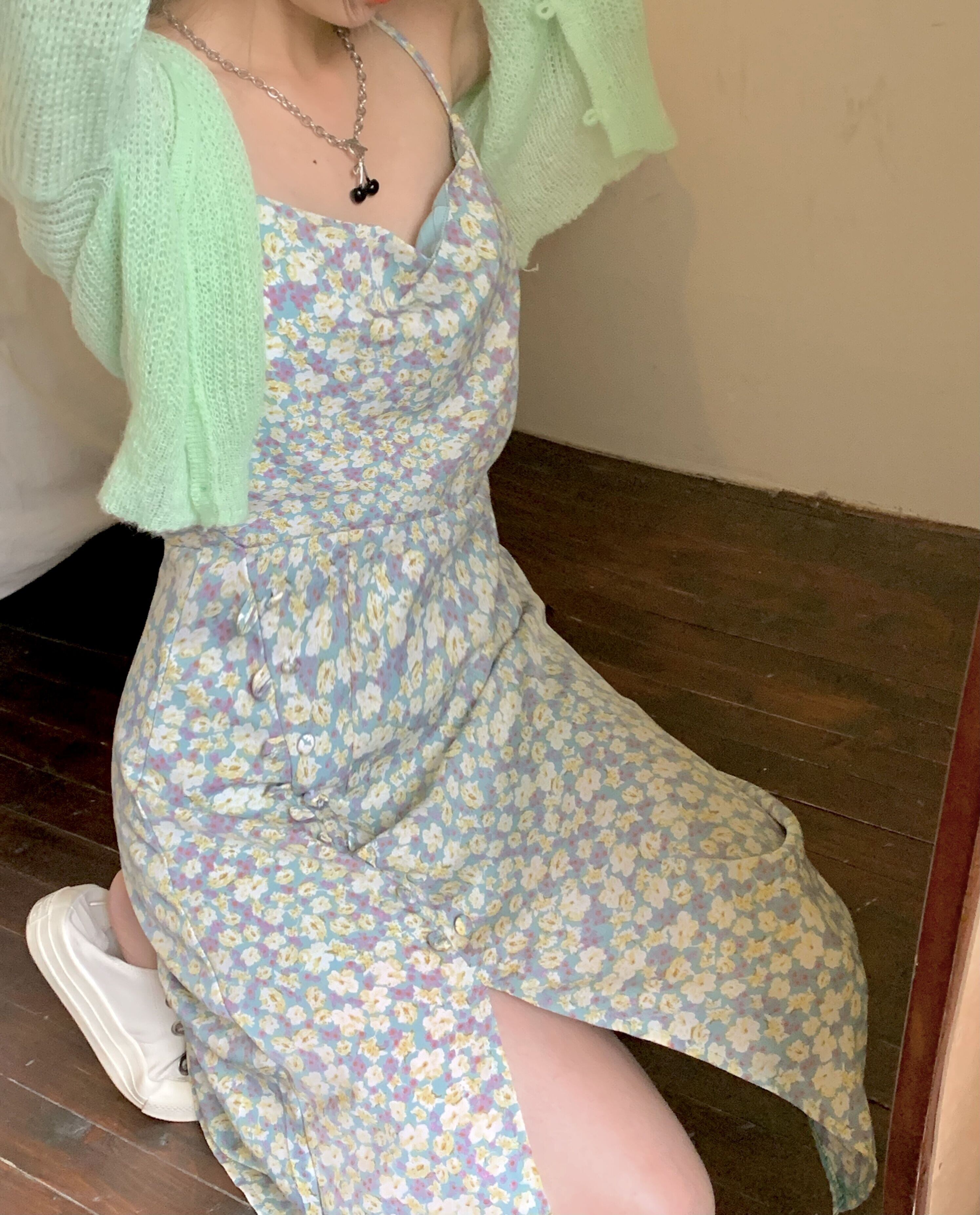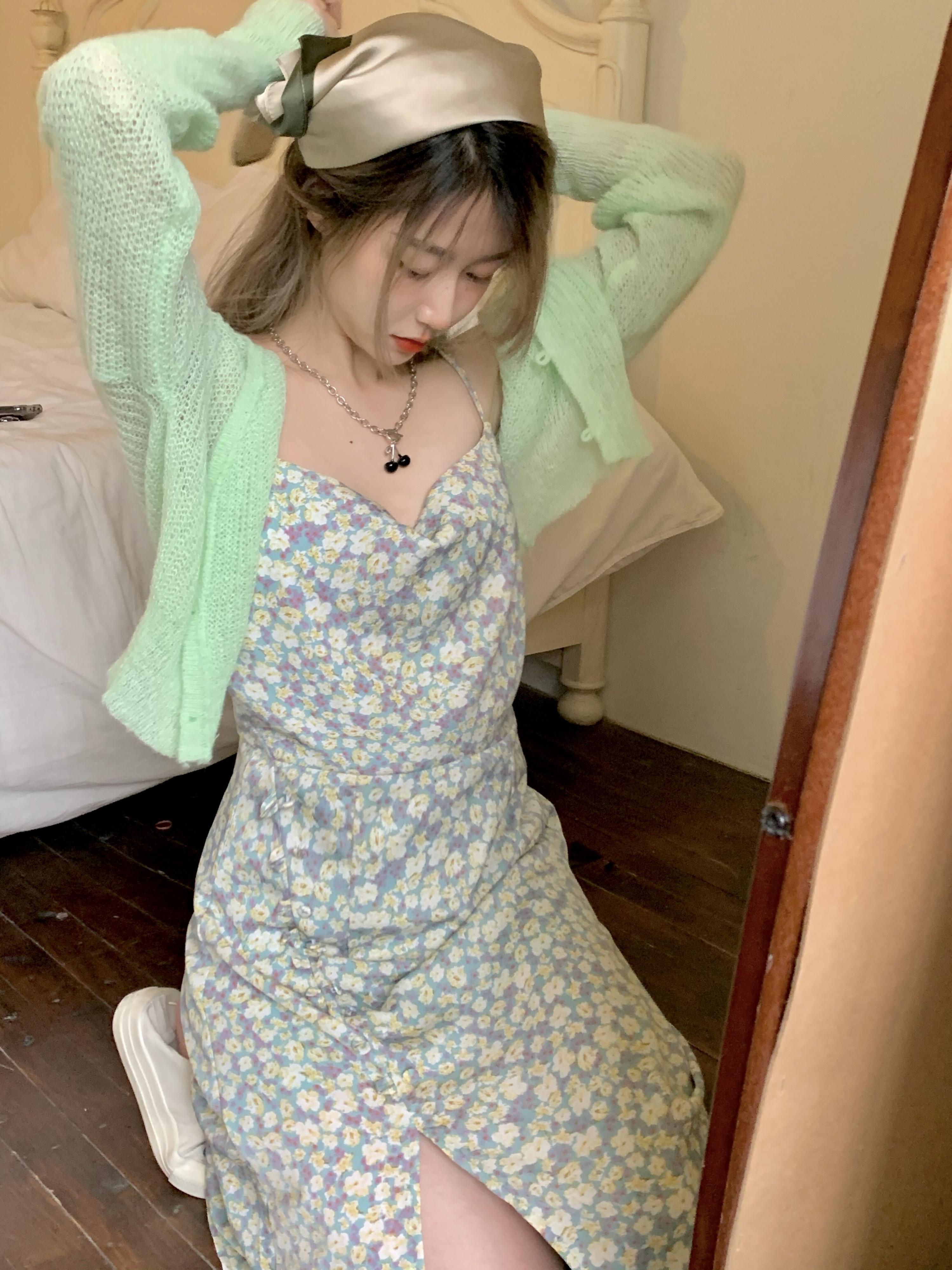 色:グリーンカーディガン,グリーンスリングティーブレイクドレス