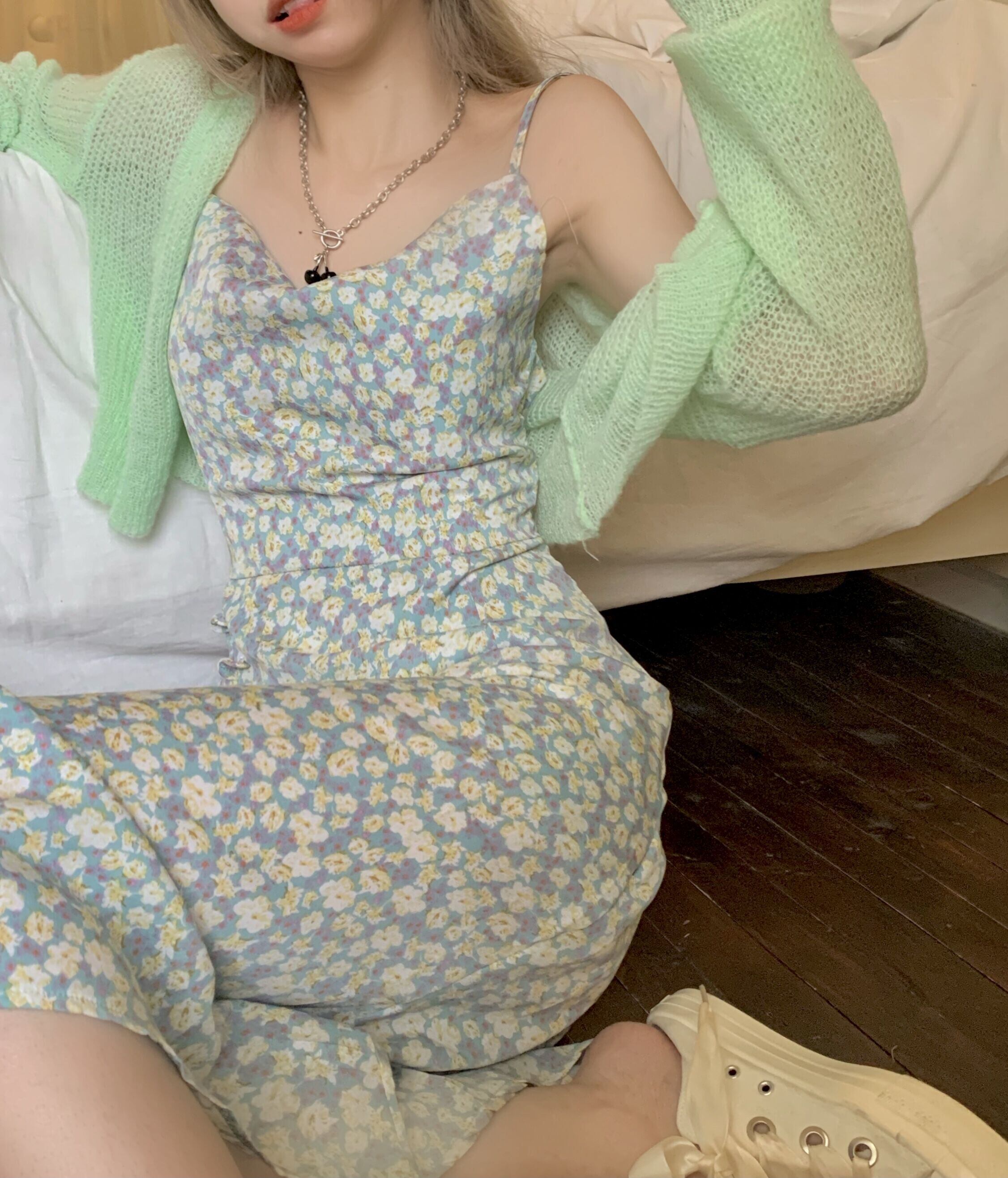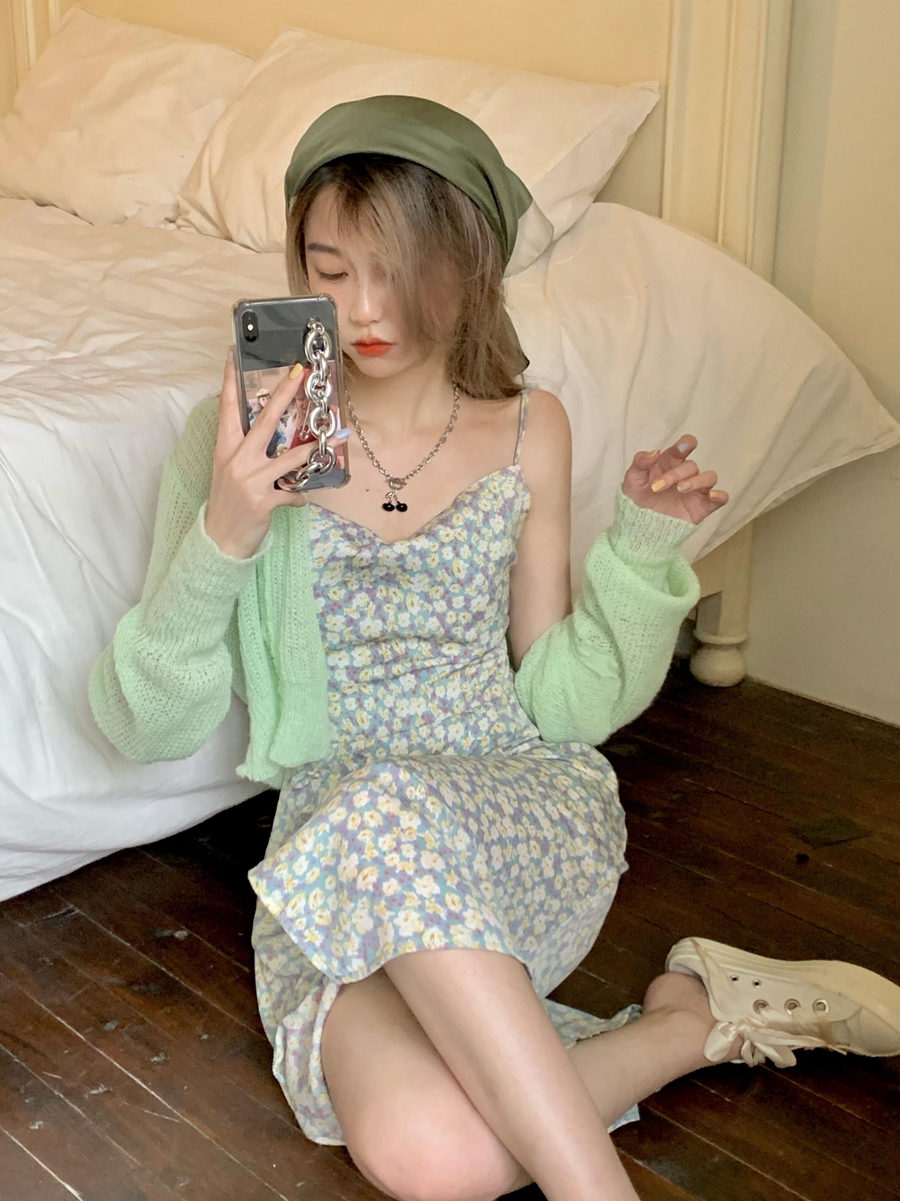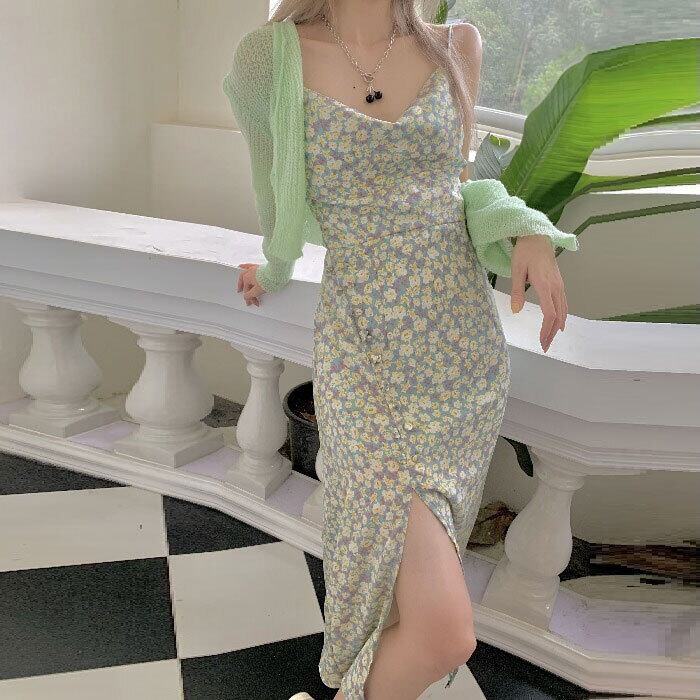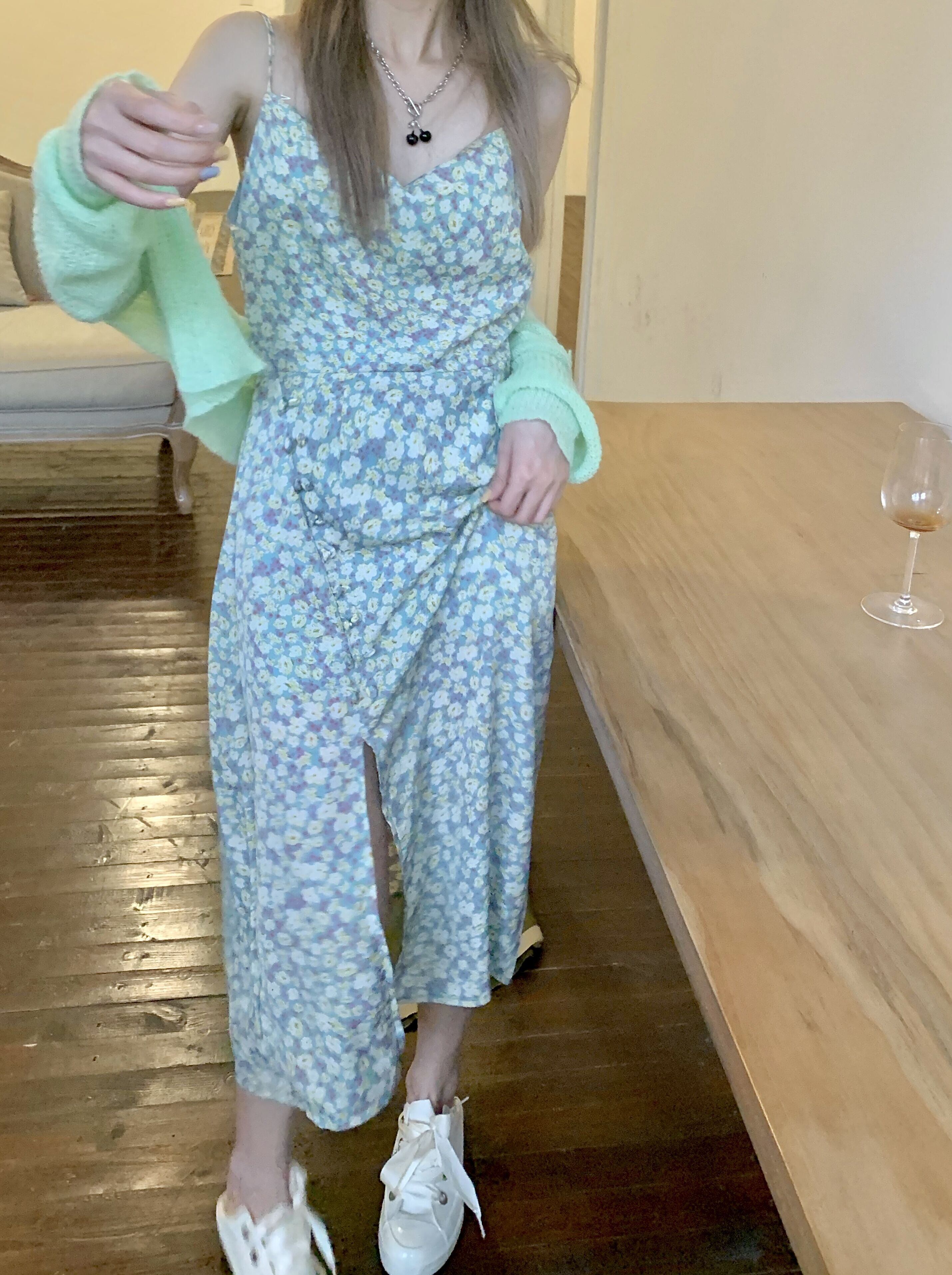 色:グリーンカーディガン,グリーンスリングティーブレイクドレス