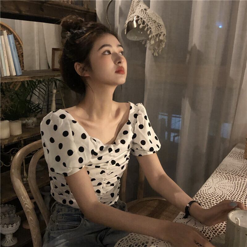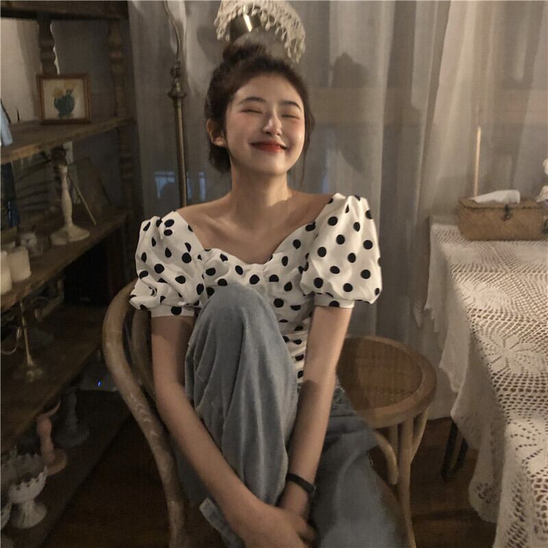 水玉シャツ サマーショート半袖スリーブカラートップス ハーフスリーブ 大人ガーリー スウィート キュート カジュアル 夏物 スクウェア モンロー9672473736
