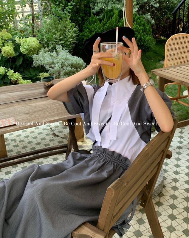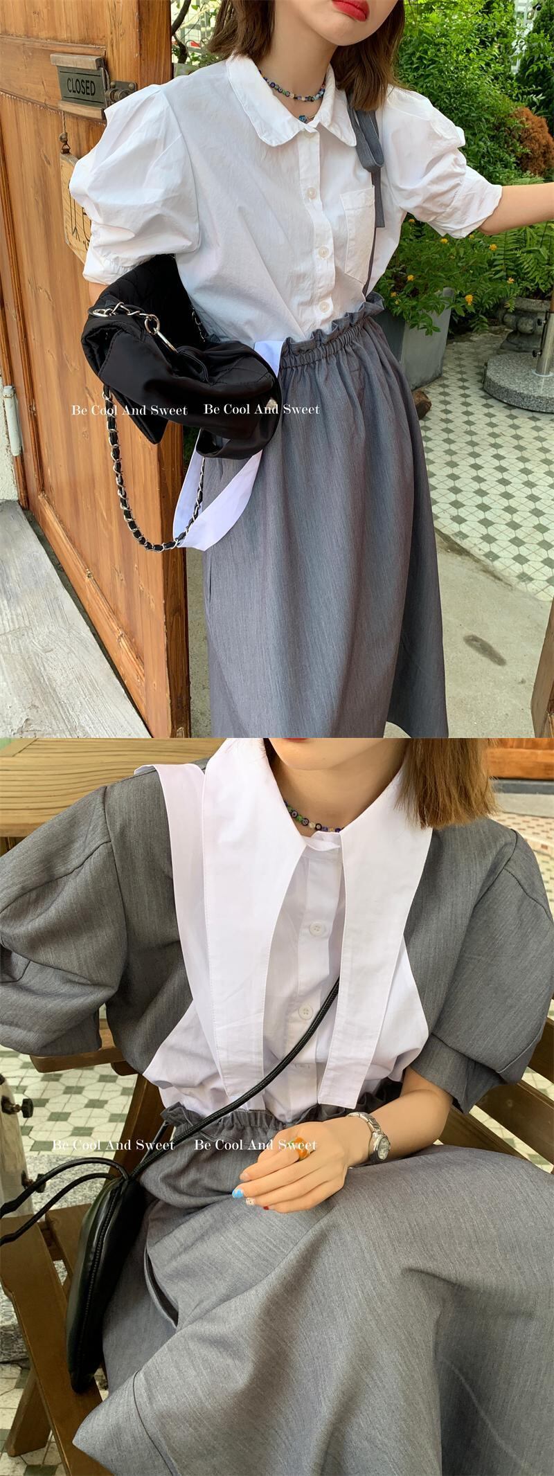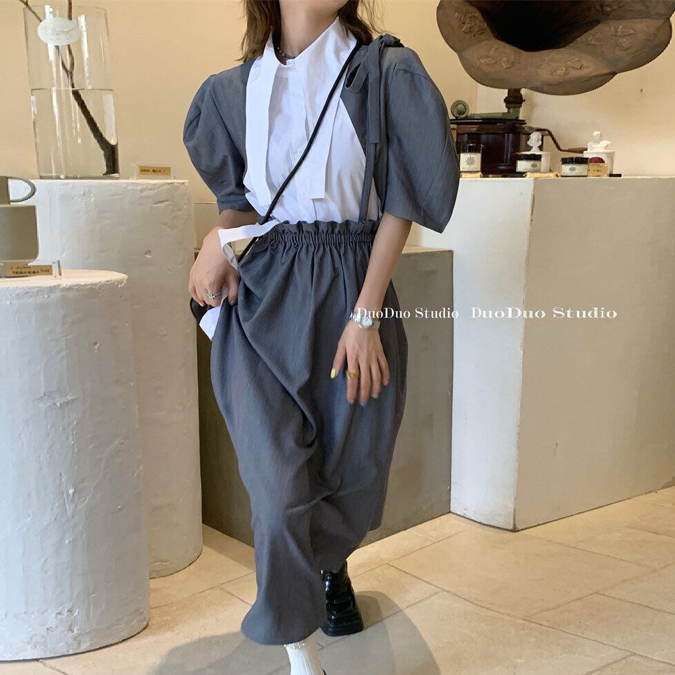 色:オフホワイトカラーのブロックシャツ,ダークグレーのサスペンダースカート