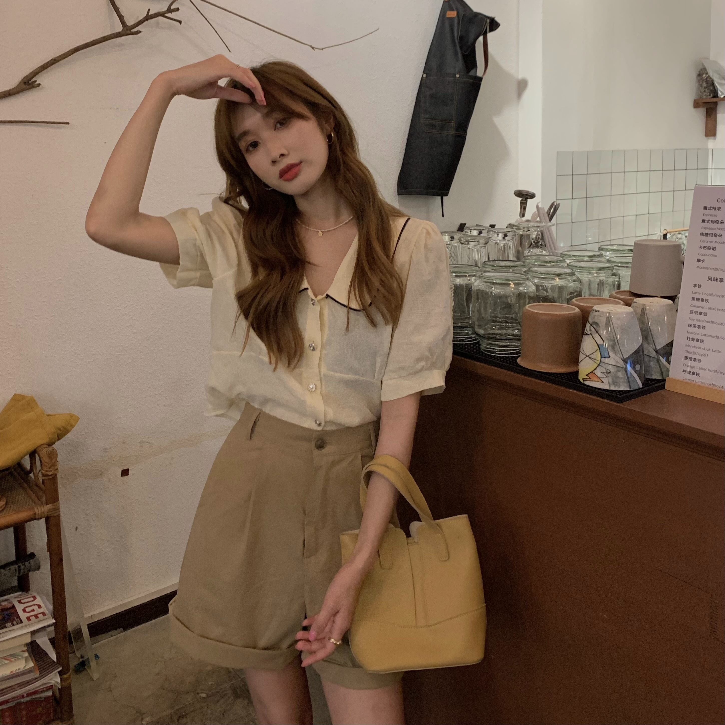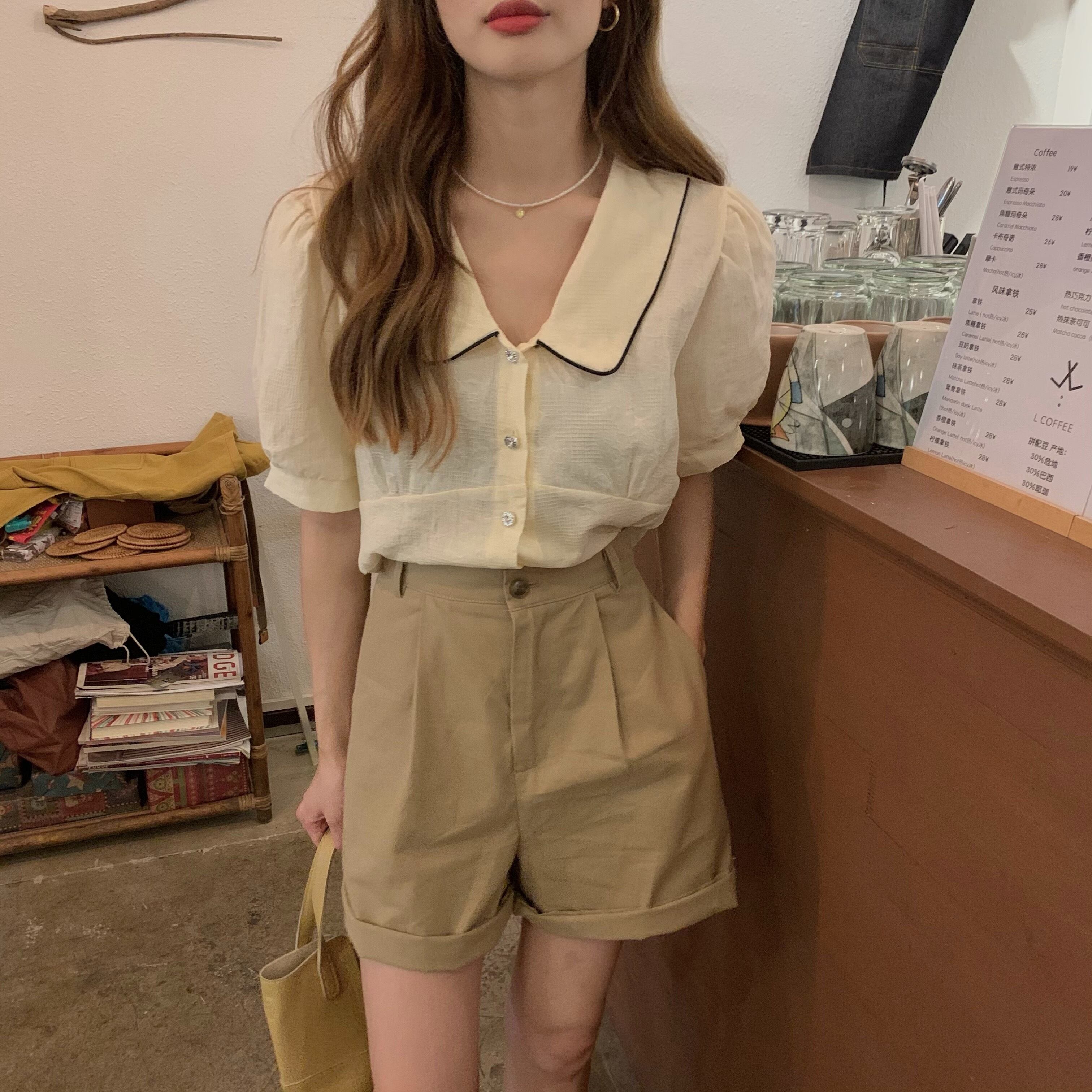 カラースリーブシャツ ショートサマートップス 大人ガーリー スウィート キュート カジュアル 夏物 モンロー59203694376