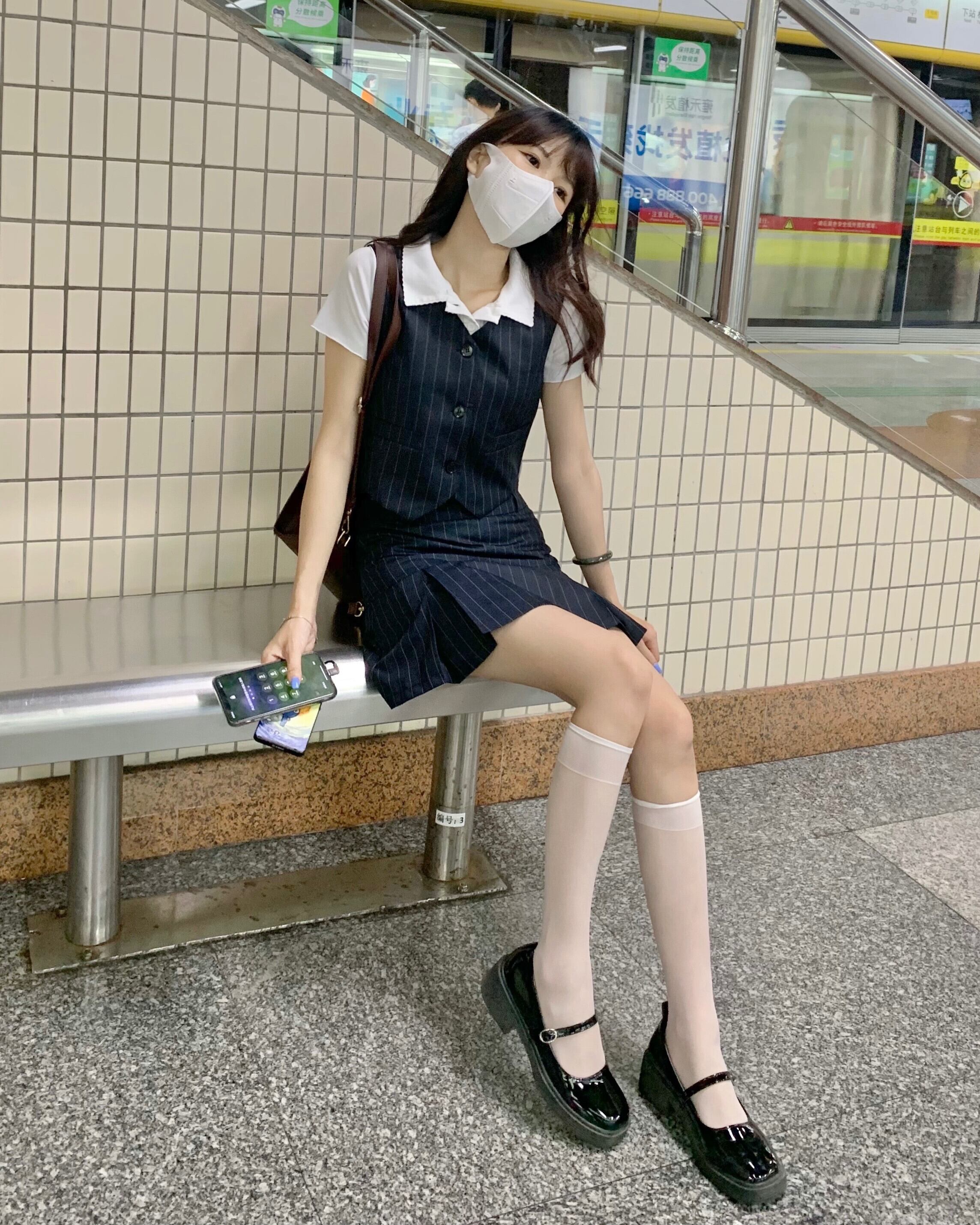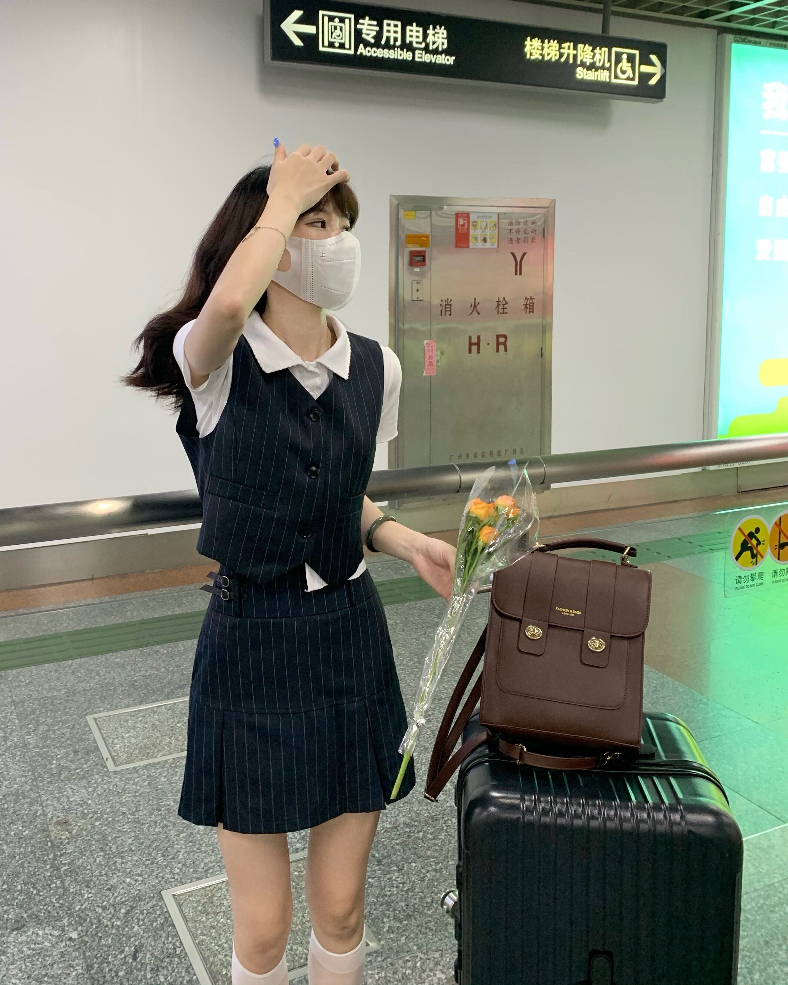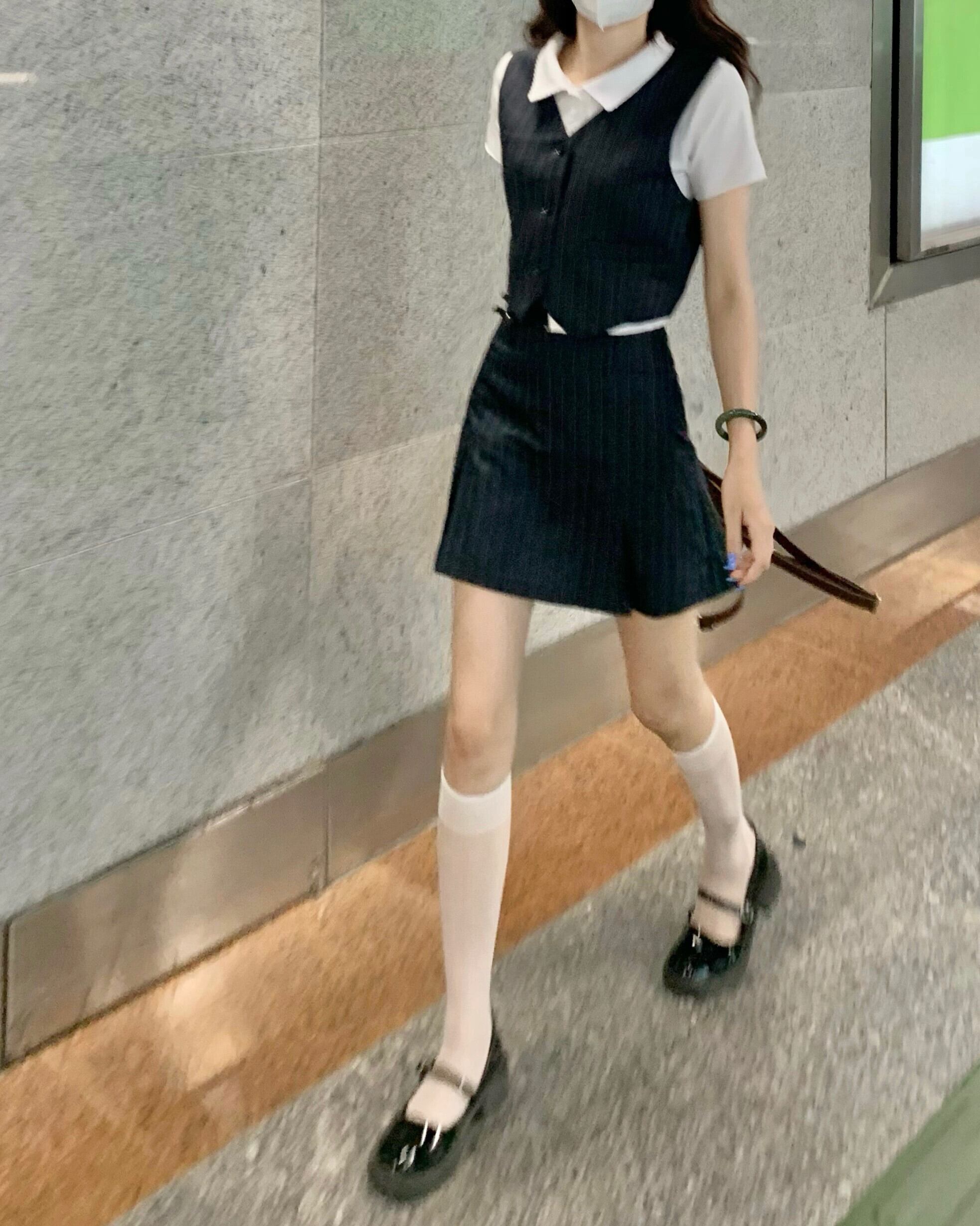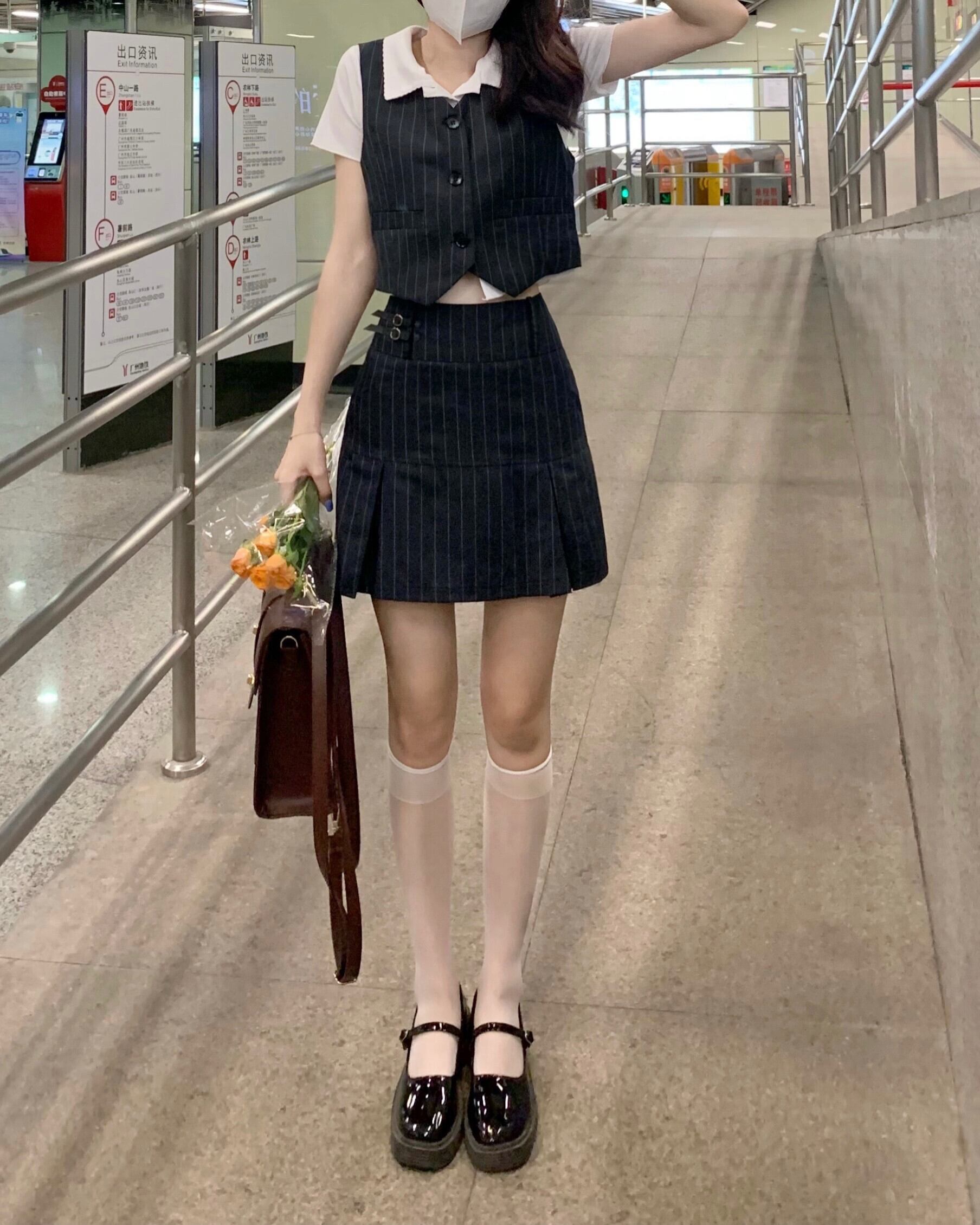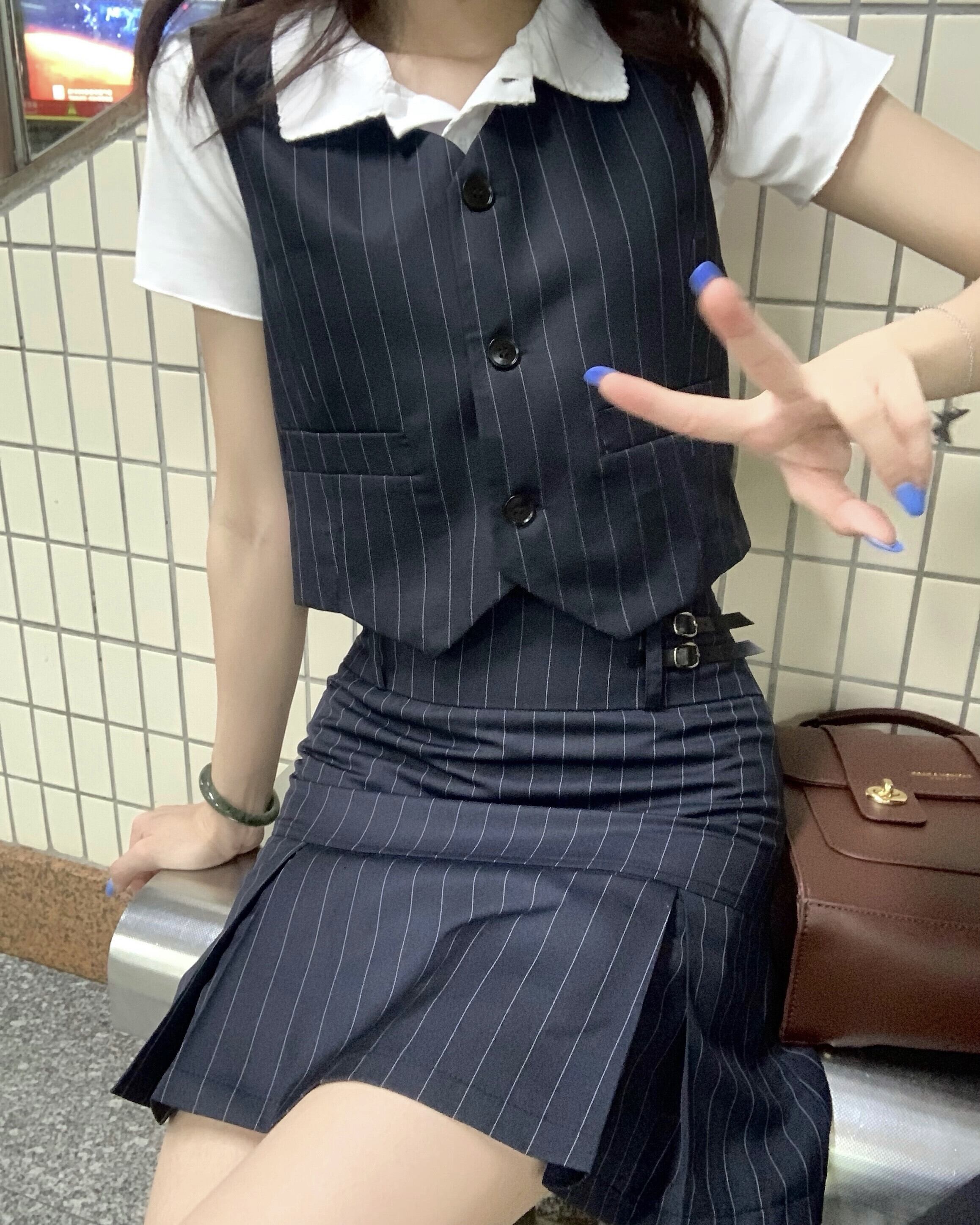 色:ストライプベスト,縞模様のスカート,白半袖T