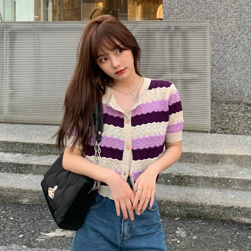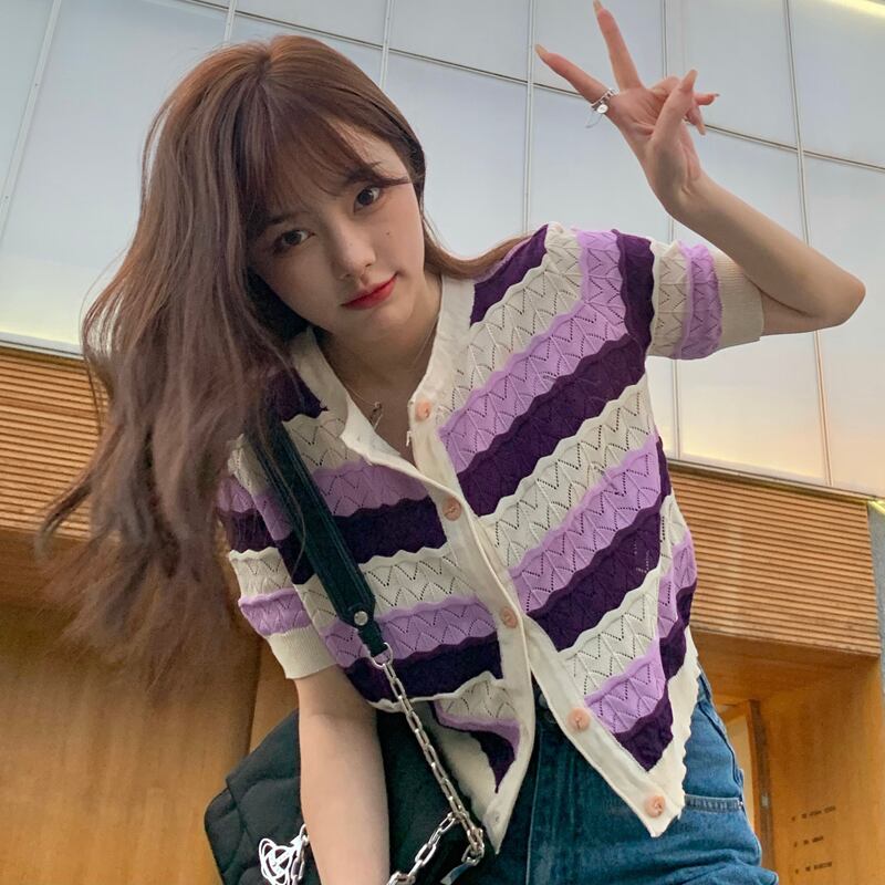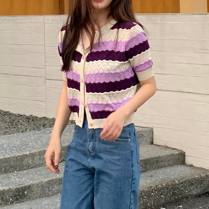 スタイルストライプニットカーディガンサマースリムトップス 大人ガーリー スウィート キュート カジュアル 夏物 モンロー43808245294