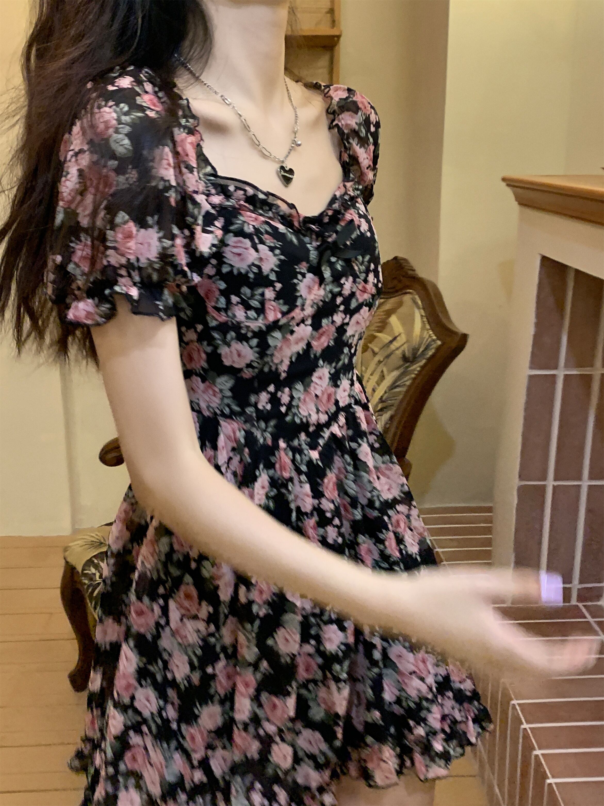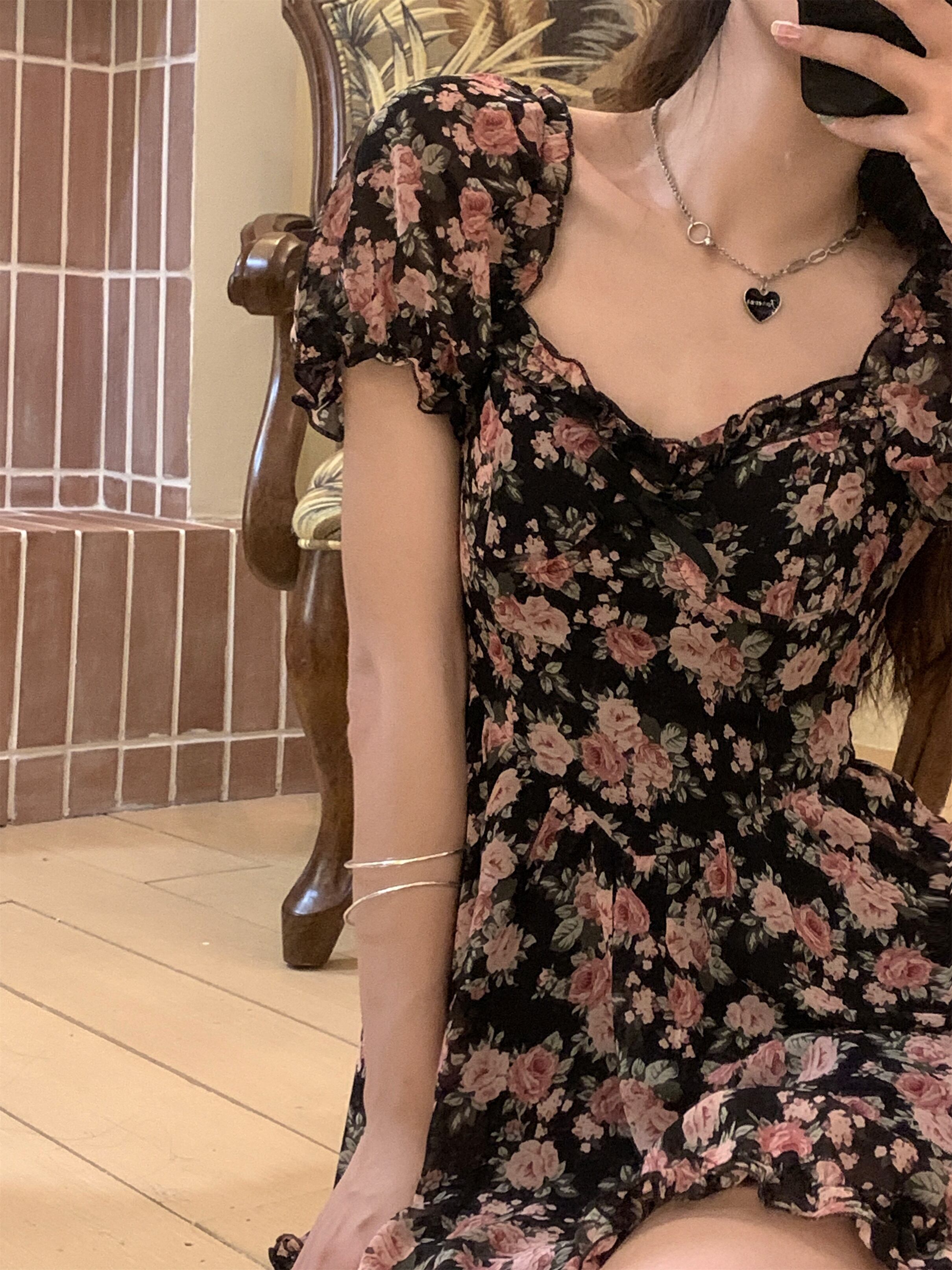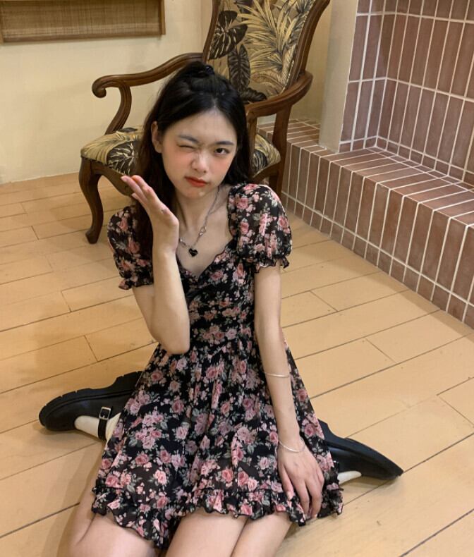 フローラル薄手ドレス サマーウェストAラインショートスカート 大人ガーリー スウィート キュート カジュアル 夏物 花柄 モンロー7222861123