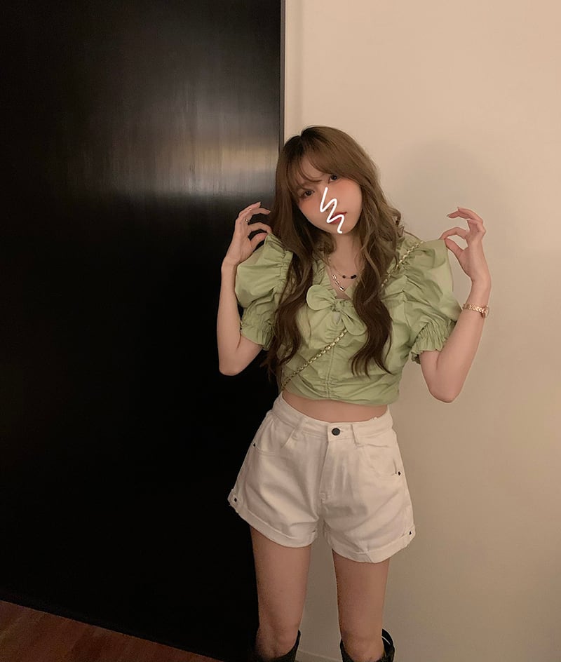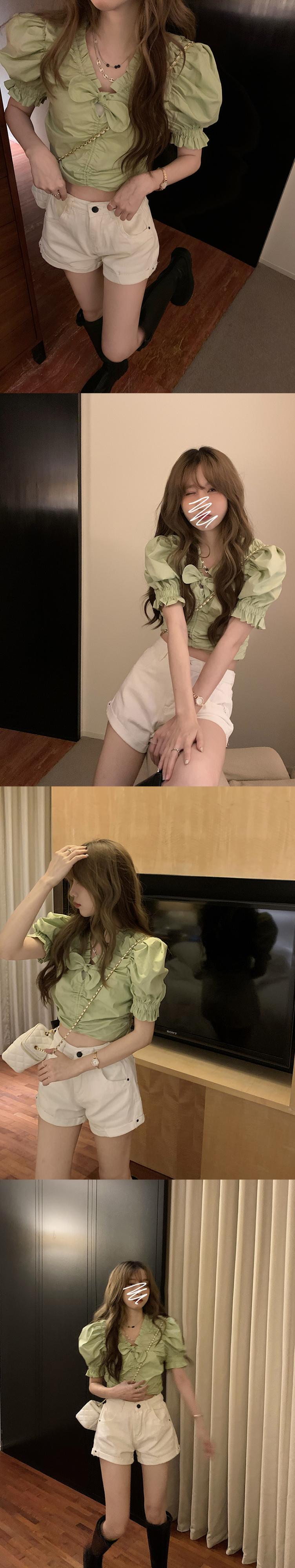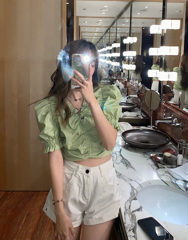 サマーVネックスリーブショートシャツ プリーツトップス 夏物 モンロー64333454617