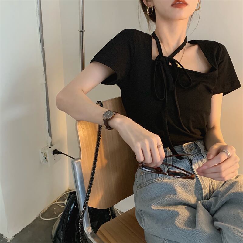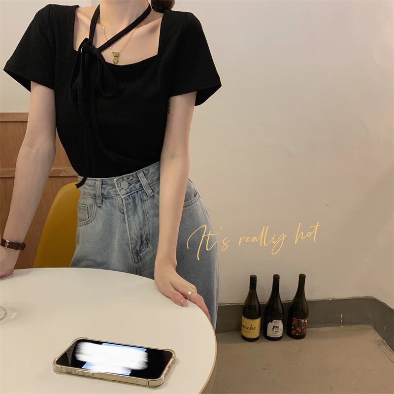 サマーブラックスリム半袖スリーブTシャツ トップス ショート ハーフスリーブ 夏物 スクウェア モンロー33080501945