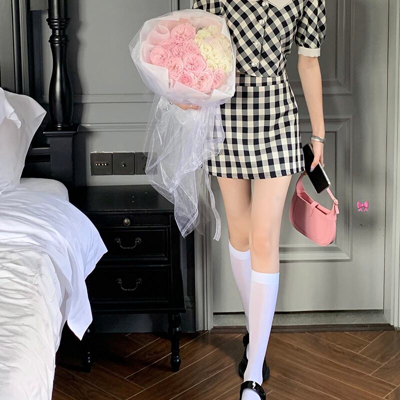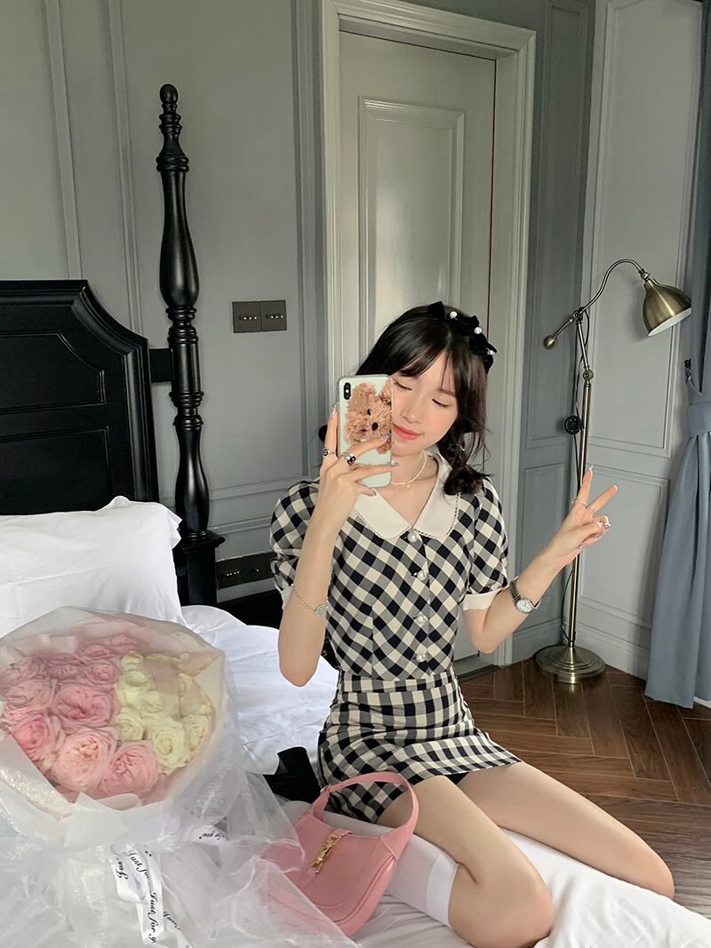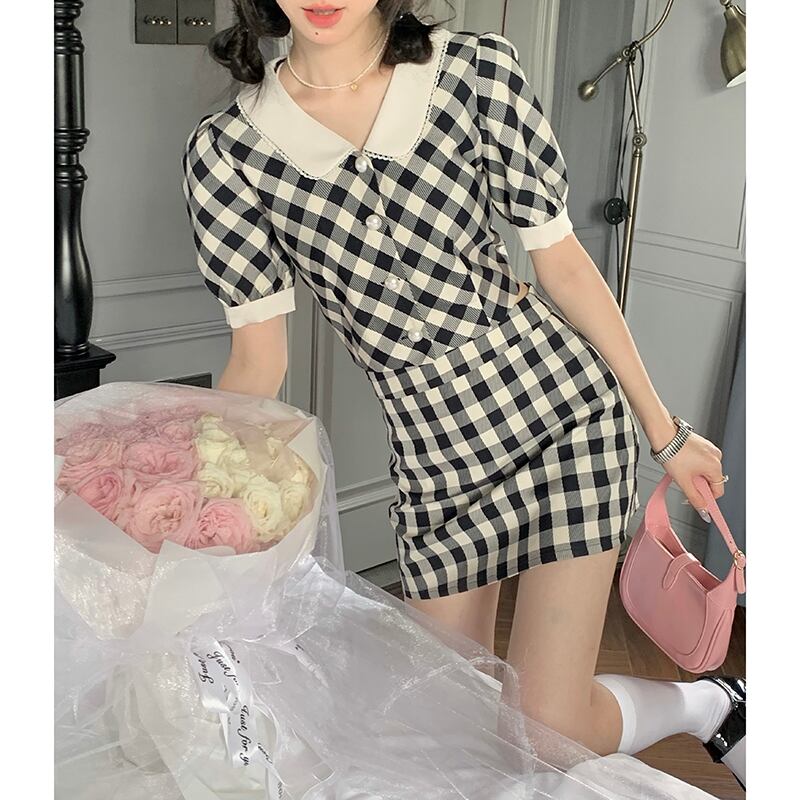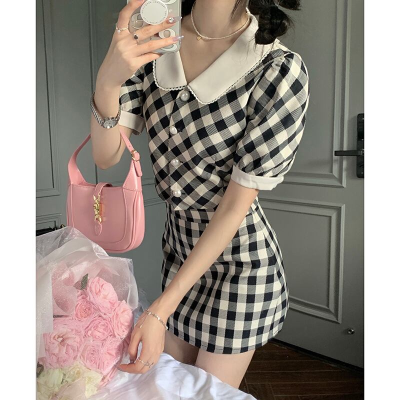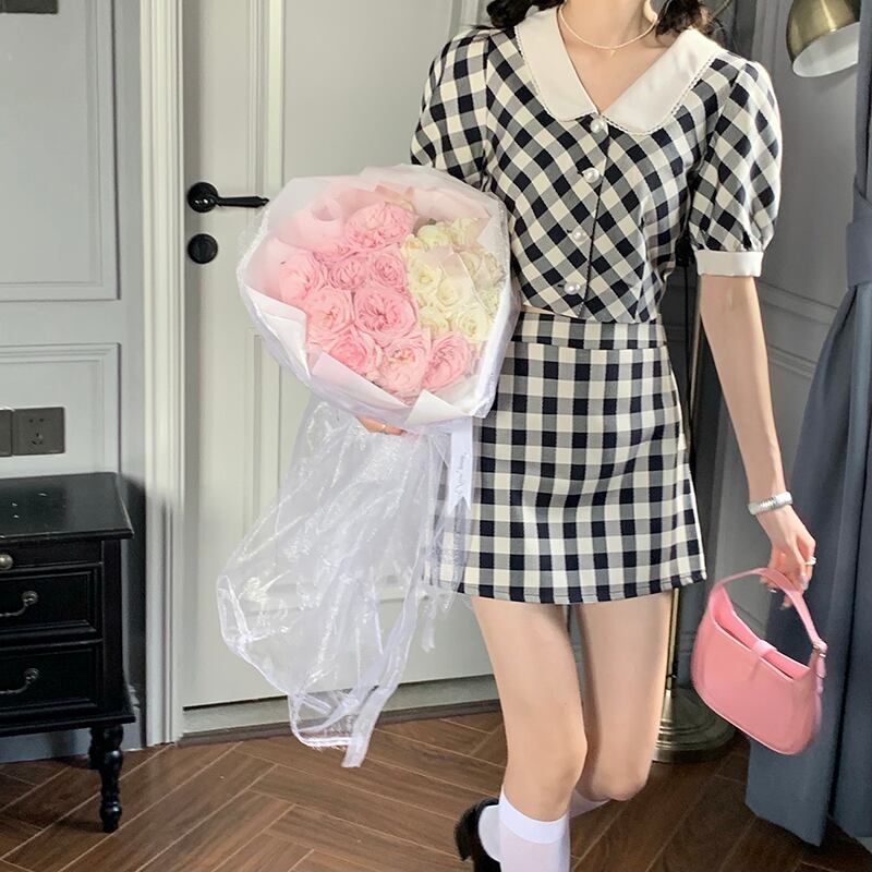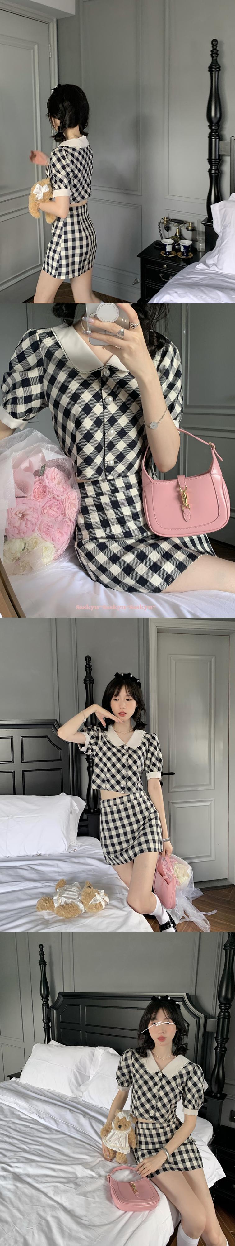 サマー格子柄半袖スリーブトップス ウェストスカート セット ショート ハーフスリーブ 夏物 モンロー53562368282