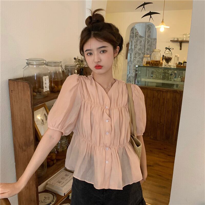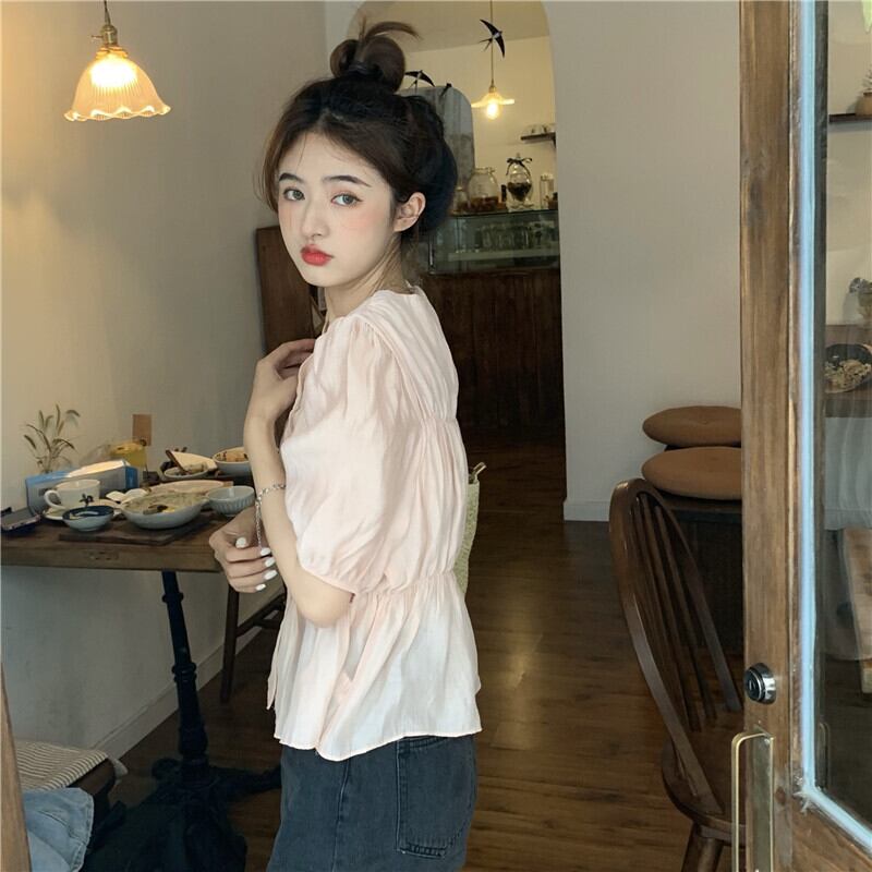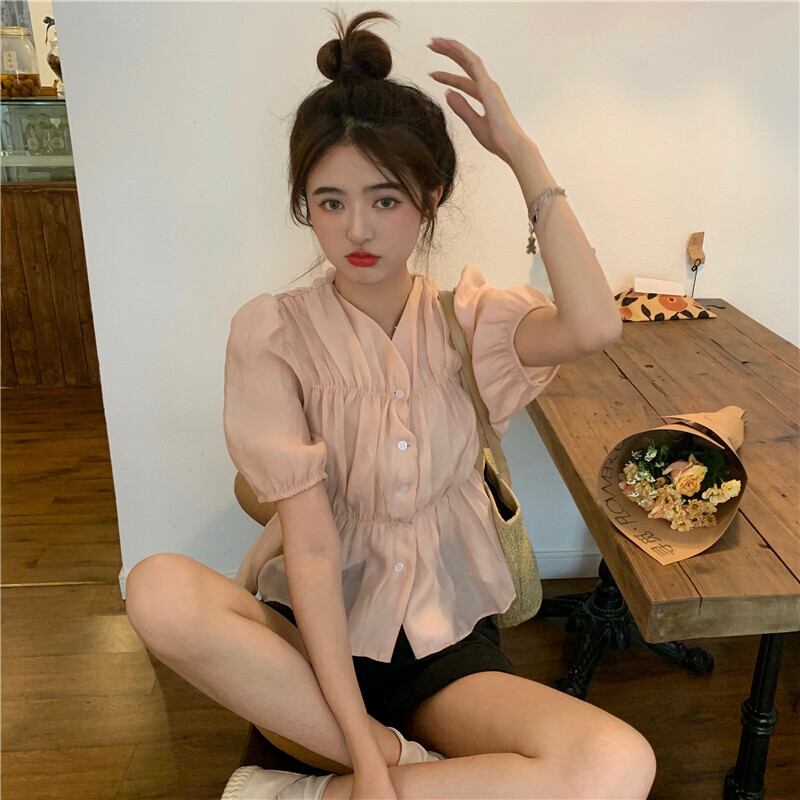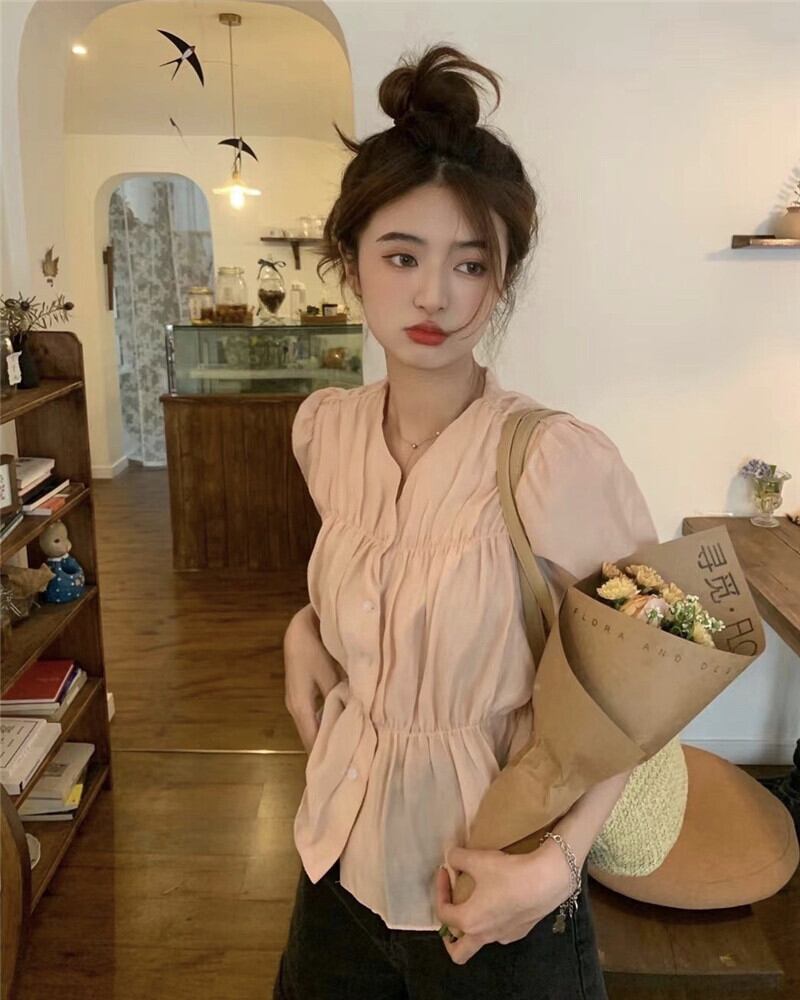 サマーウェストVネックスリーブシャツ ピンク 夏物 モンロー71943386044