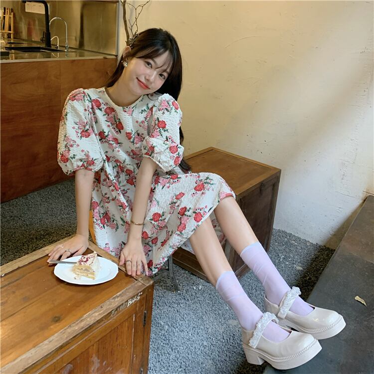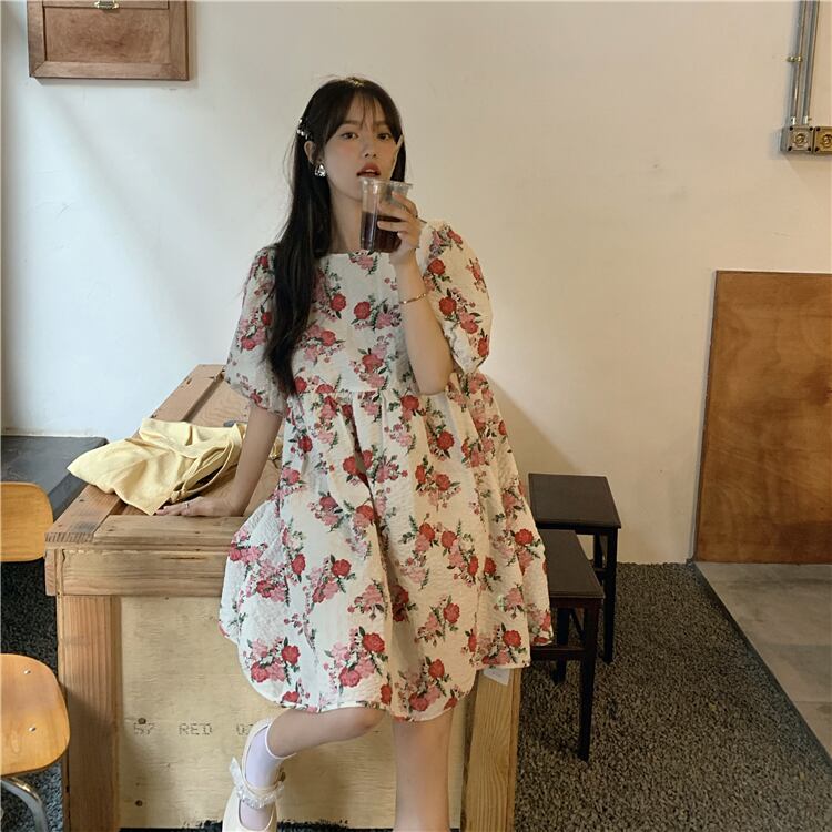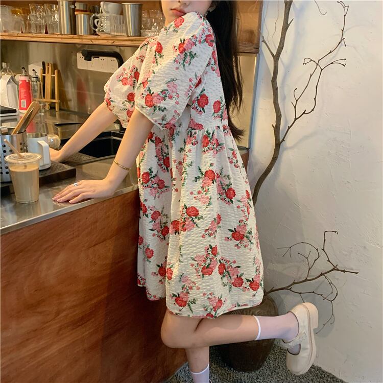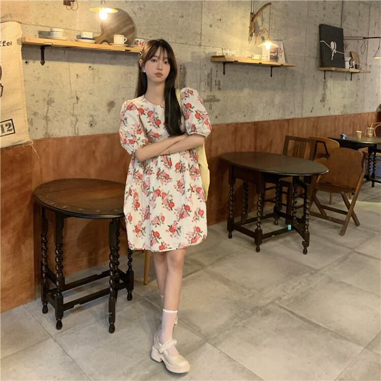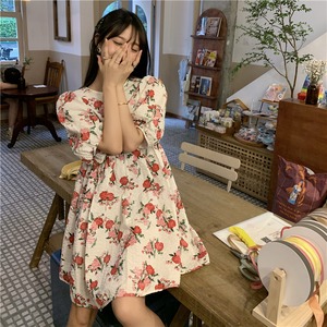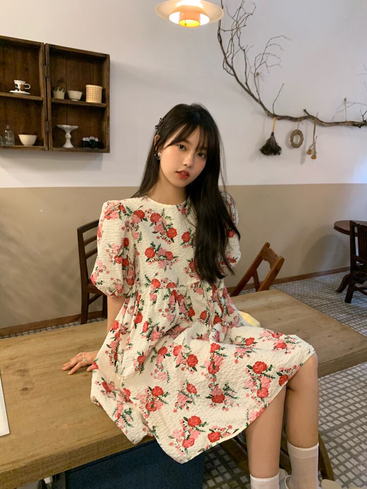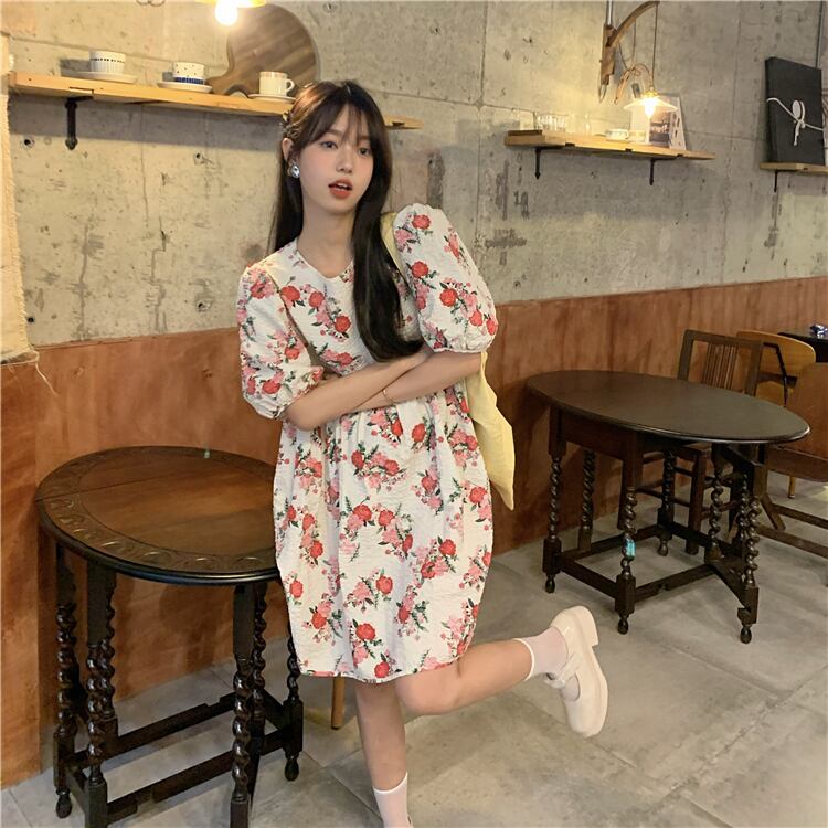 スリーブフローラルハイウェストウェストドレス サマーAラインスカート 大人ガーリー スウィート キュート カジュアル 夏物 花柄 モンロー82635235790