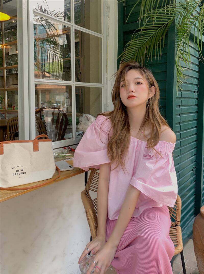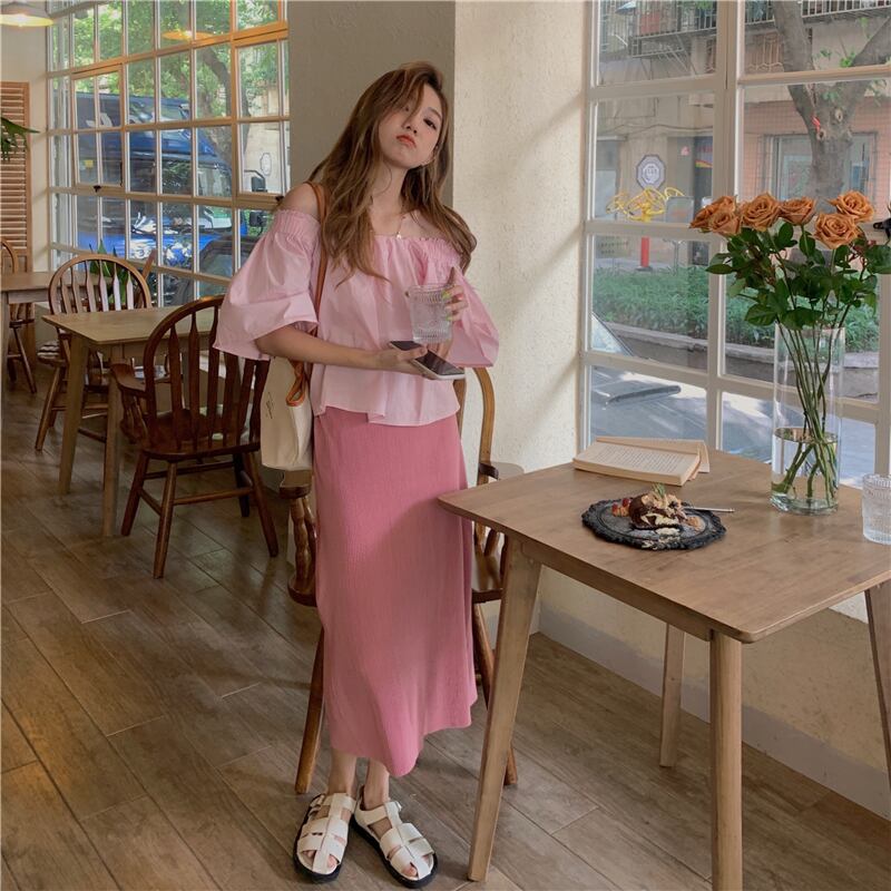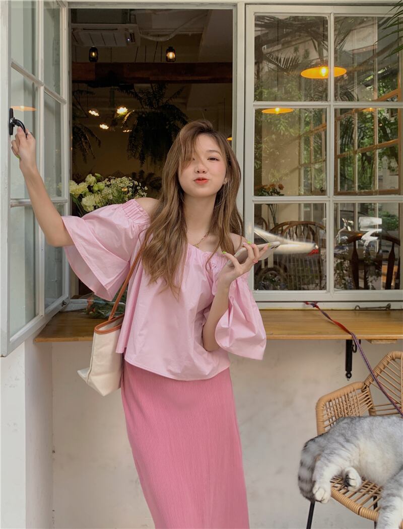 サマー半袖スリーブトップス ストレッチスカート ショート ピンク ハーフスリーブ ストリート エラスティック 伸縮 夏物 スクウェア モンロー2528668336