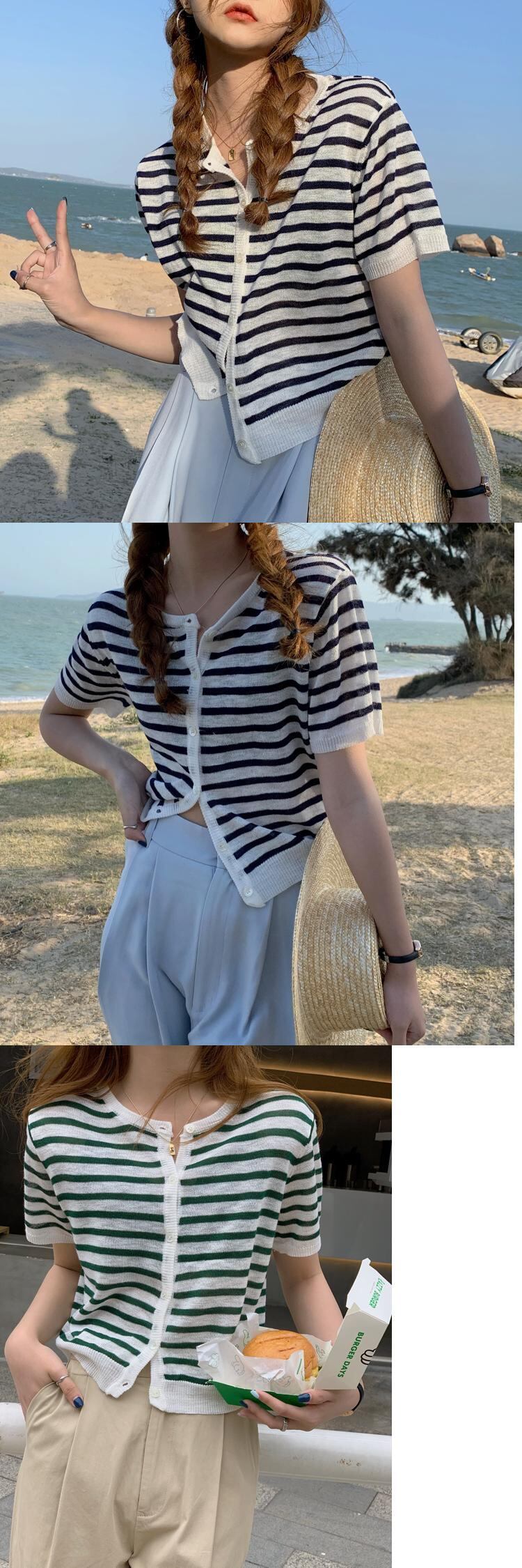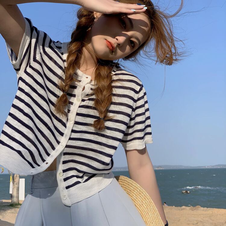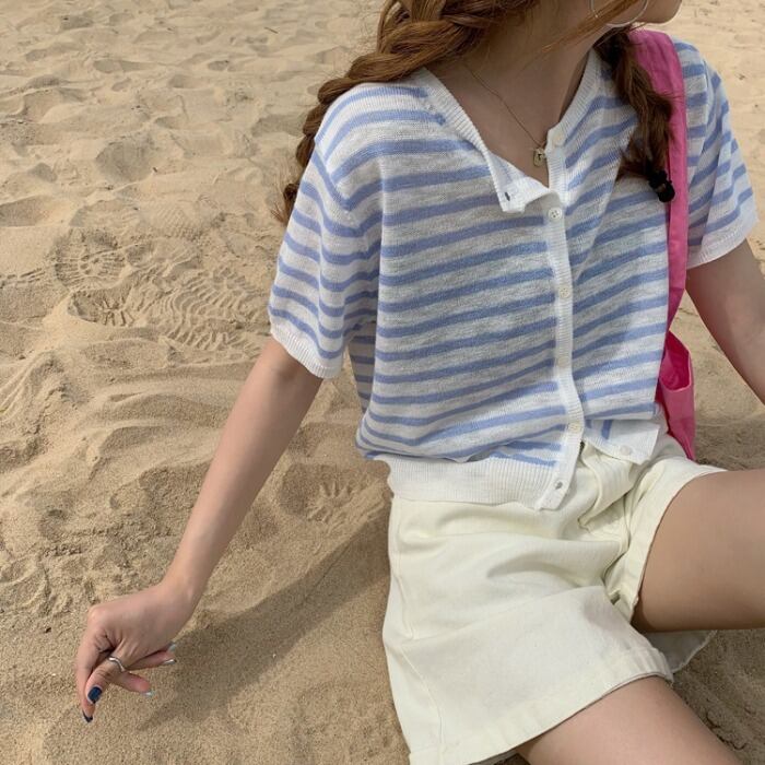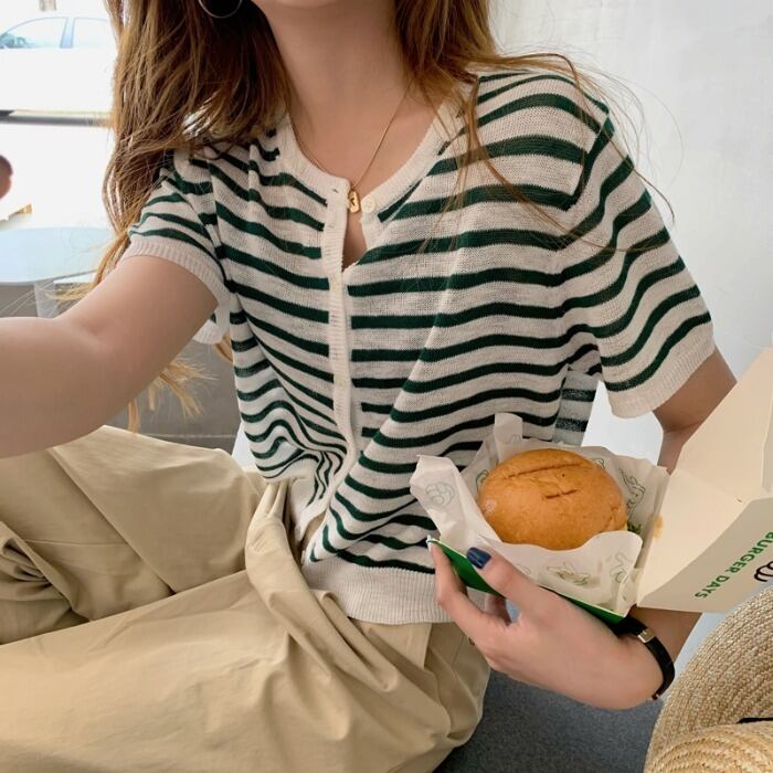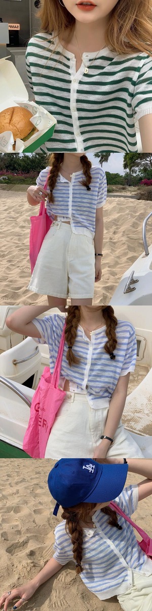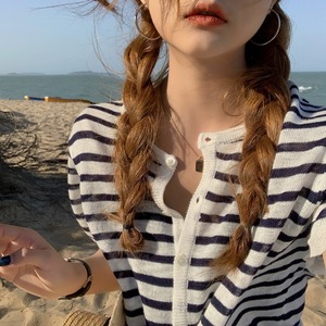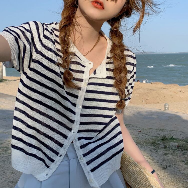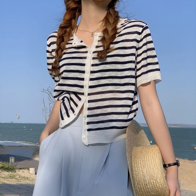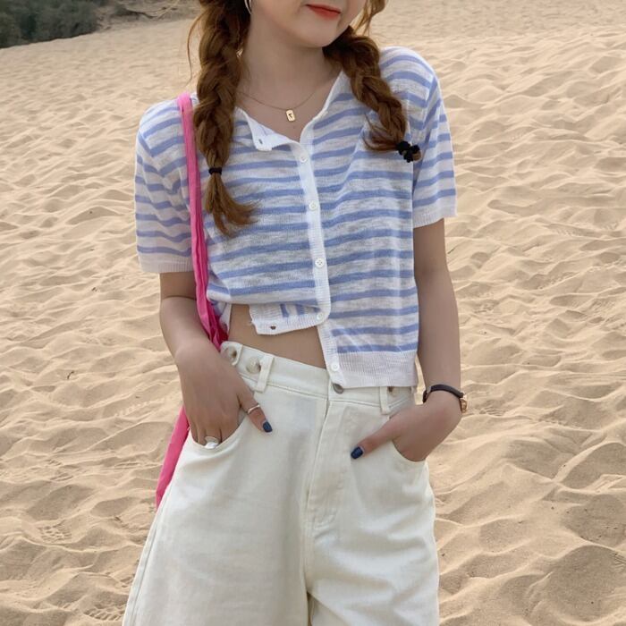 ストライプニットカーディガンショートサマー薄手セーター コート スタイルトップス 夏物 モンロー80336819609