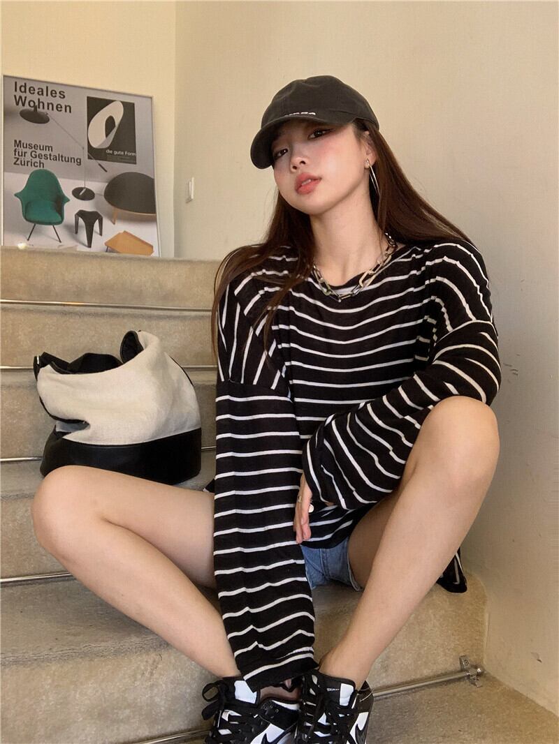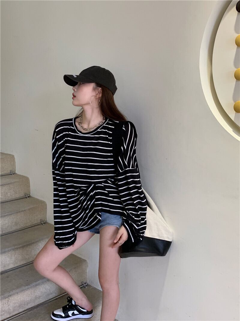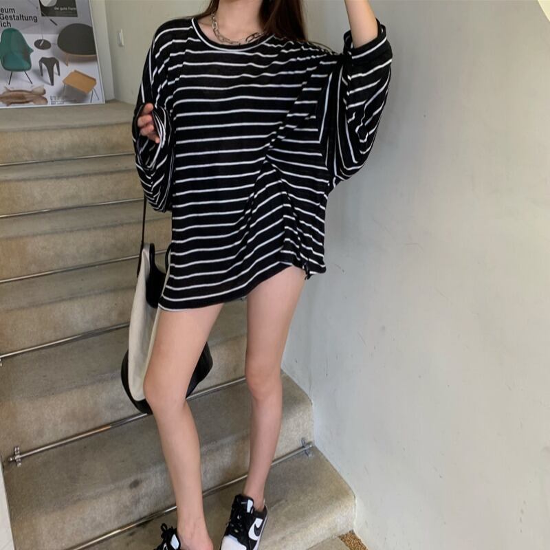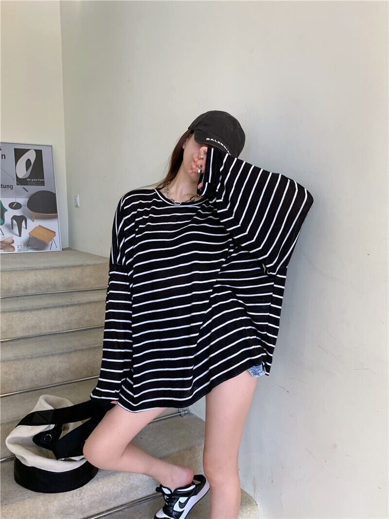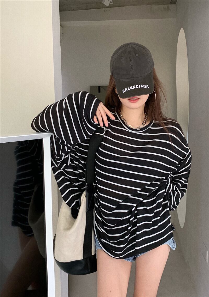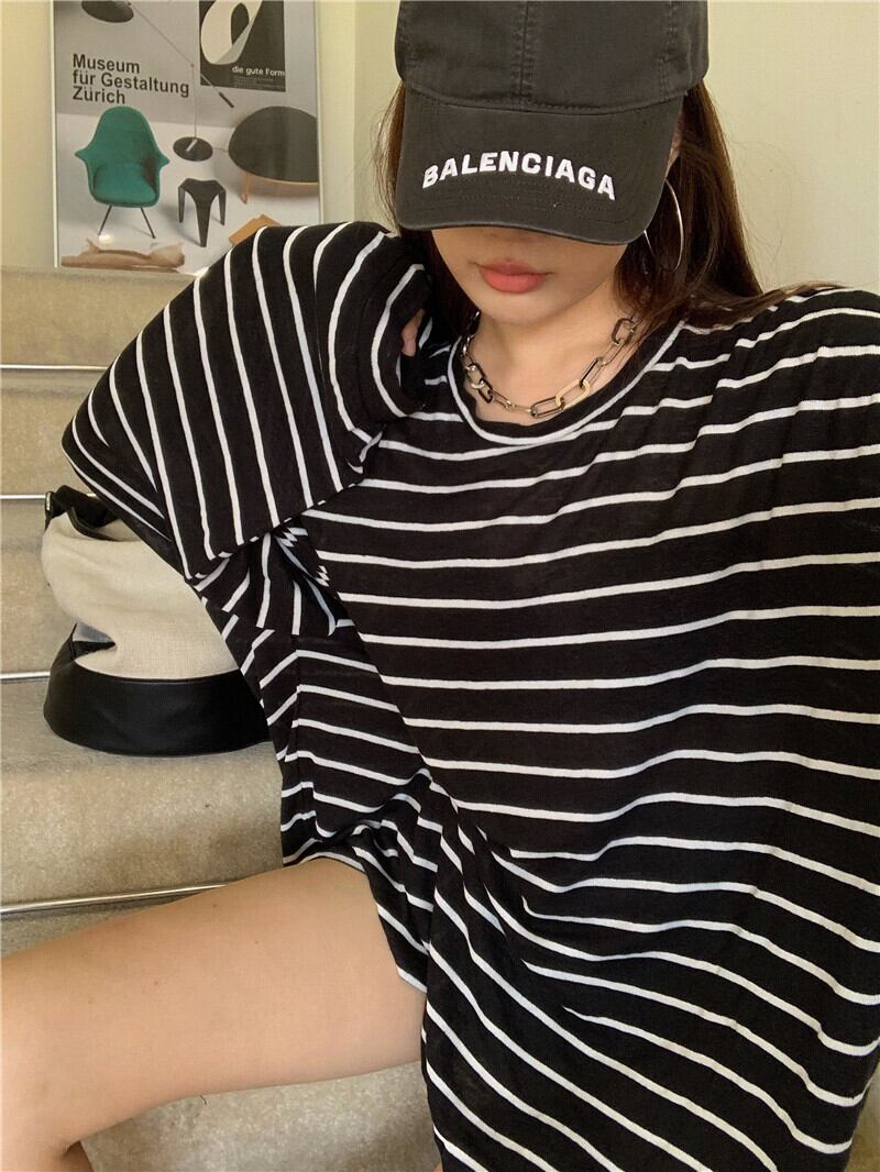 サマーカジュアルラウンドネックストライプルーズTシャツ ロング 夏物 Oネック モンロー54764852731