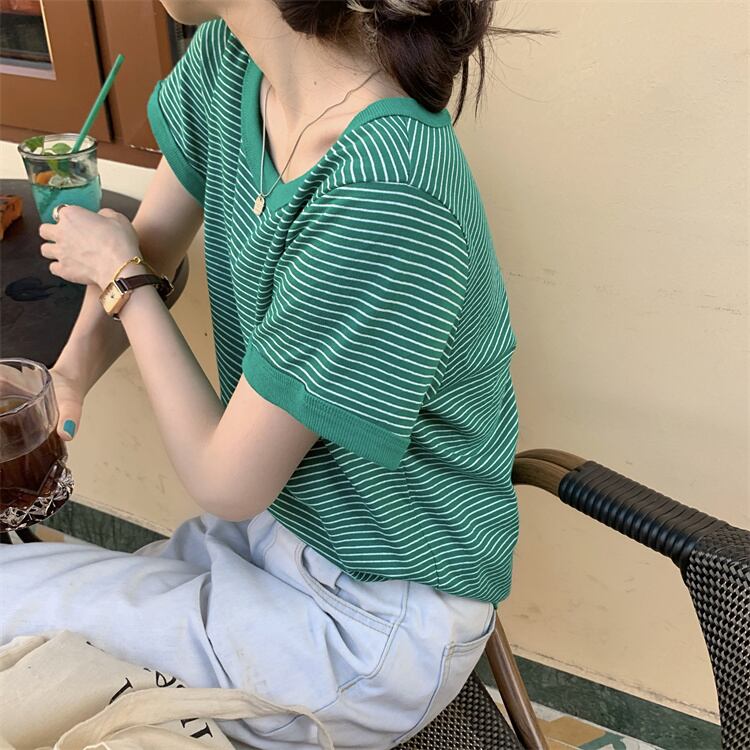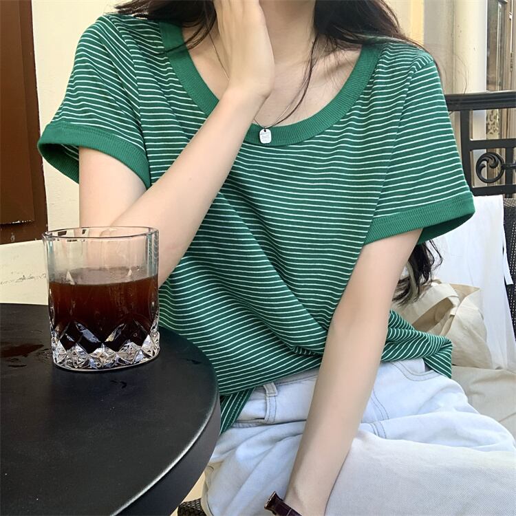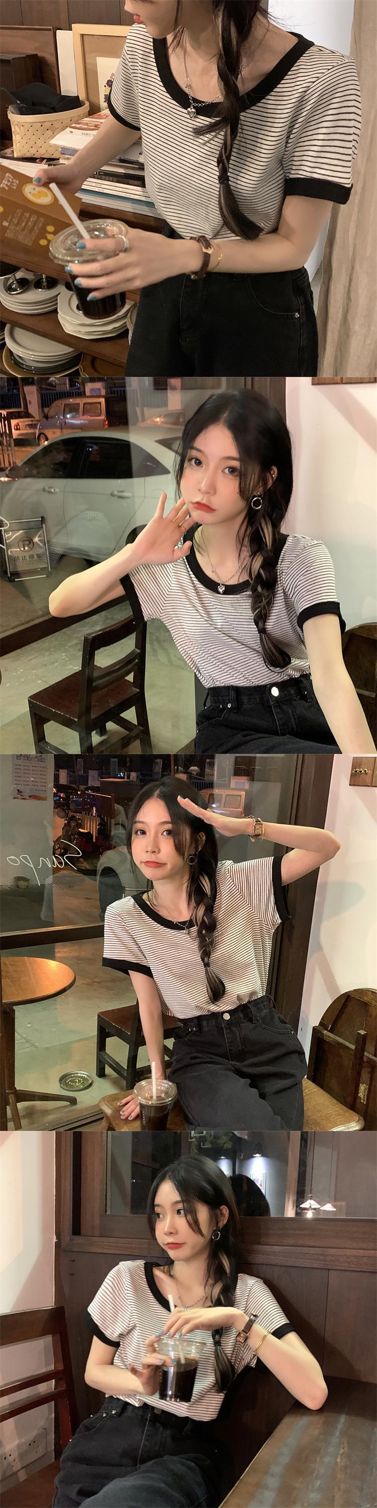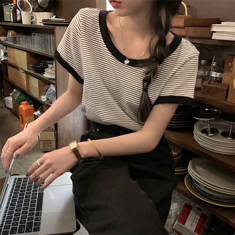 サマールーズストライプラウンドネックTシャツ 夏物 Oネック モンロー56411846171