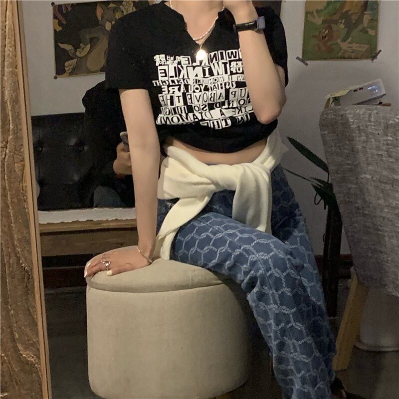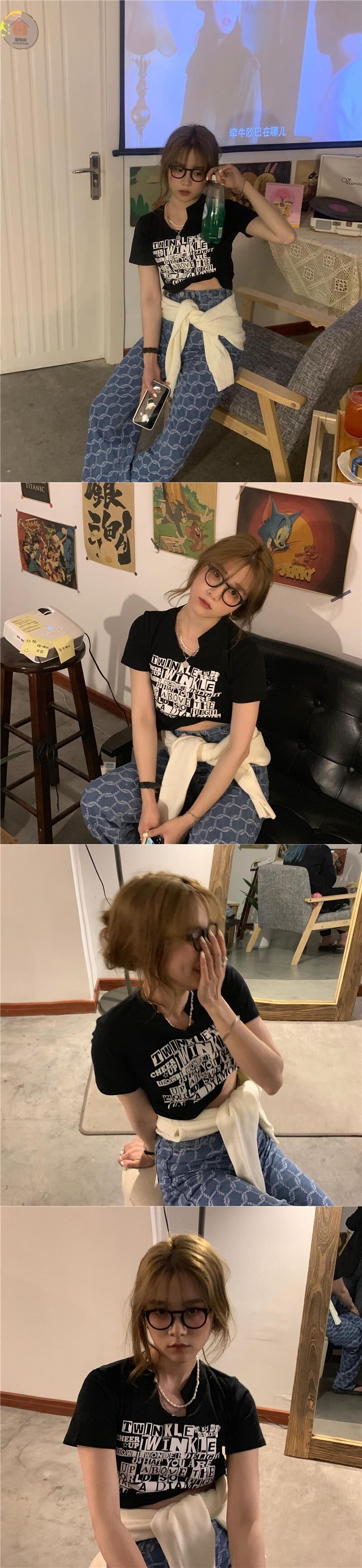 ブラックVネックプリントショートTシャツ サマークロップトップ トップス 夏物 モンロー56847550217