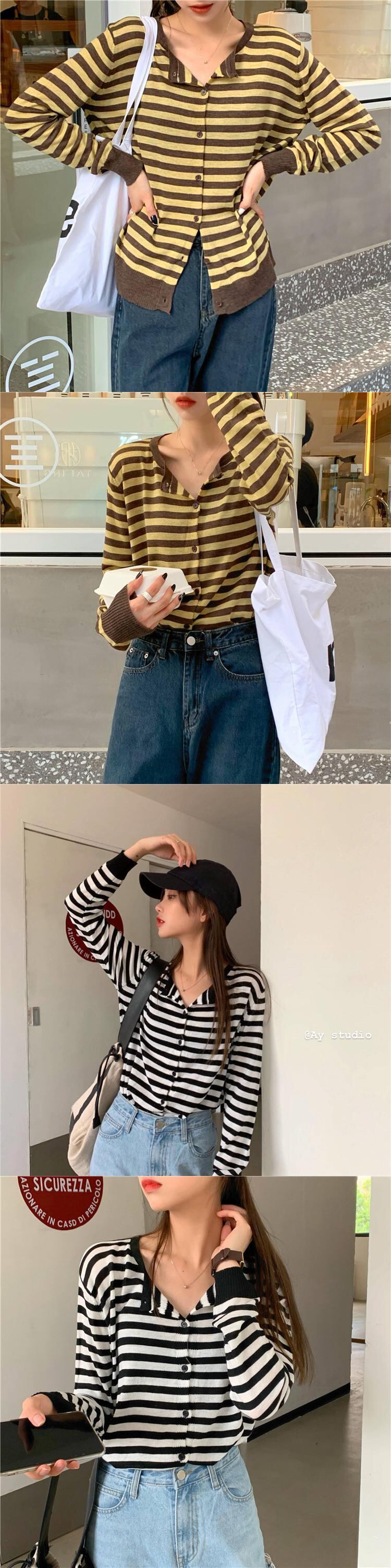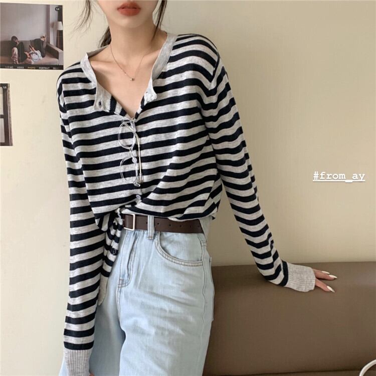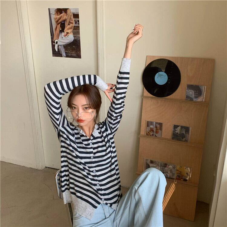 ストライプニットカーディガンショートトップス スプリングルーズセーター ジャケット 春物 モンロー70390289814