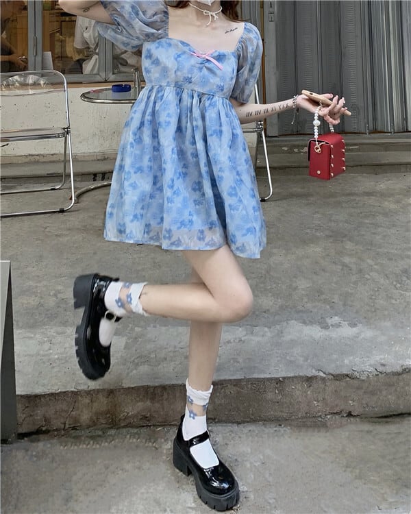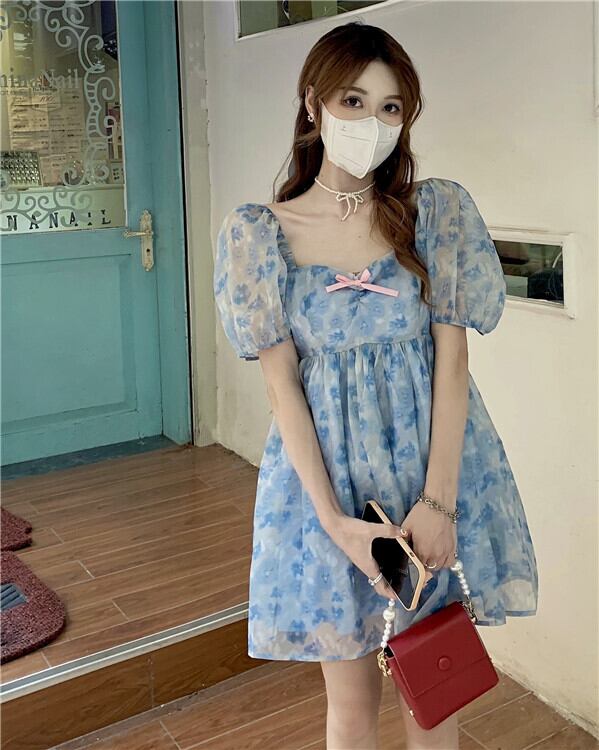 Vネックフローラルドレス サマースタイルハイウェストウェストスリムスリーブショートスカート 大人ガーリー スウィート キュート カジュアル 夏物 花柄 モンロー54397728384
