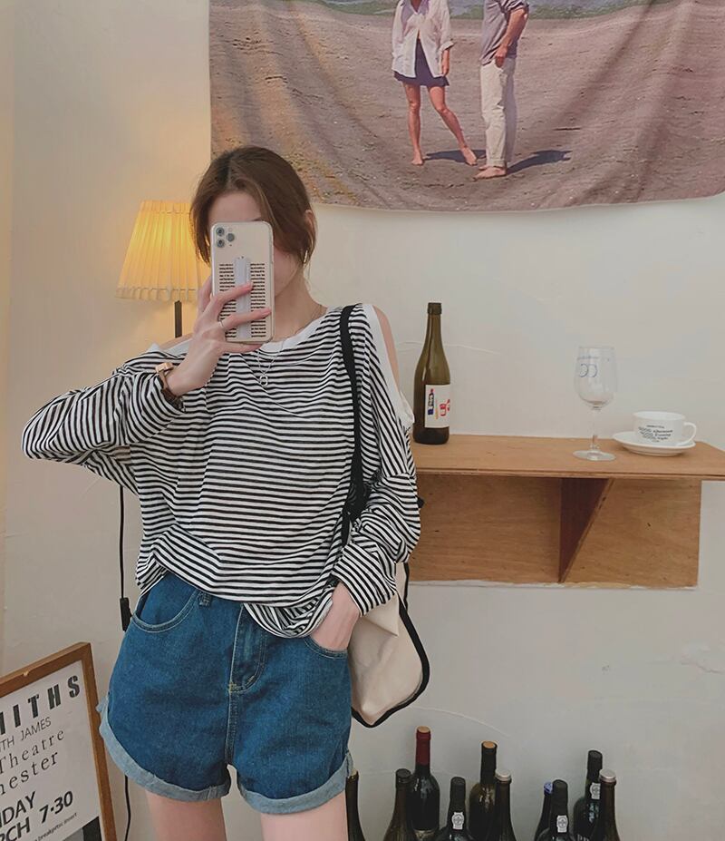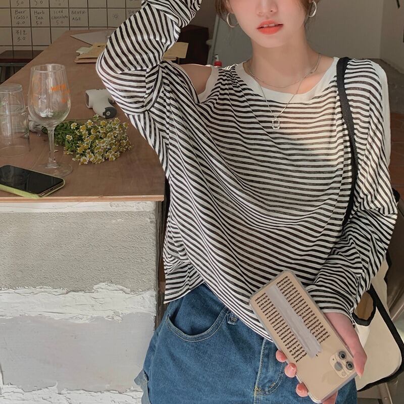 スタイルルーズストラップレスTシャツ サマーブラックホワイトストライプトップス ロング 夏物 モンロー70532067792