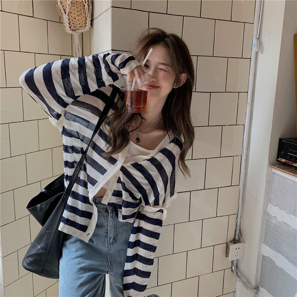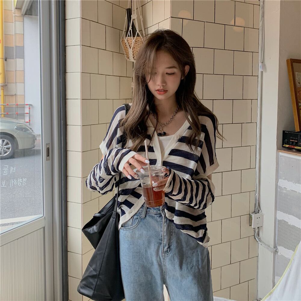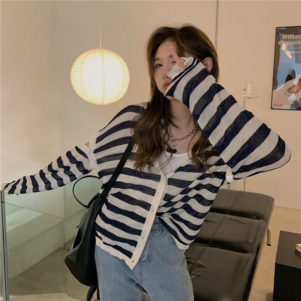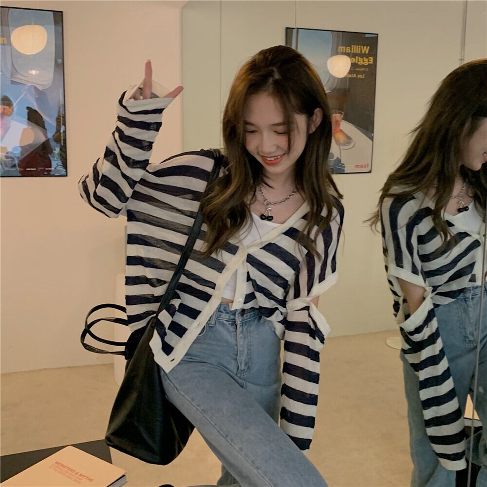薄手ストライプトップス サマースタイルVネックニットカーディガンジャケット 大人ガーリー スウィート キュート カジュアル 夏物 モンロー45440927089