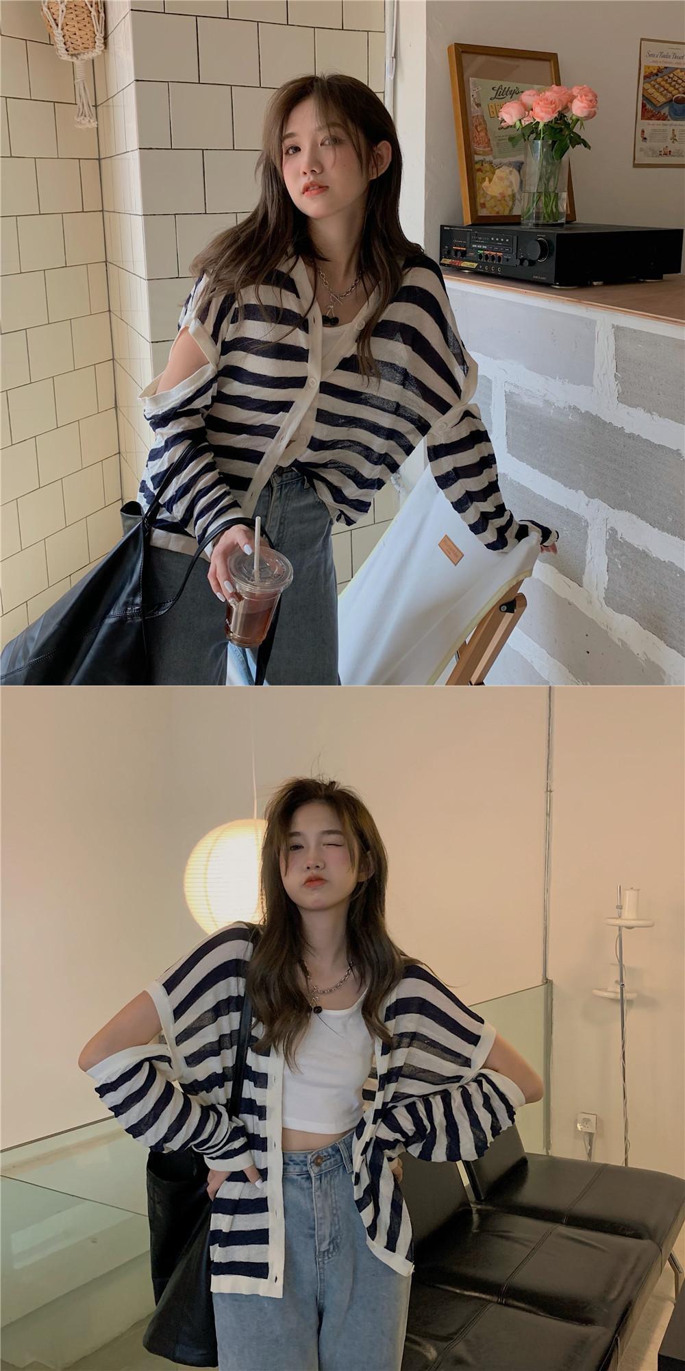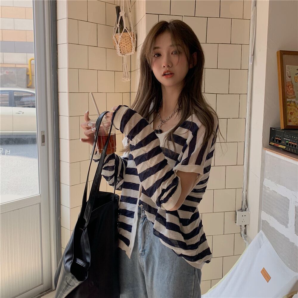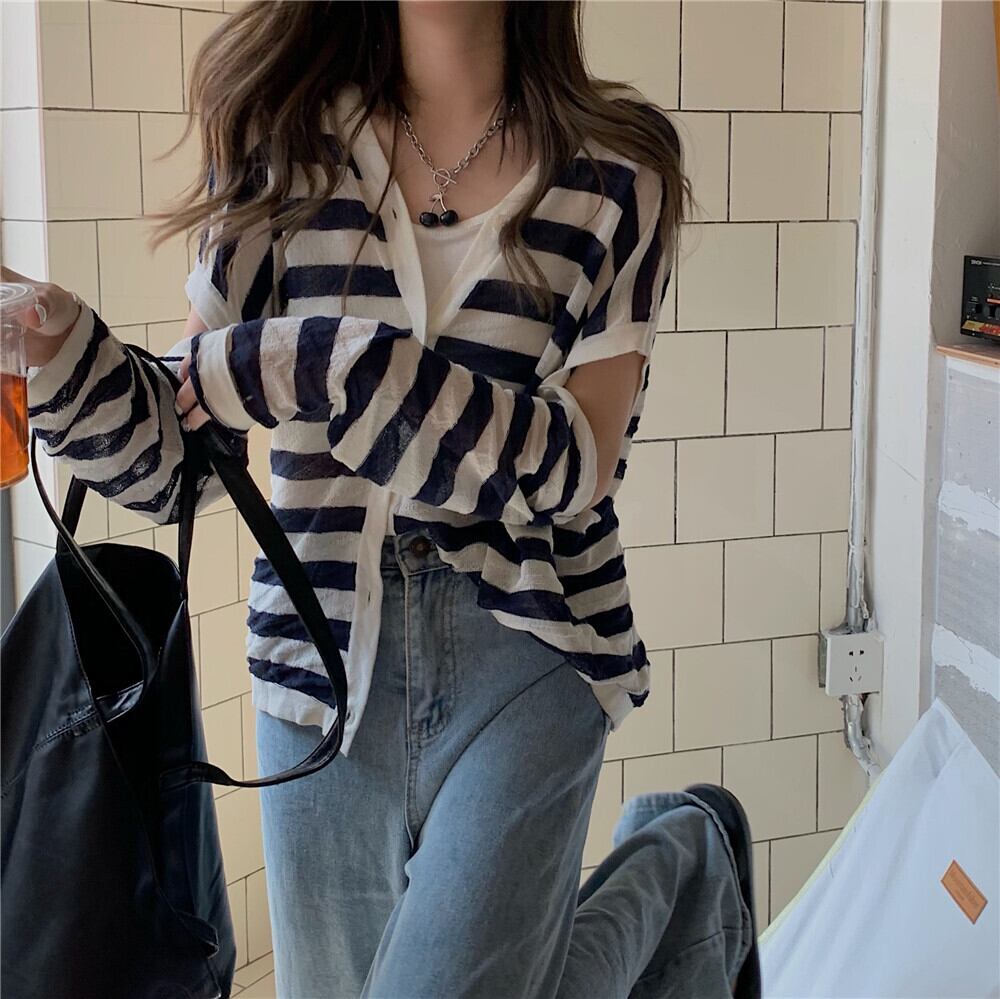 薄手ストライプトップス サマースタイルVネックニットカーディガンジャケット 大人ガーリー スウィート キュート カジュアル 夏物 モンロー45440927089