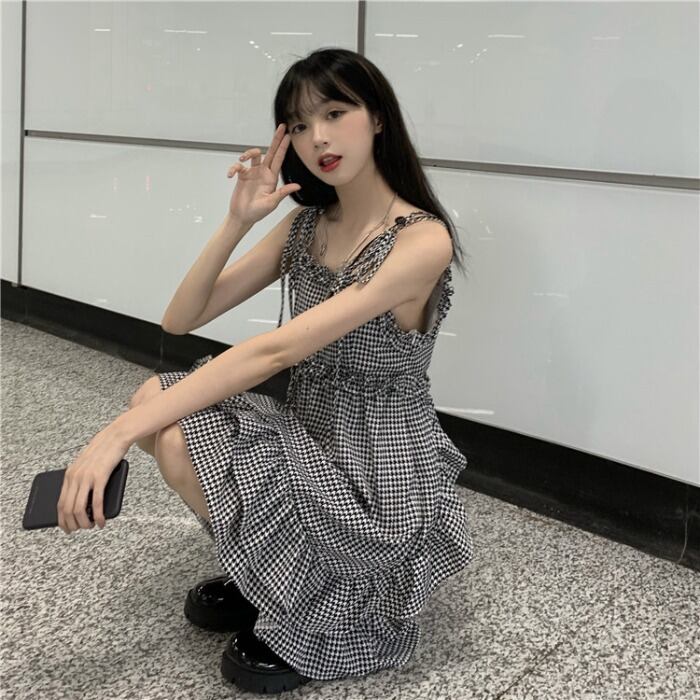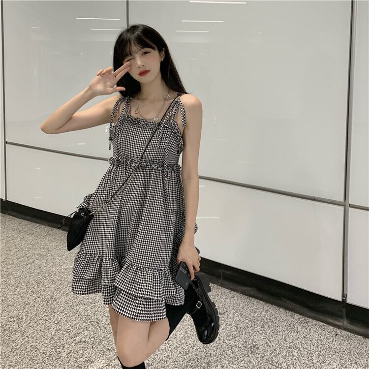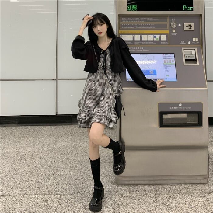 色:ブラックカーディガン,千鳥格子サスペンダースカート