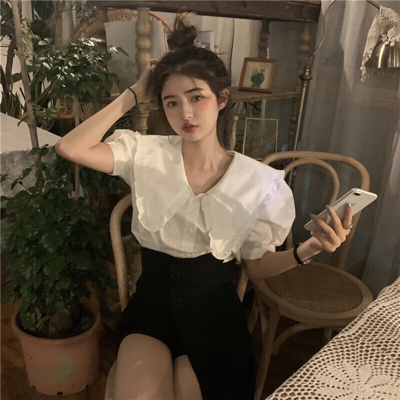 カラースリーブホワイトシャツ ショート薄手サマートップス 夏物 モンロー60896289491