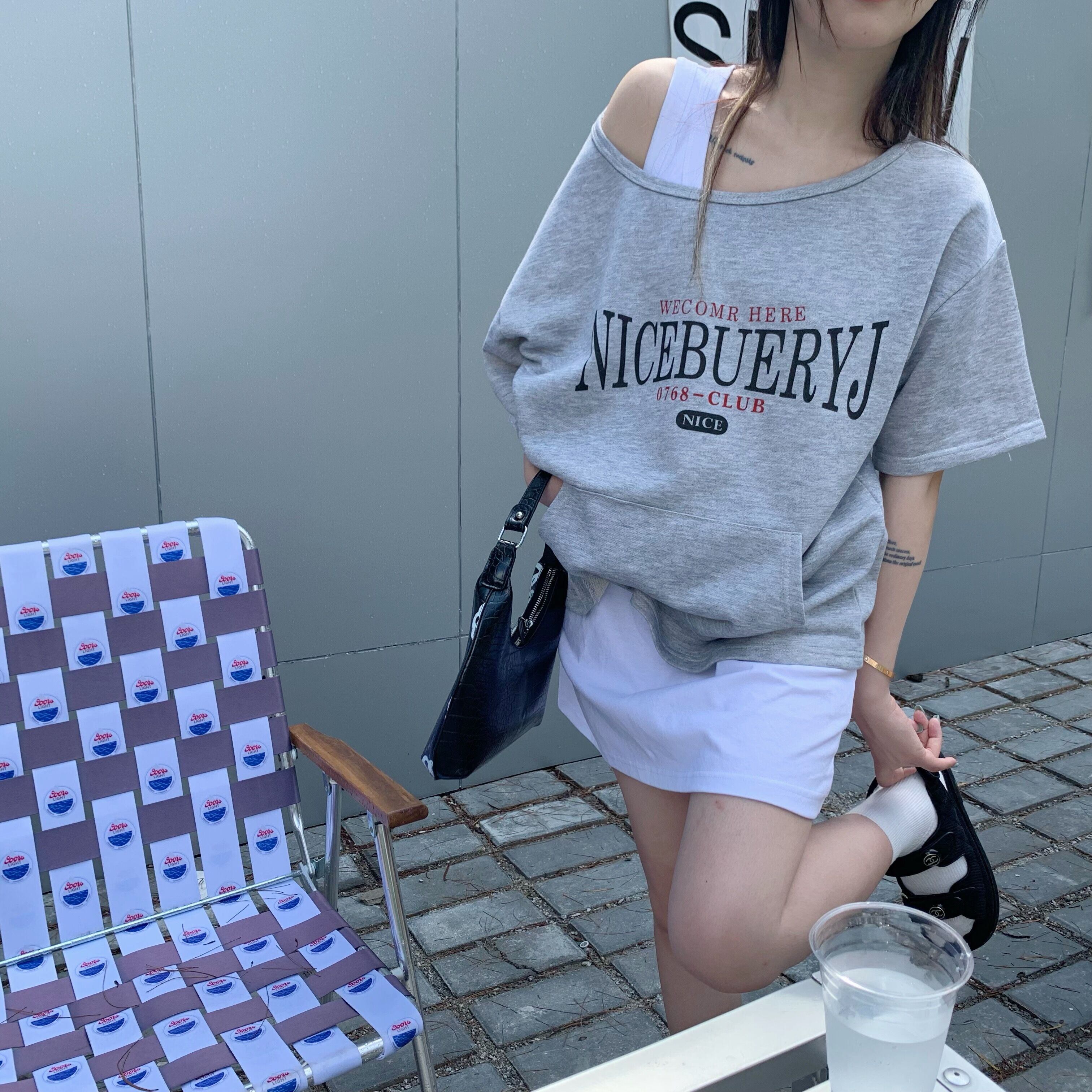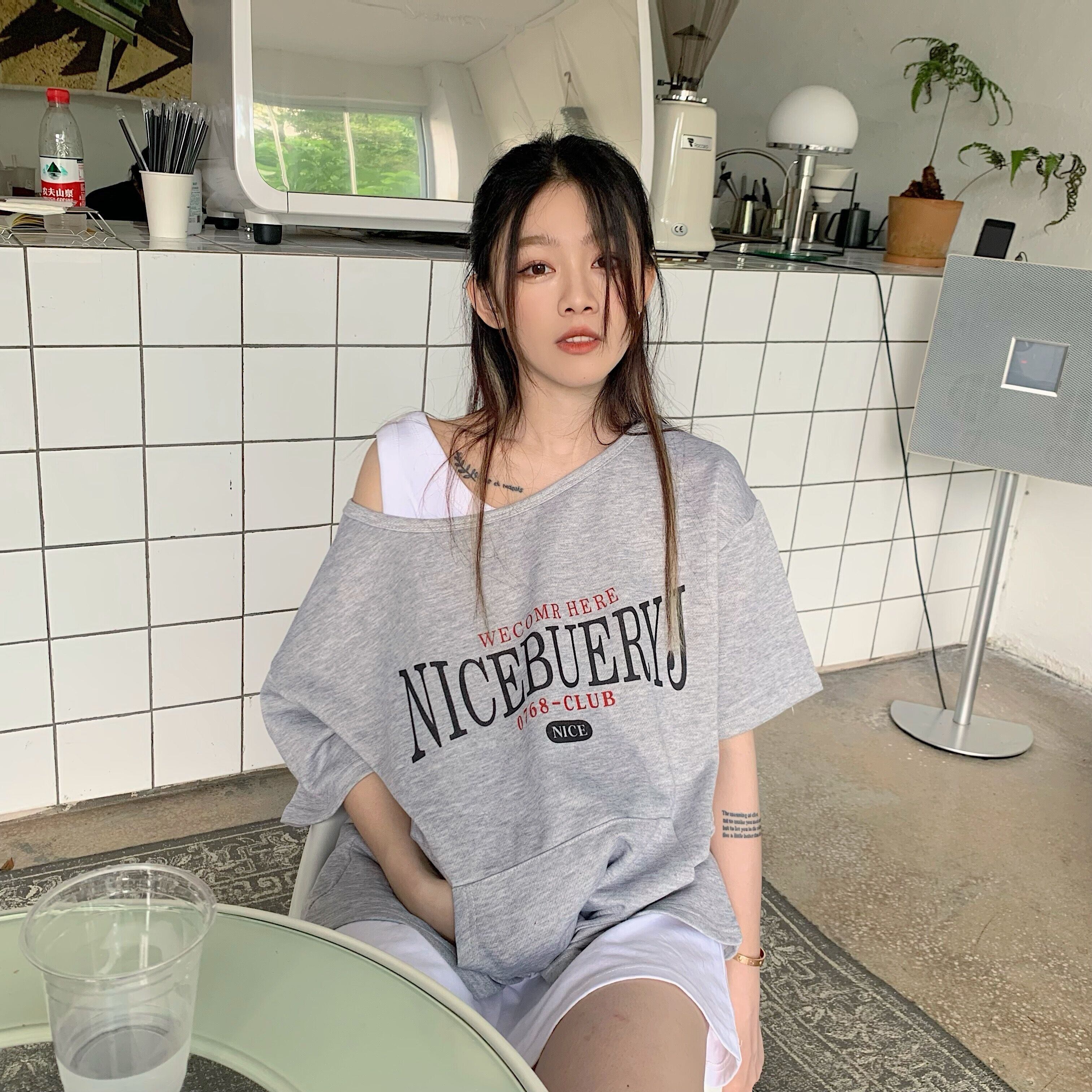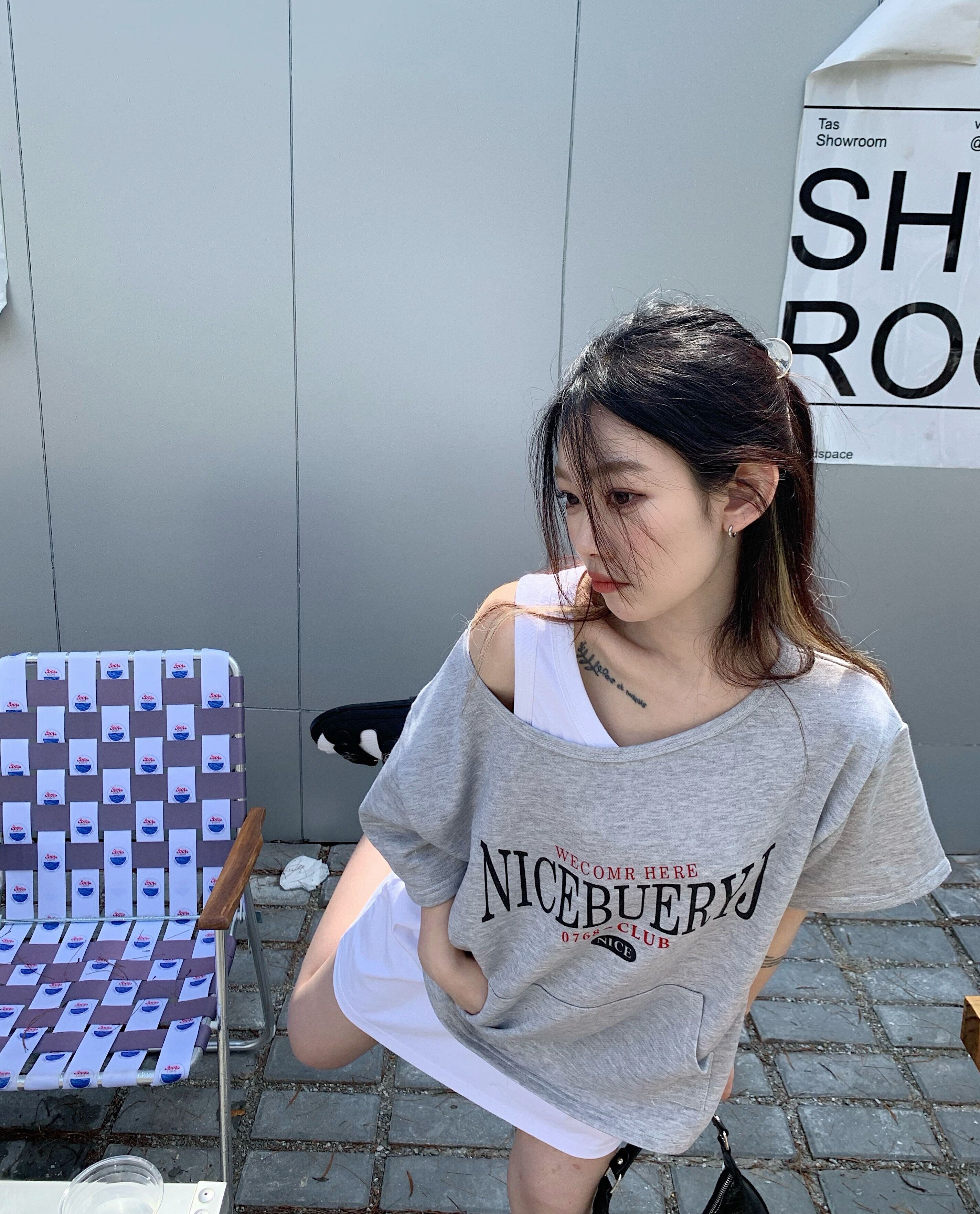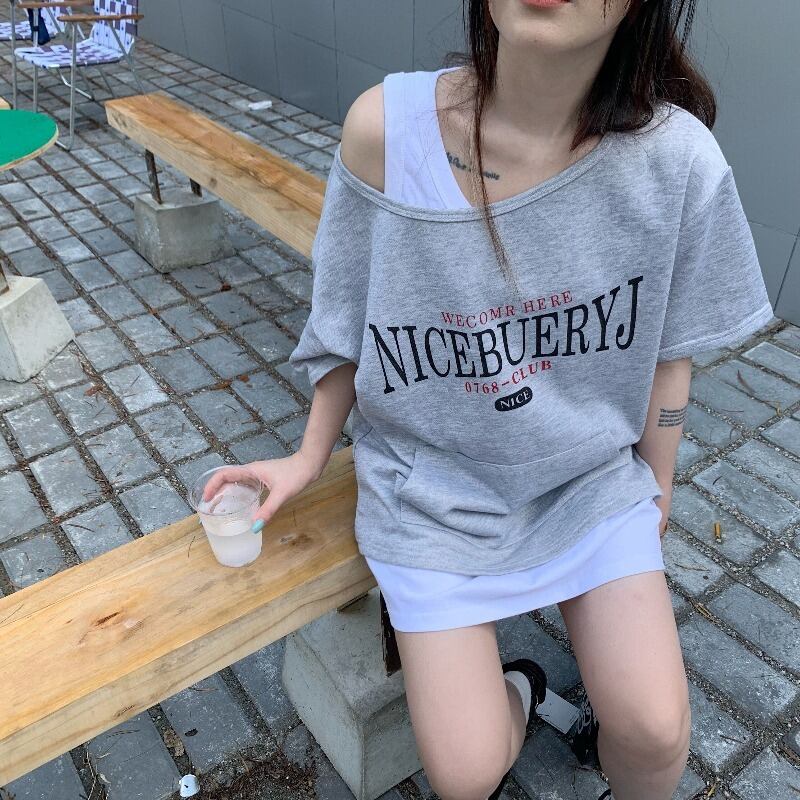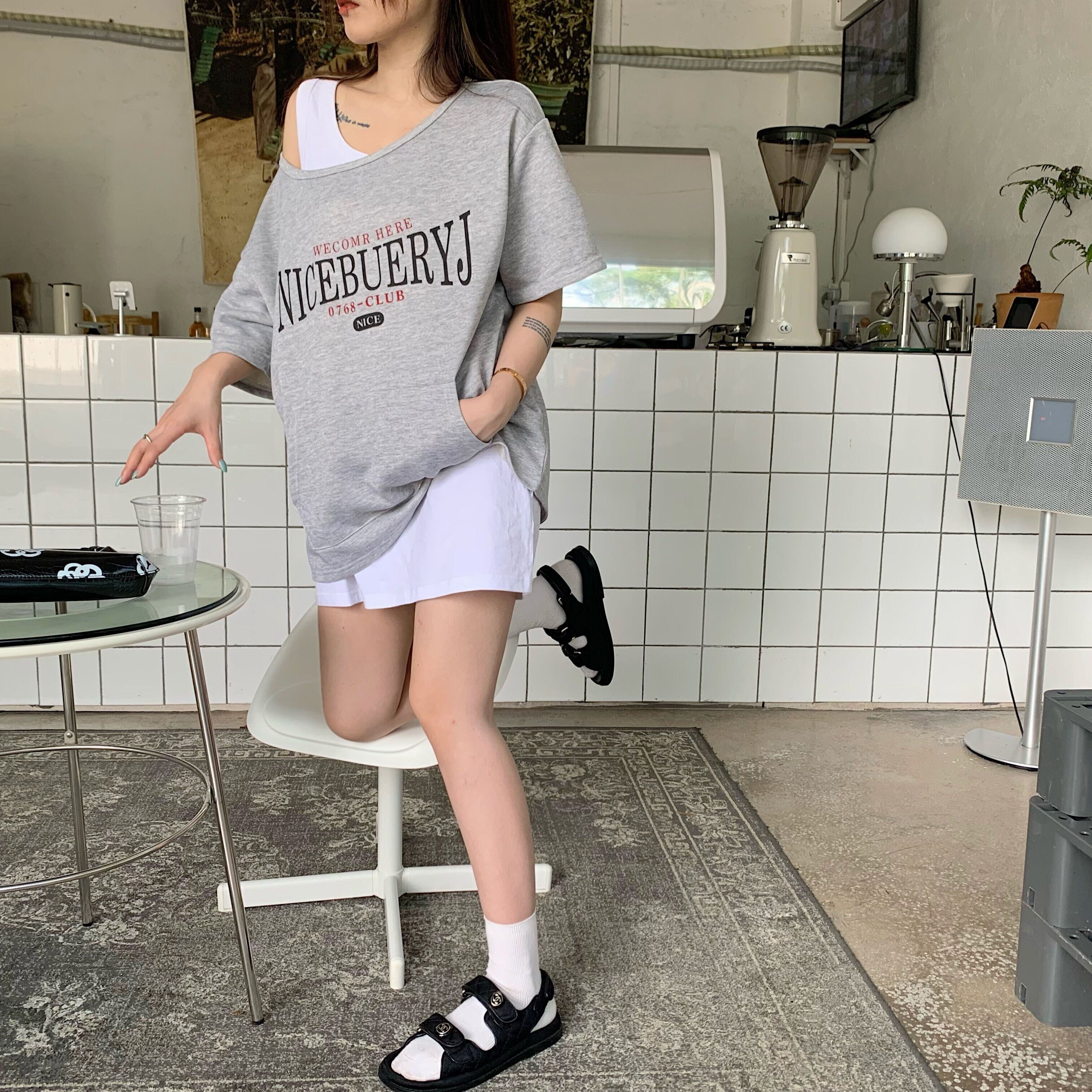色:グレーの半袖スウェットシャツ,白いインナーベスト