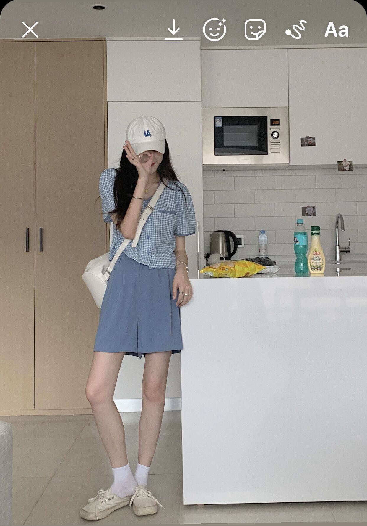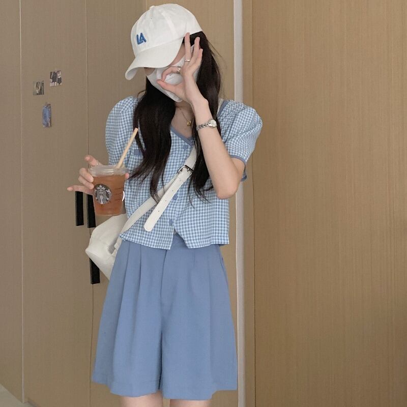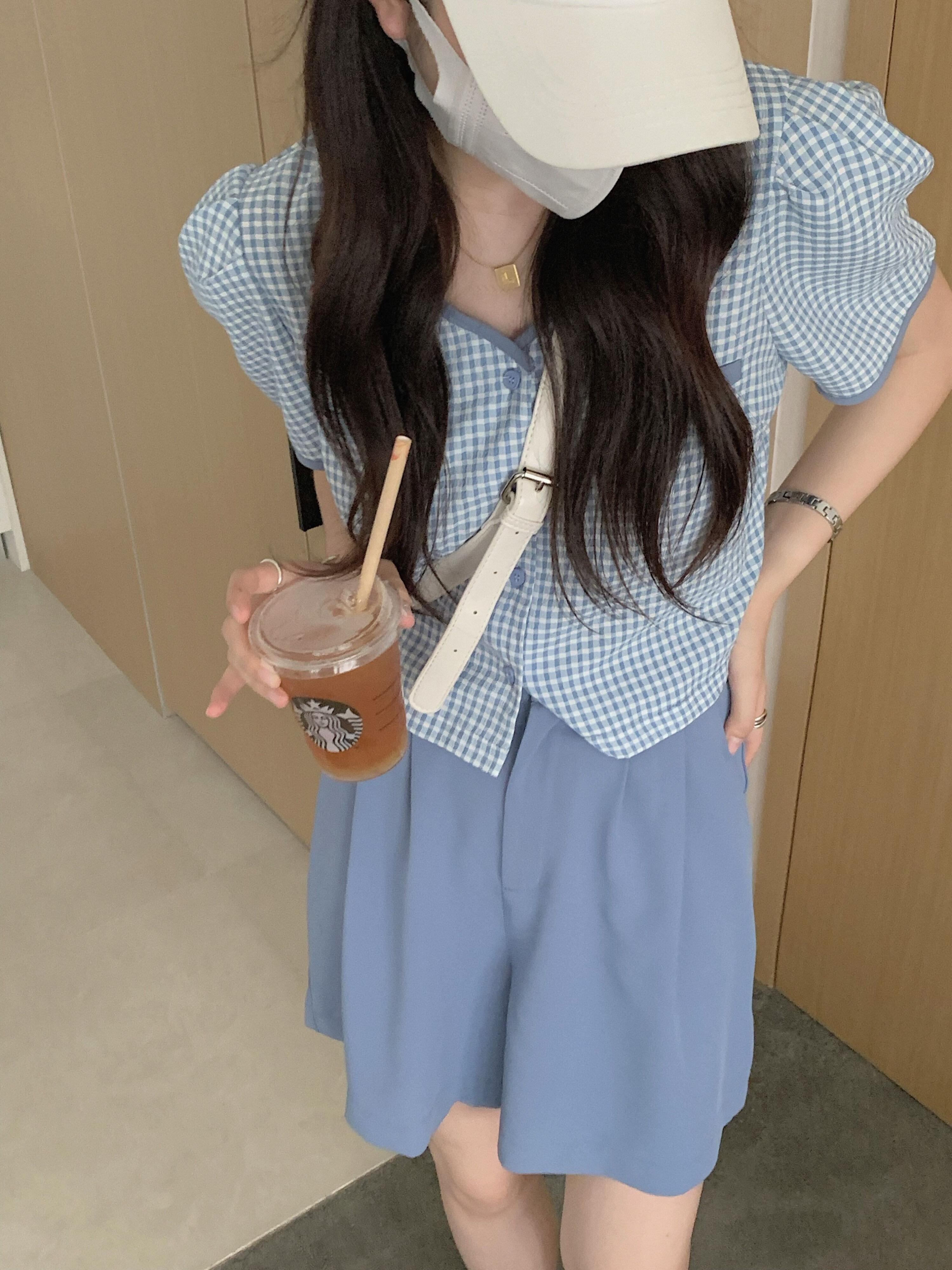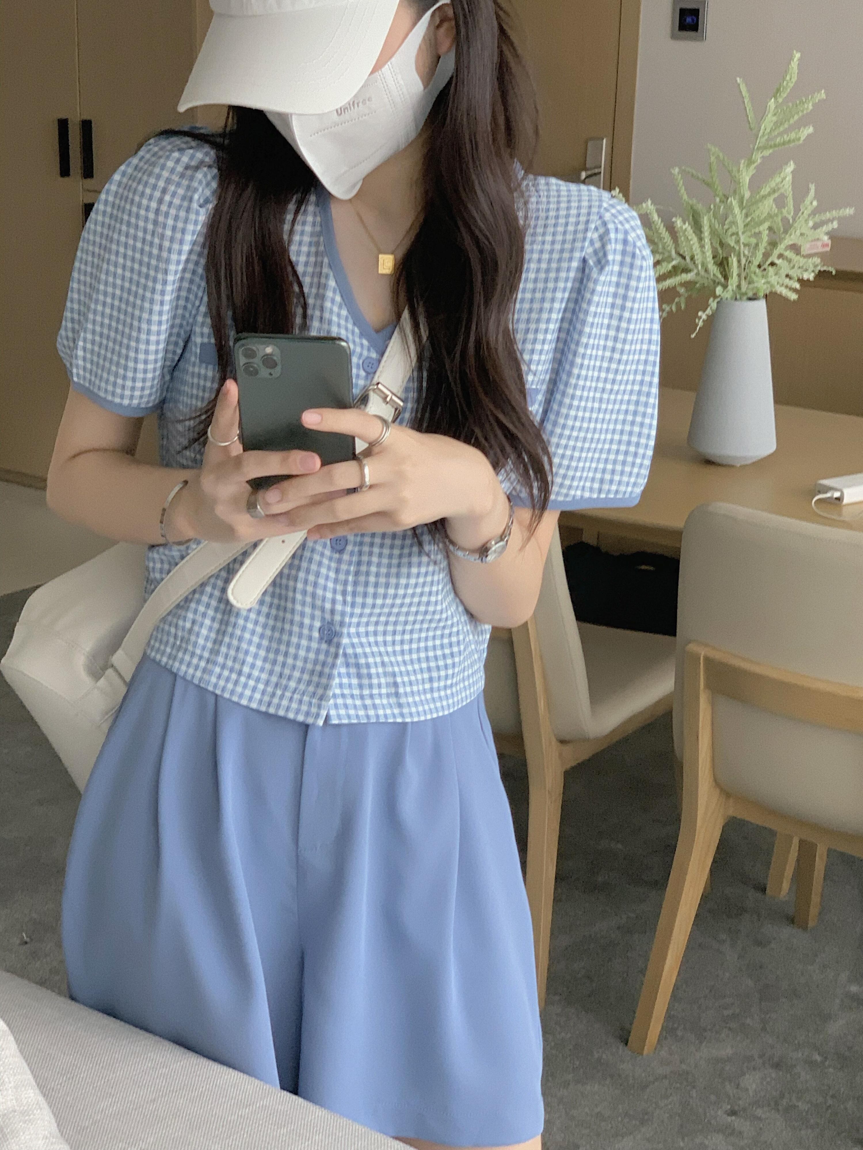 ブルーVネック格子柄スリーブシャツ サマー 夏物 モンロー95011465395