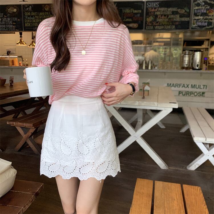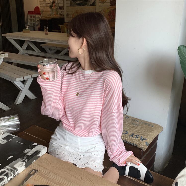 レッドルーズTシャツ サマーストライプトップス ロング 夏物 モンロー53462761494