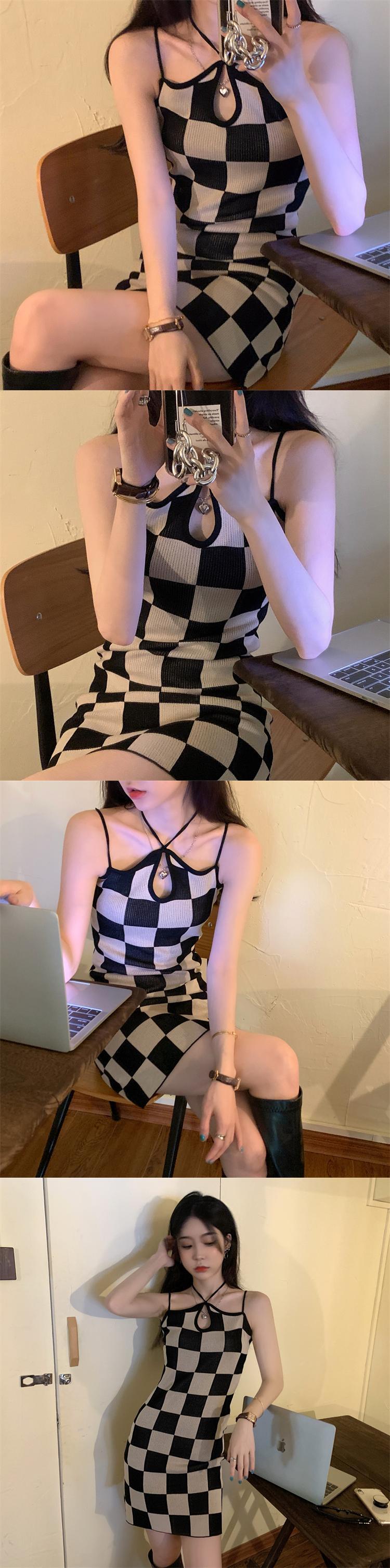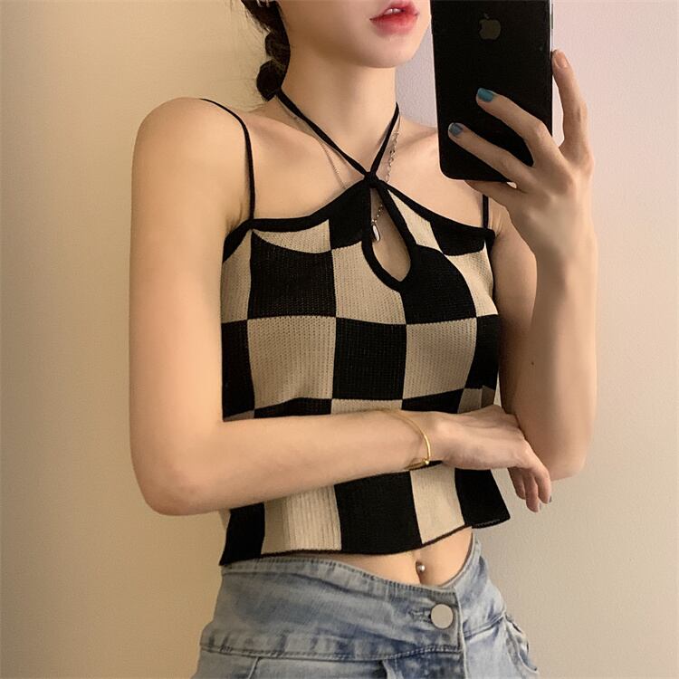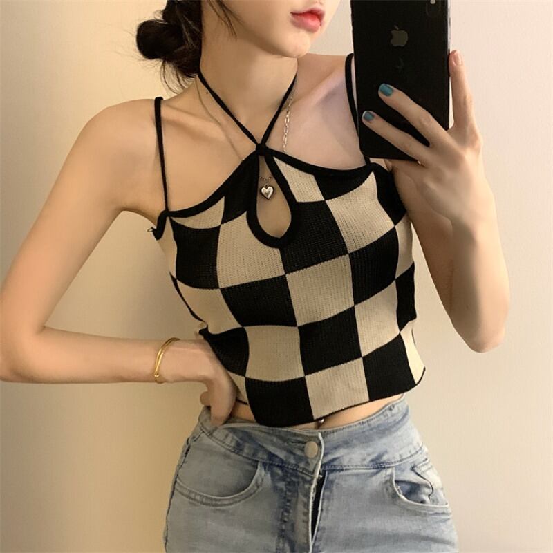 格子柄ホルターサマー薄手ショートノースリーブバックトップス 半袖 ハーフスリーブ 大人ガーリー スウィート キュート カジュアル 夏物 モンロー91334169956
