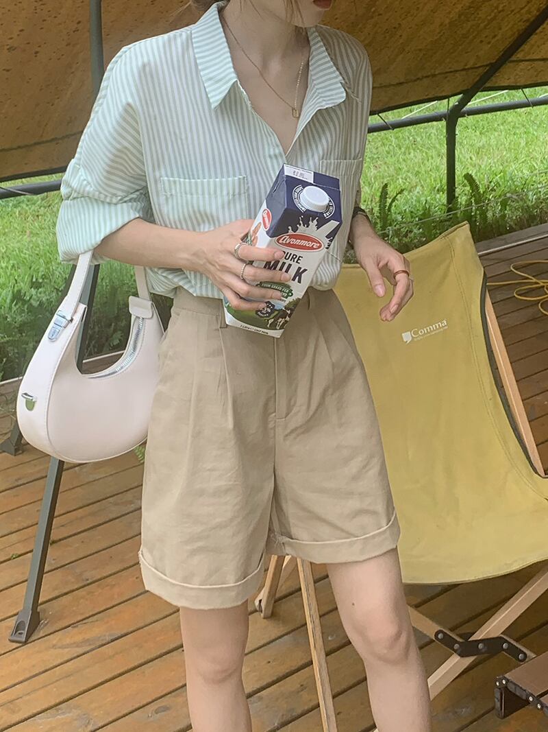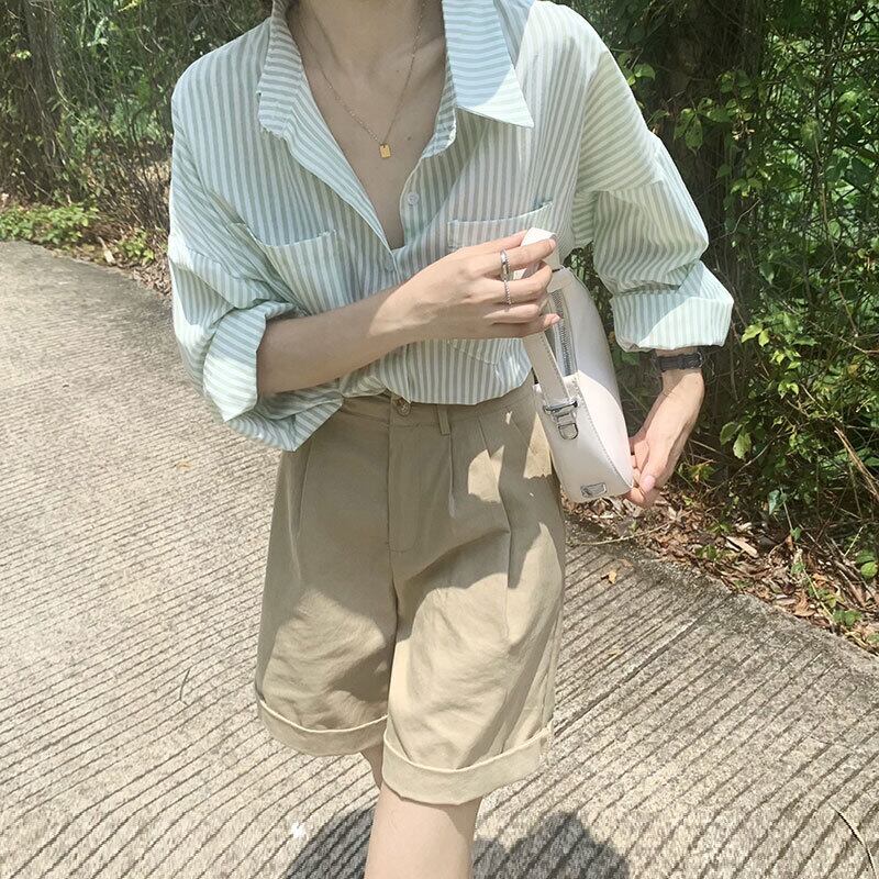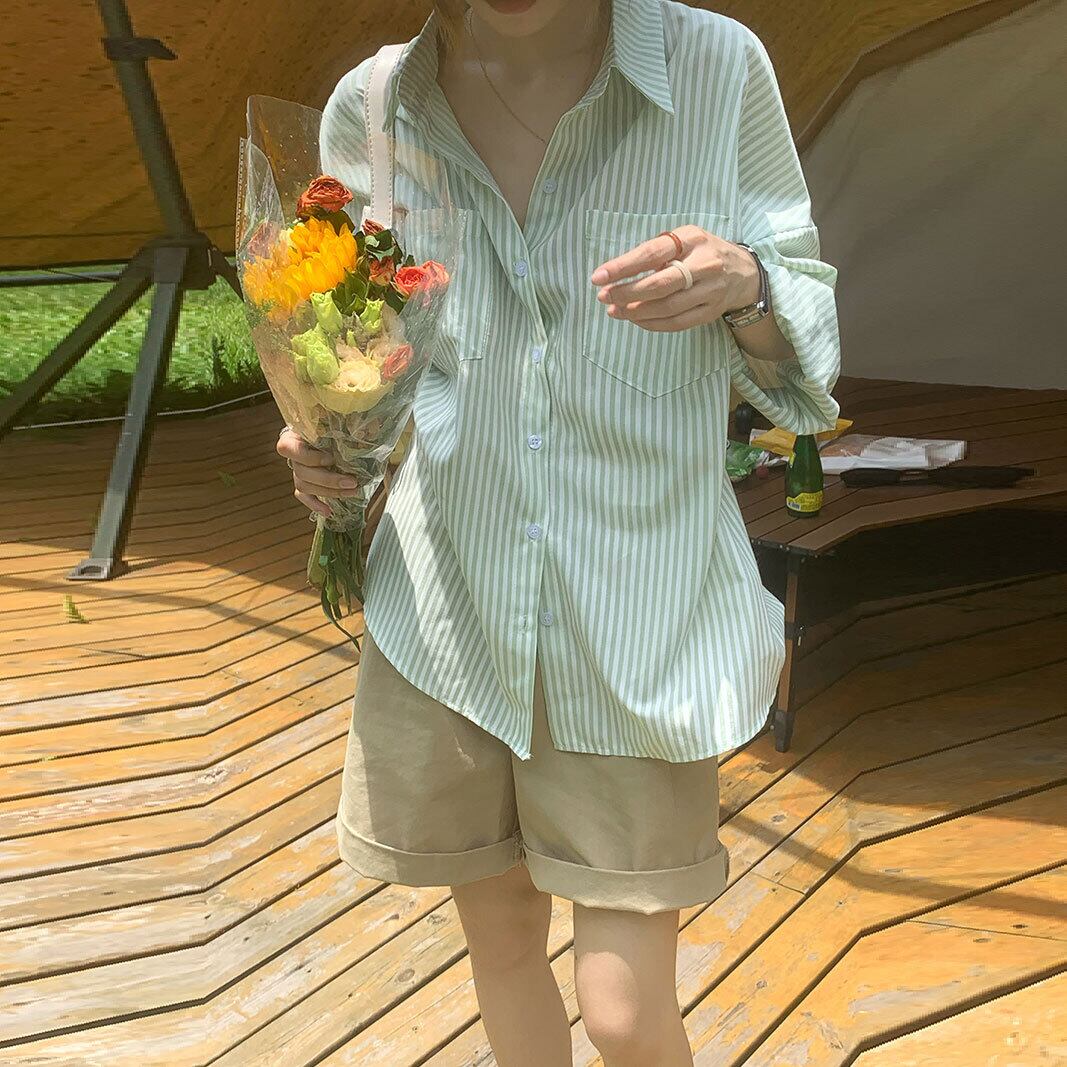 スタイルグリーンストライプシャツ ジャケット サマートップス ロング 夏物 モンロー7735529788