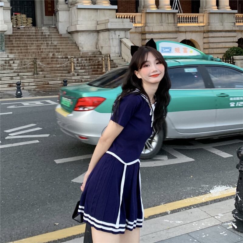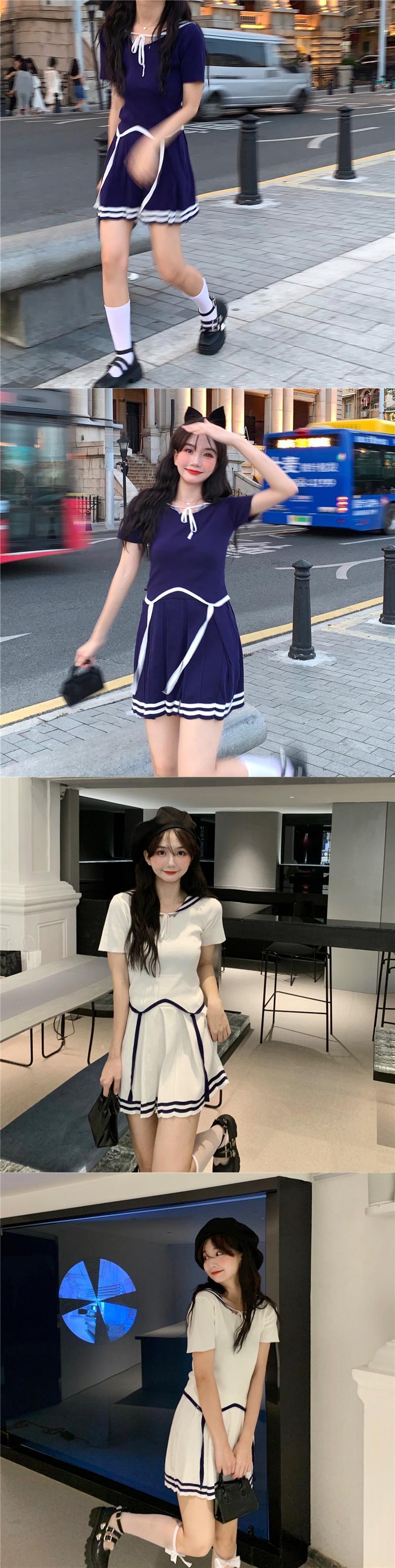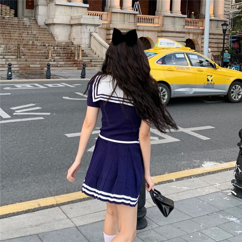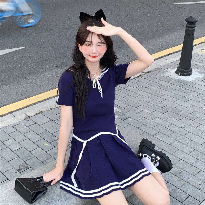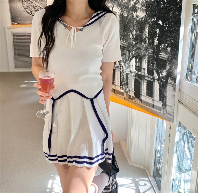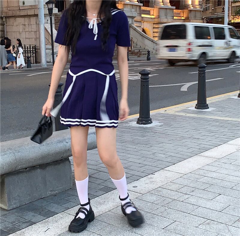 サマーネイビーカラートップス プリーツスカート ストリート 夏物 モンロー74034313122