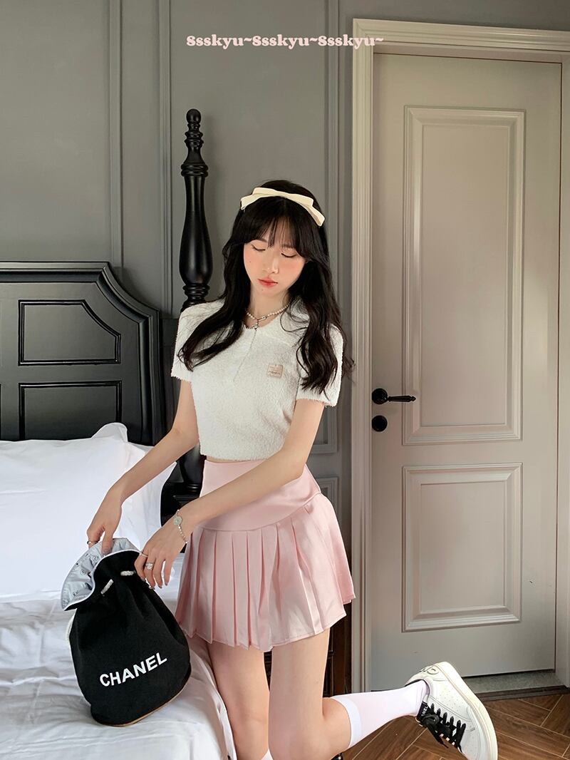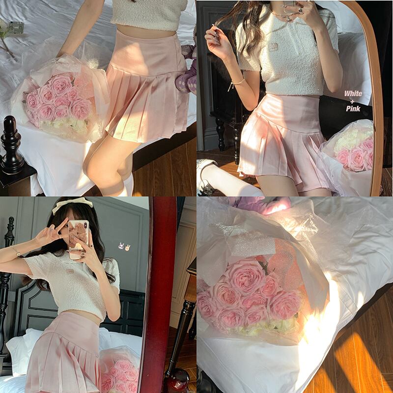 色:ベージュトップ28059,ピンクのプリーツスカート11895