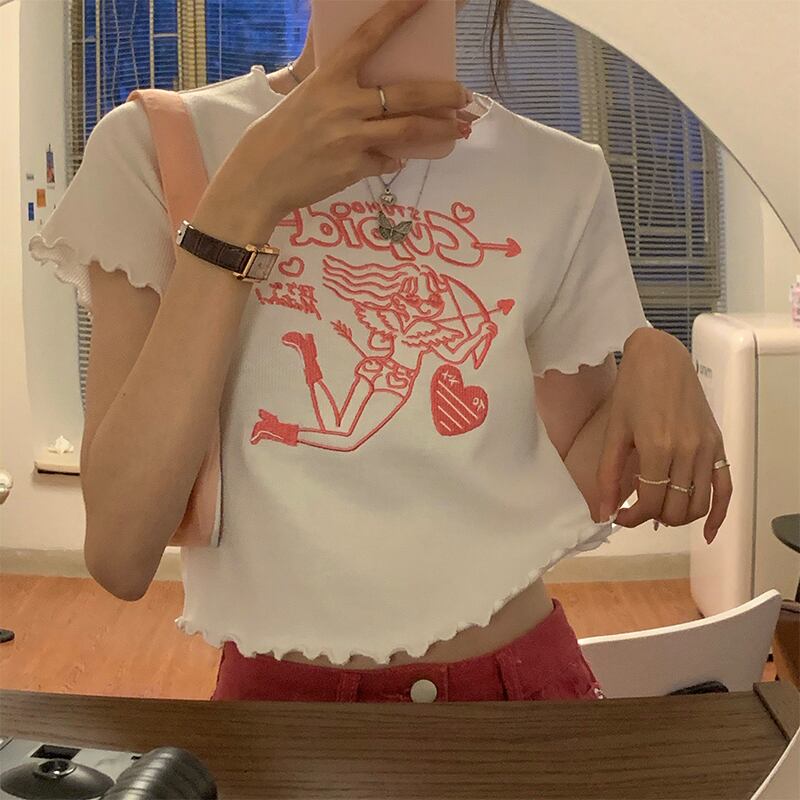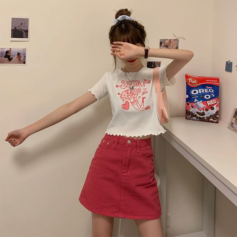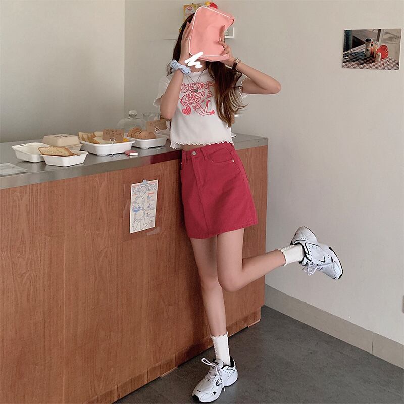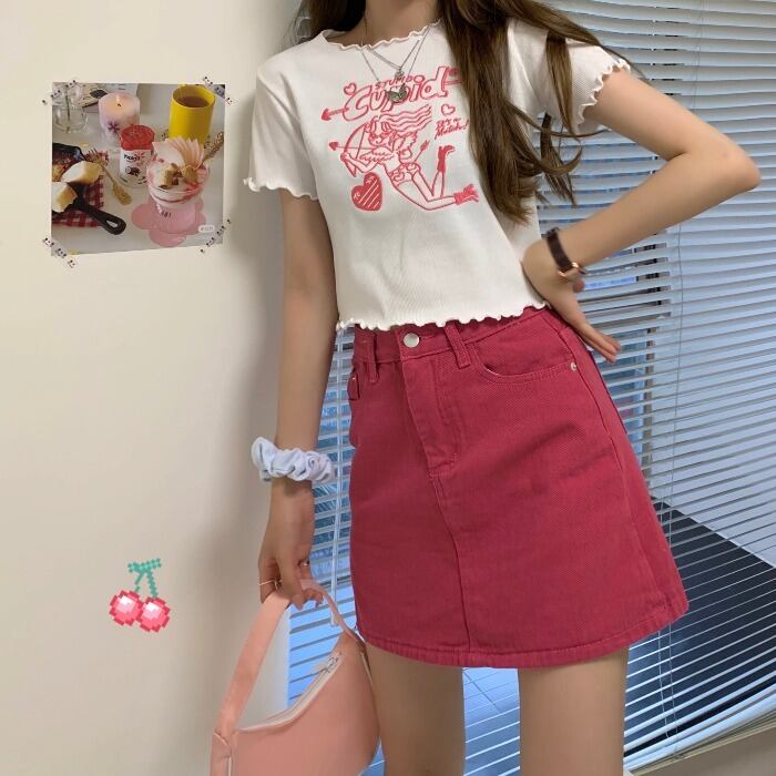 色:ホワイトTシャツ2881,赤いデニムスカート8103