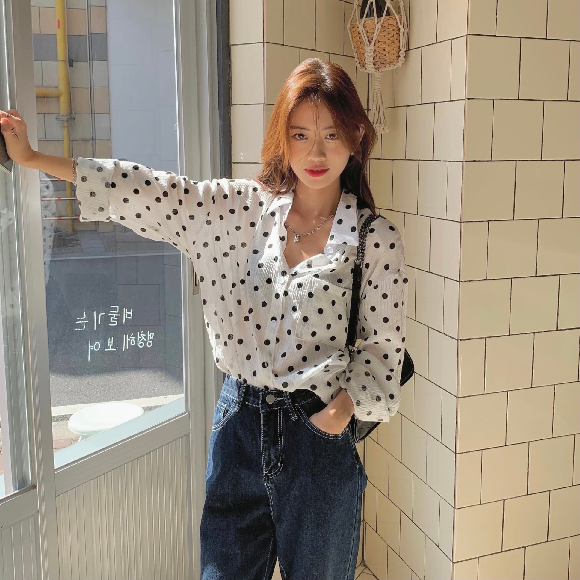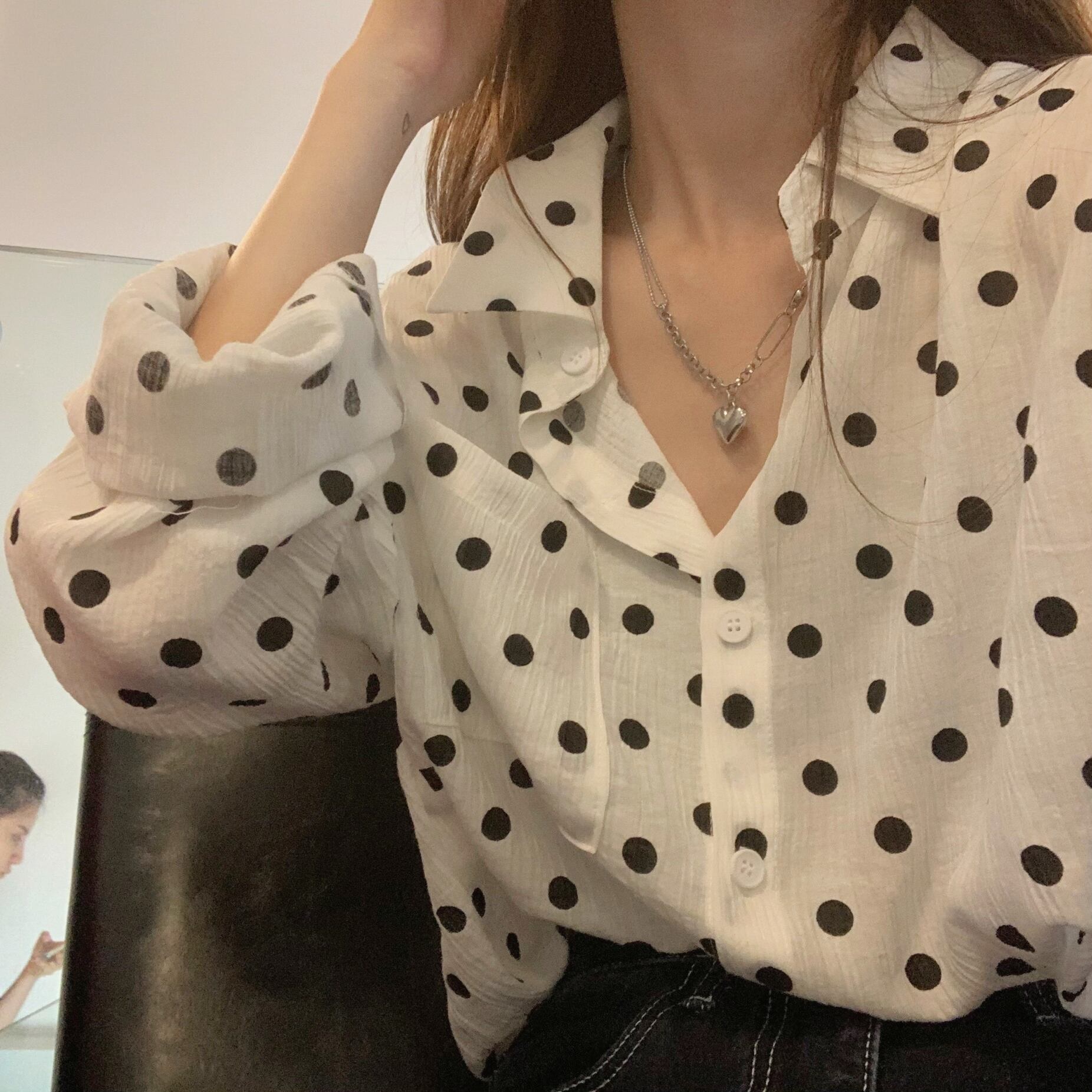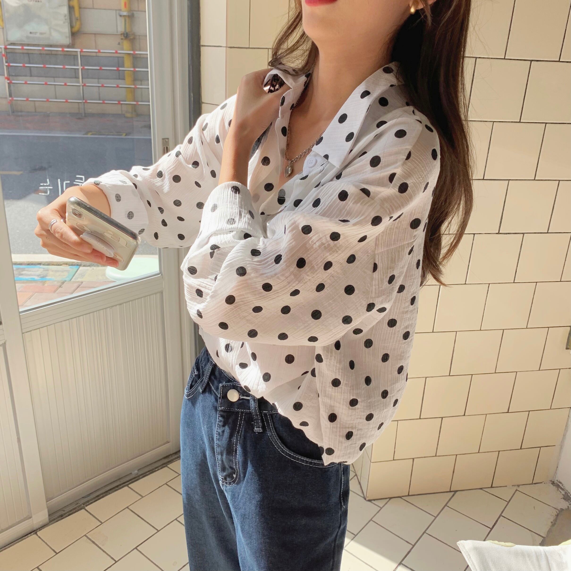 ホワイト水玉シャツ オータム薄手ジャケット サマートップス ロング 夏物 秋物 モンロー17025610687